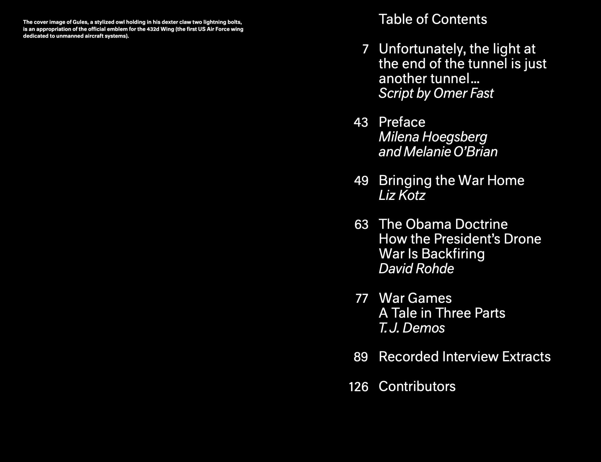 Informed by Fast’s layering of narrative and documentary material, this book compiles critical analyses of his film by art historians Liz Kotz and T. J. Demos, an article on drones reprinted from the journal Foreign Policy, as well as the artist’s research and script materials set alongside film stills. Additionally, an e-mail thread of responses from practitioners active in different fields engages a range of issues pertaining to drone warfare, opening the conversation into a forum on politics, ethics, aesthetics, and human experience.