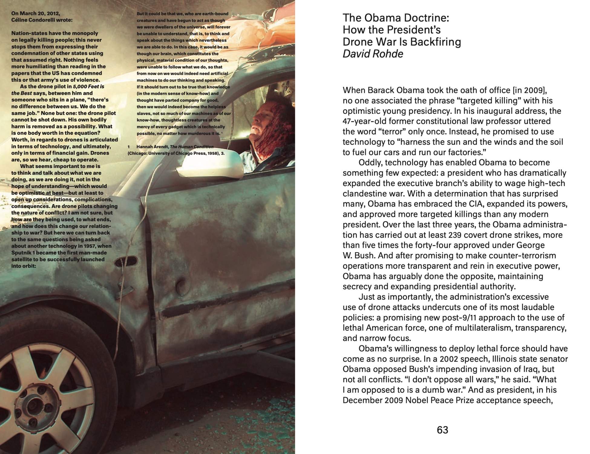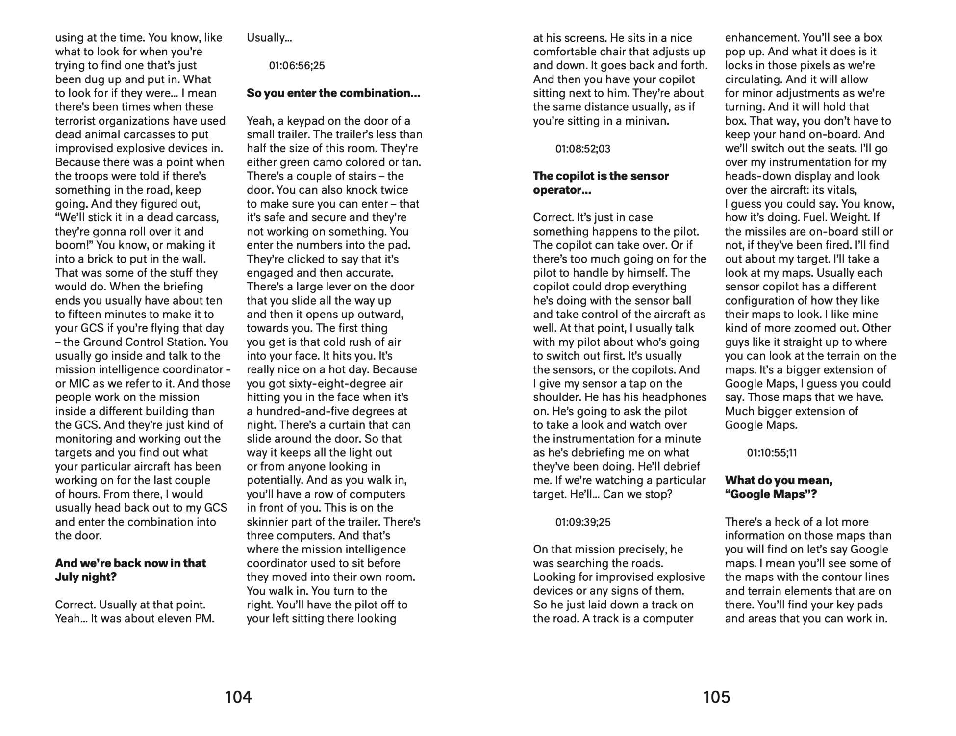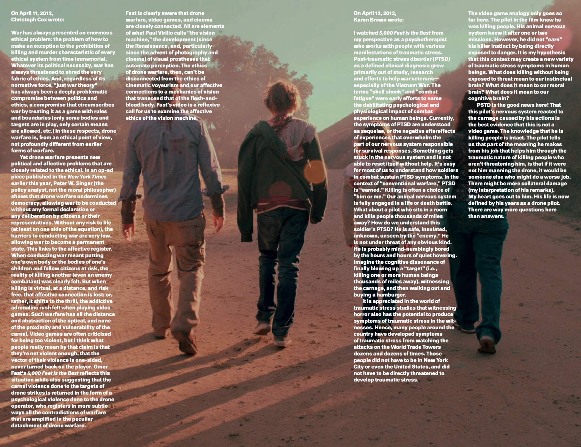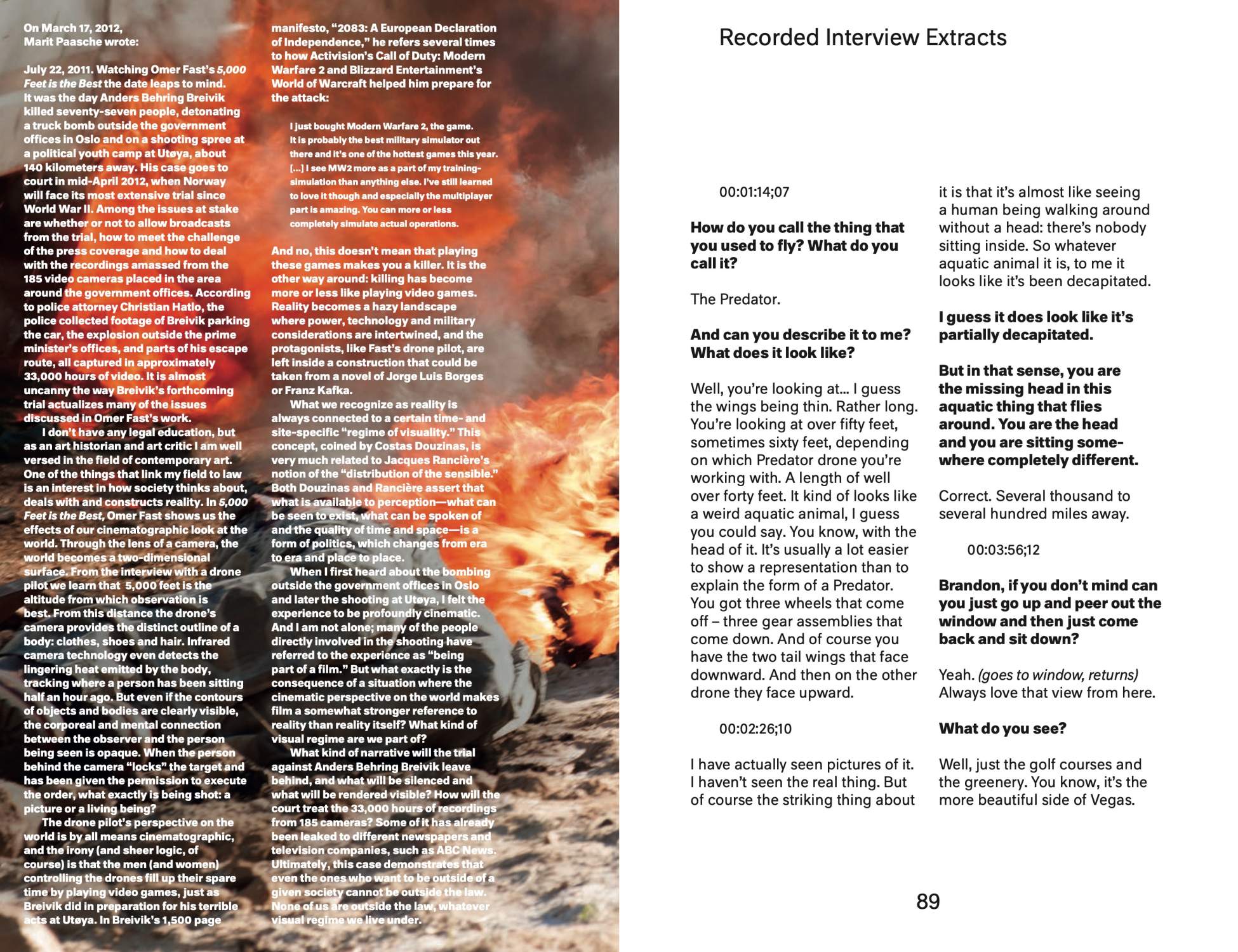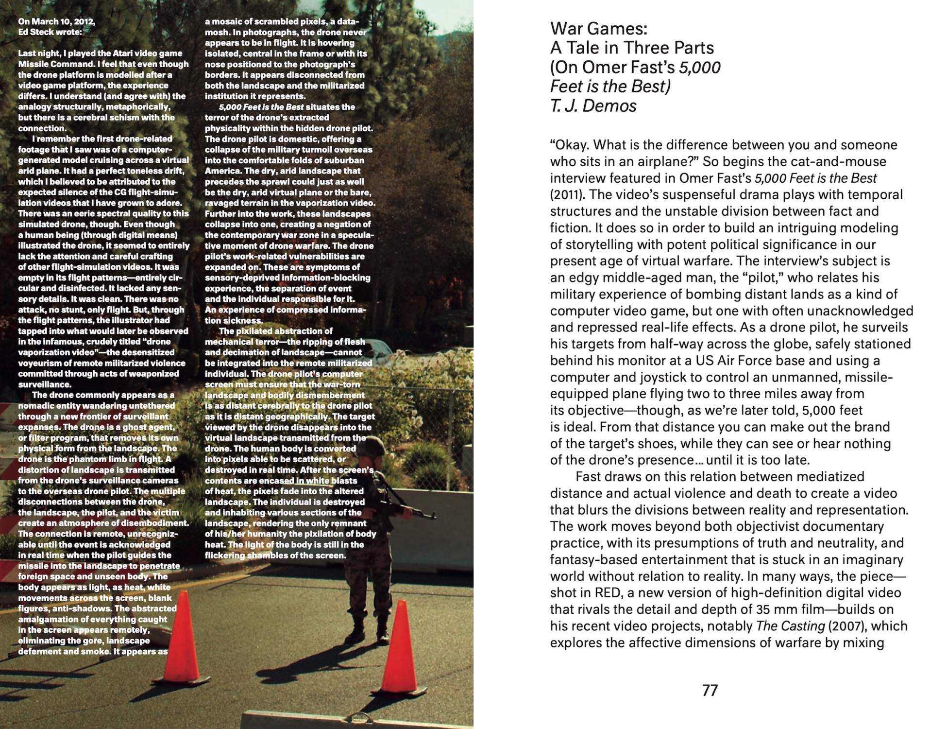 This publication focuses on a single work of art: 5,000 Feet is the Best (2011) by artist Omer Fast. With this cinematic video work, Fast has entered into a discussion about one of the most pressing issues today, namely drone surveillance and warfare—that is, the use of unmanned planes operated by “pilots” on the ground.