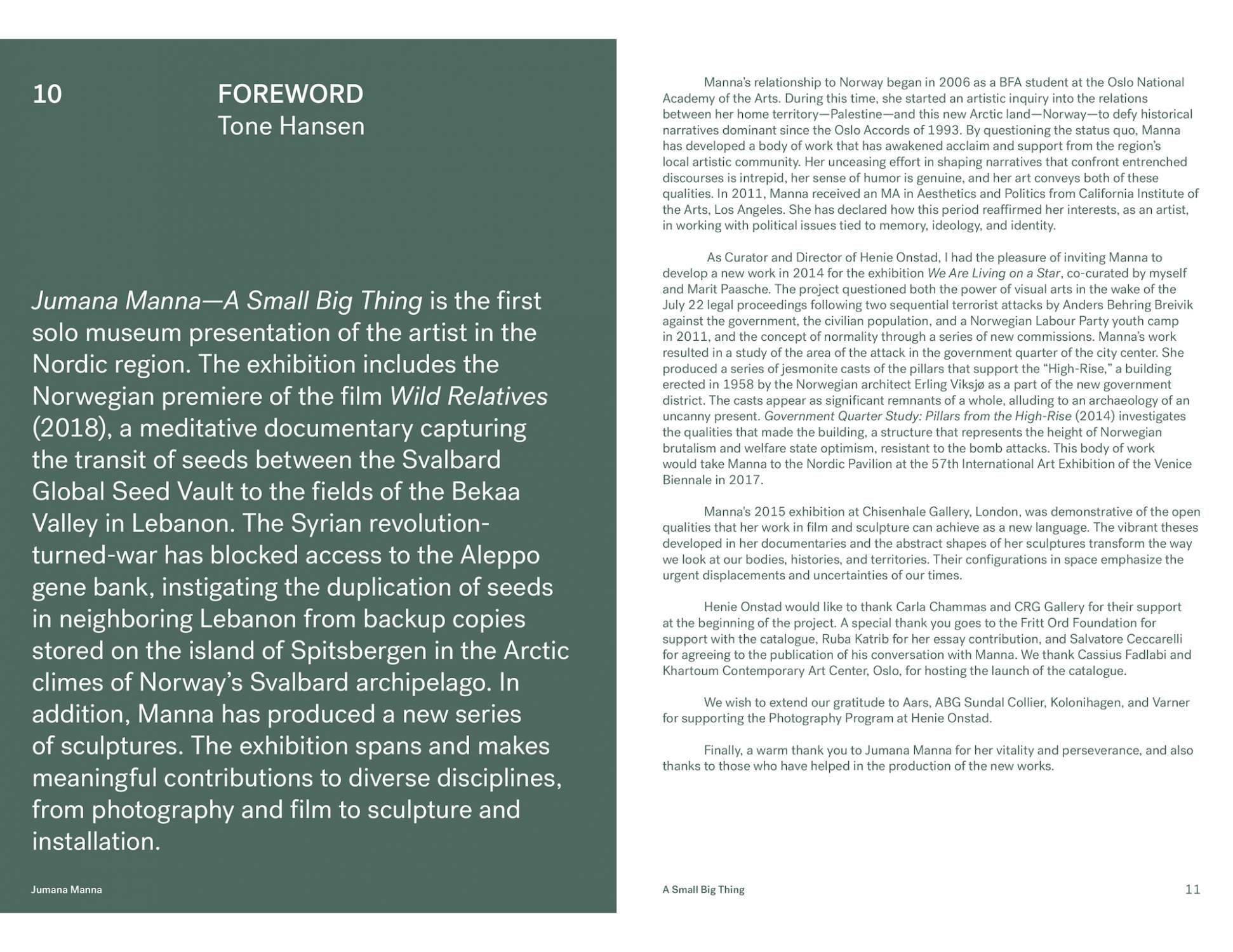 Manna was born in the United States and grew up in Jerusalem. Her relationship to Norway began in 2006 when she was a student at the Oslo National Academy of the Arts, and started an artistic inquiry into the relations between her home territory—Palestine—and this new Arctic country. Manna has developed a body of work that has received acclaim from the region’s local artistic community; in 2017, she was among the artists chosen to exhibit at the Nordic Pavilion at the 57th Venice Biennale.