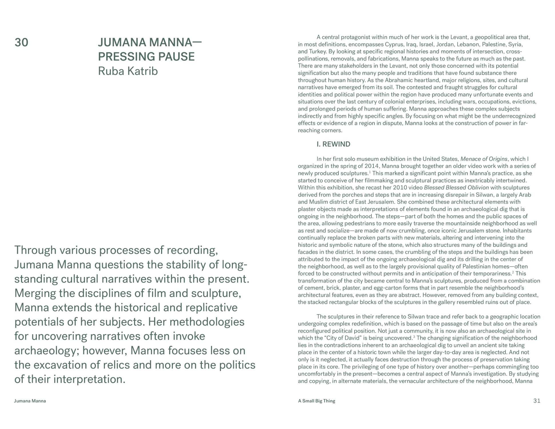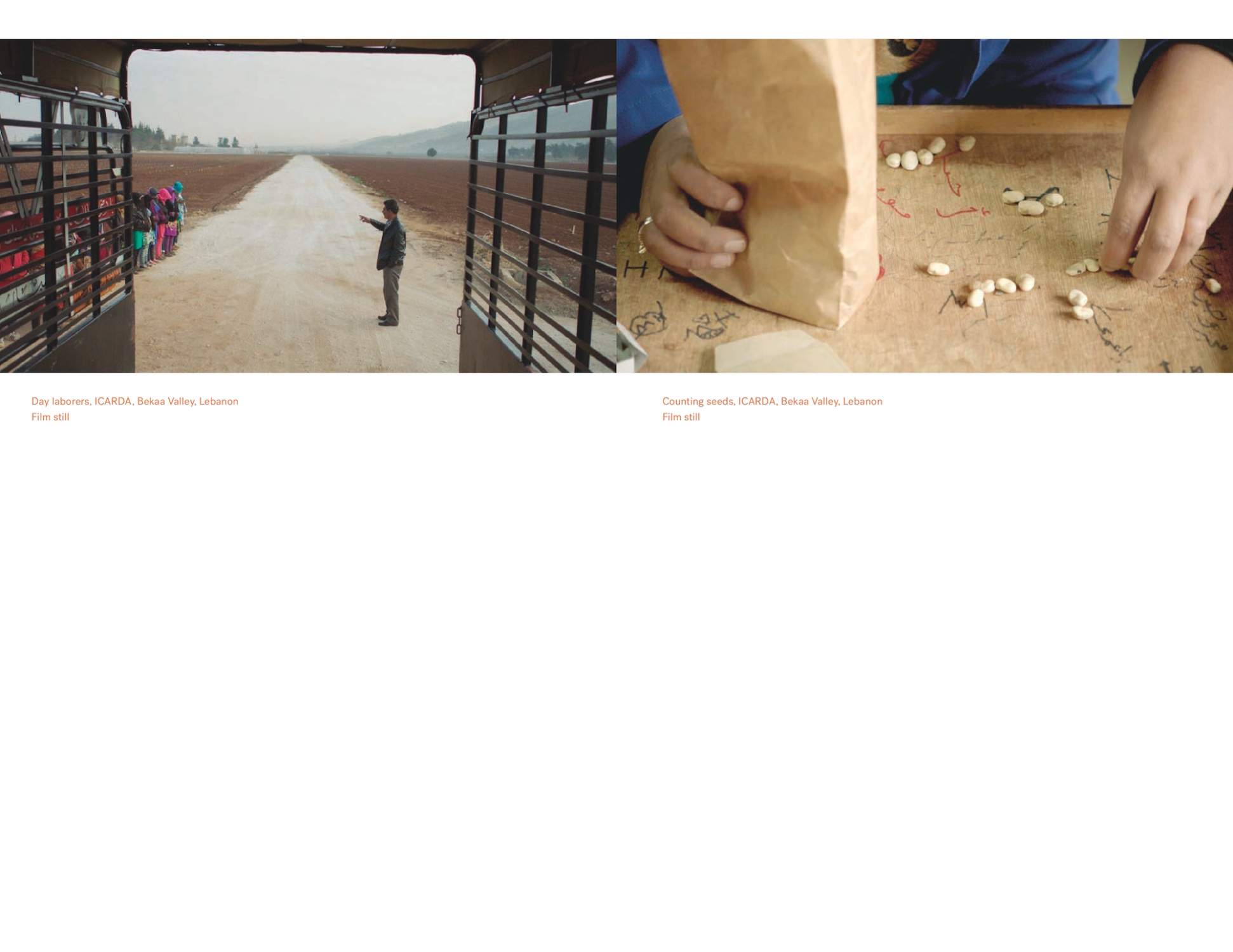 Ana María Bresciani writes about Manna’s investigations into scale and her focus on the migration of agricultural practices, regional cultures, and botanical species. Manna and the agronomist Salvatore Ceccarelli discuss the sharing of agricultural heritage and the safeguarding of the earth's vital resources as well as the cultural importance of groups that are tasked with managing and securing the biological diversity of their respective localities. An essay by curator Ruba Katrib considers Manna’s inquiry into cultural stability with regard to the ancient cultures of the Levantine, and the reigning external-environmental and social forces responsible for creating a stable culture.