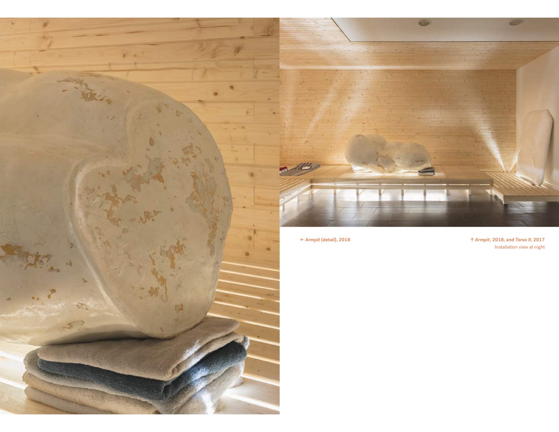 The title of the current publication reveals the various connotations of scale present in Manna’s practice. From the flat film screen to the three-dimensional space of her sculptures, scale is an instrument for Manna’s archaeological explorations of classification methods and biological processes. Included in this book are stills from the film Wild Relatives (2018), a meditative documentary capturing the transit of seeds between the Svalbard Global Seed Vault in Norway and the fields of the Bekaa Valley in Lebanon. Alongside the film are two installations that question archival practices and plant taxonomy (Cache [Insurance Policy], 2018; and Post Herbarium, 2016). The remaining two installations present the fragmented body in relation to its location (Adrenarchy, 2018; and The Contractor’s Heel, 2016).