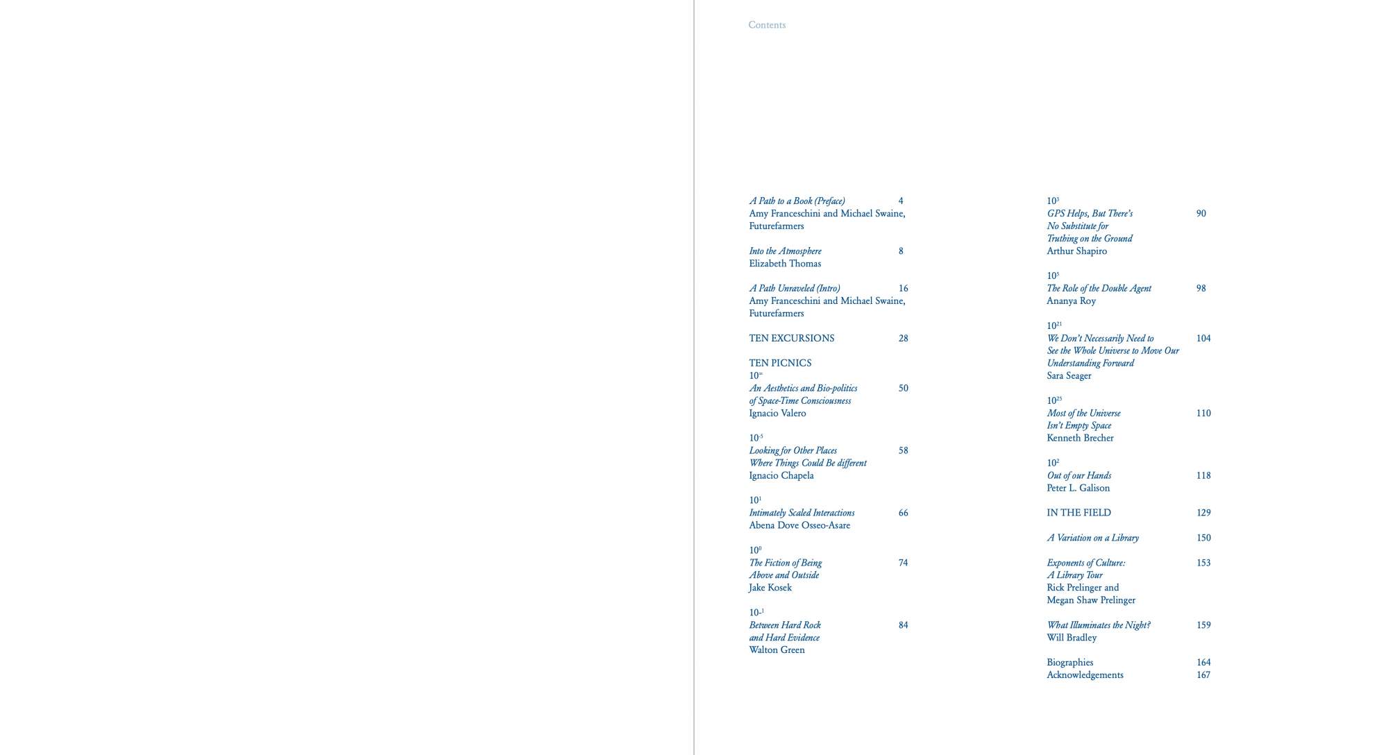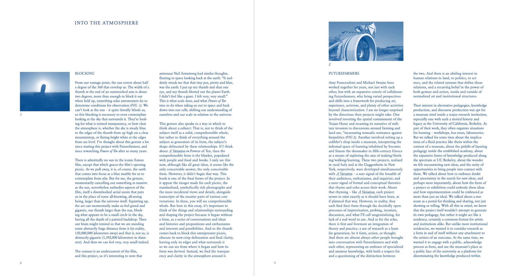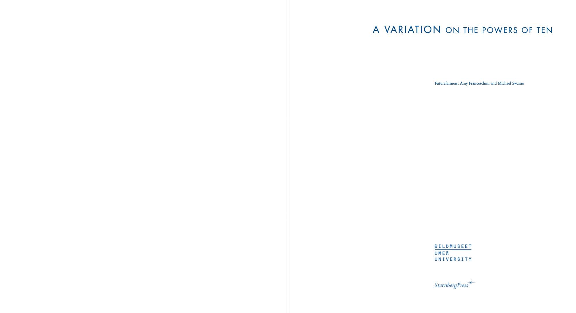 A Variation on Powers of Ten uses the opening picnic scene of Charles and Ray Eames’s film Powers of Ten as score to guide ten discussions. The result of a research-based residency at the University of California Berkeley Art Museum and Pacific Film Archive, the publication includes four essays and ten interviews with researchers whose work relates to one of the magnitudes of ten of the 1968 IBM-commissioned film. Like the stage of a microscope, the blanket becomes a stage where the act of inventorying and recording becomes the content of the work. Books, journals, food, and objects are recast and serve as cues pointing back to the film and forward to each researcher’s own work. Powers of Ten is a short documentary film that depicts the relative scale of the universe in factors of ten. It illustrates the universe as an arena of both continuity and change, of everyday picnics and cosmic mystery. One iconic image from the film depicts a couple picnicking on a blanket, serving as a human-scale grounding for the macro- and micro-explorations in the film. Looking back at the film, Futurefarmers became entranced by the presence of the narrator, Philip Morrison, the production of the film, and the short amount of time the film spends at the human scale.
