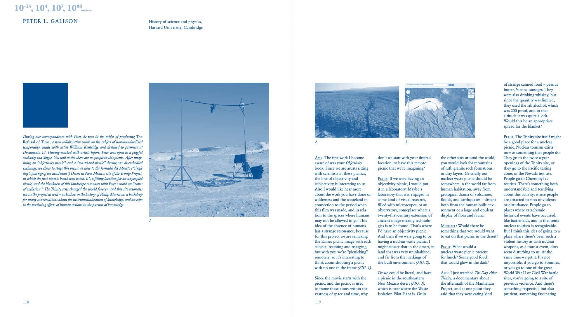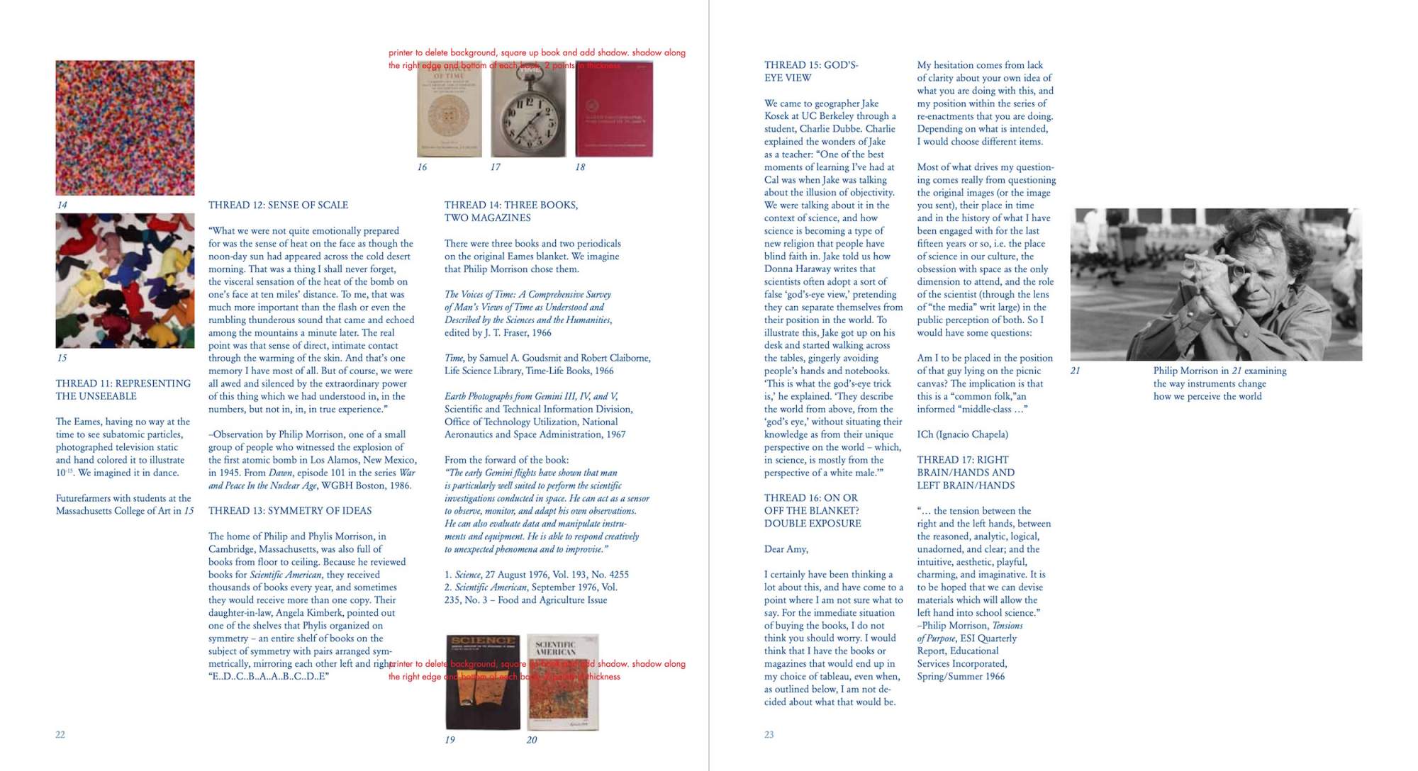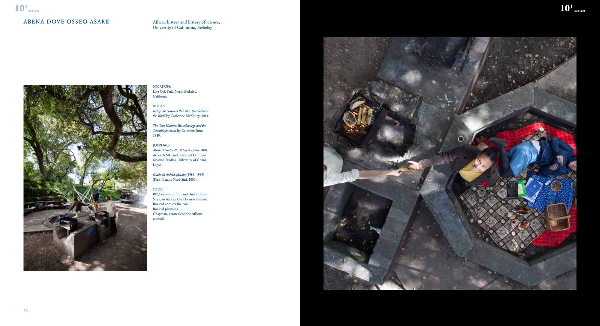 A Variation on Powers of Ten uses the opening picnic scene of Charles and Ray Eames’s film Powers of Ten as score to guide ten discussions. The result of a research-based residency at the University of California Berkeley Art Museum and Pacific Film Archive, the publication includes four essays and ten interviews with researchers whose work relates to one of the magnitudes of ten of the 1968 IBM-commissioned film. Like the stage of a microscope, the blanket becomes a stage where the act of inventorying and recording becomes the content of the work. Books, journals, food, and objects are recast and serve as cues pointing back to the film and forward to each researcher’s own work. Powers of Ten is a short documentary film that depicts the relative scale of the universe in factors of ten. It illustrates the universe as an arena of both continuity and change, of everyday picnics and cosmic mystery. One iconic image from the film depicts a couple picnicking on a blanket, serving as a human-scale grounding for the macro- and micro-explorations in the film. Looking back at the film, Futurefarmers became entranced by the presence of the narrator, Philip Morrison, the production of the film, and the short amount of time the film spends at the human scale.