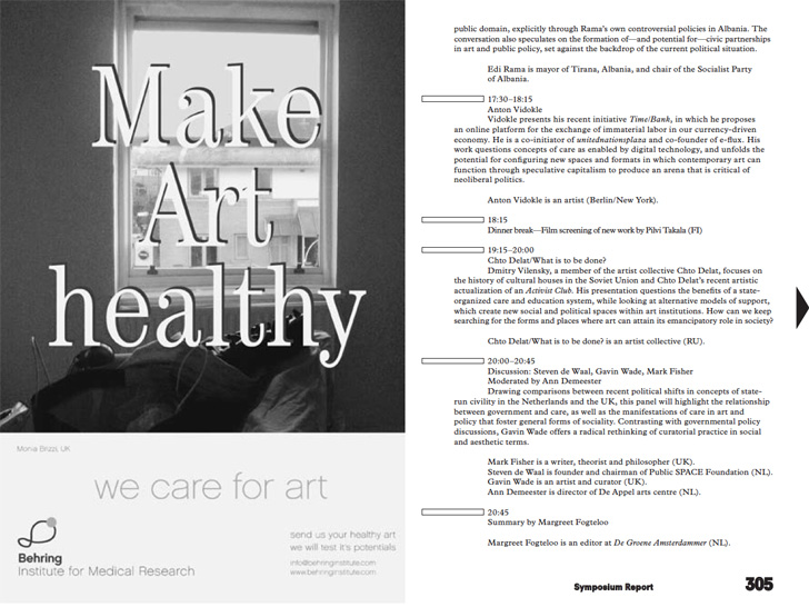 Caring Culture: Art, Architecture and the Politics of Public Health examines changing political uses of the concept of care in neoliberal democracies and asks how artists, architects, and designers both contribute to and attempt to critique its social manifestations. The publication brings together case studies of artistic and design interventions within health and social care institutions and broader political and philosophical essays and interviews relating to civic wellbeing. Contributors include curators, artists, politicians, architects, and healthcare professionals.