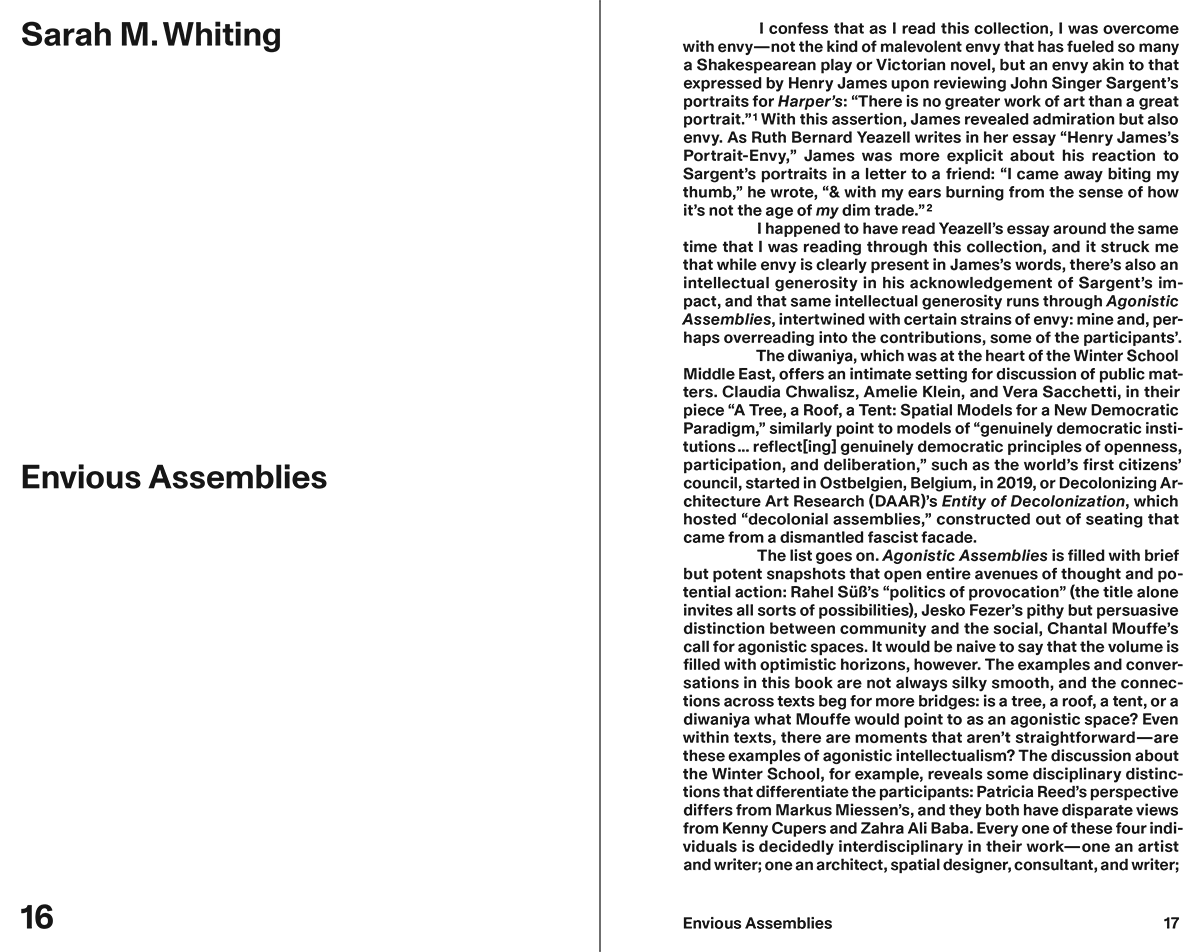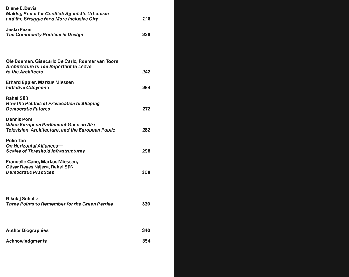 “Forums condition the speech acts delivered within them. This, as this book shows, is an architectural question: the arrangement of space bodies and media enable multiple potential speech acts; but each forum crucially also limits what can be said and done. Constraints, protocol, and process leave things unnoticed unheard, and thus left out of politics. This is perhaps the more crucial architectural question: this book calls for a set of spatial performances that can generate a rupture and with it expand our political imagination.”