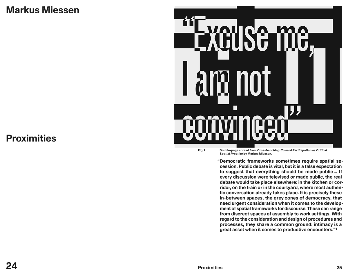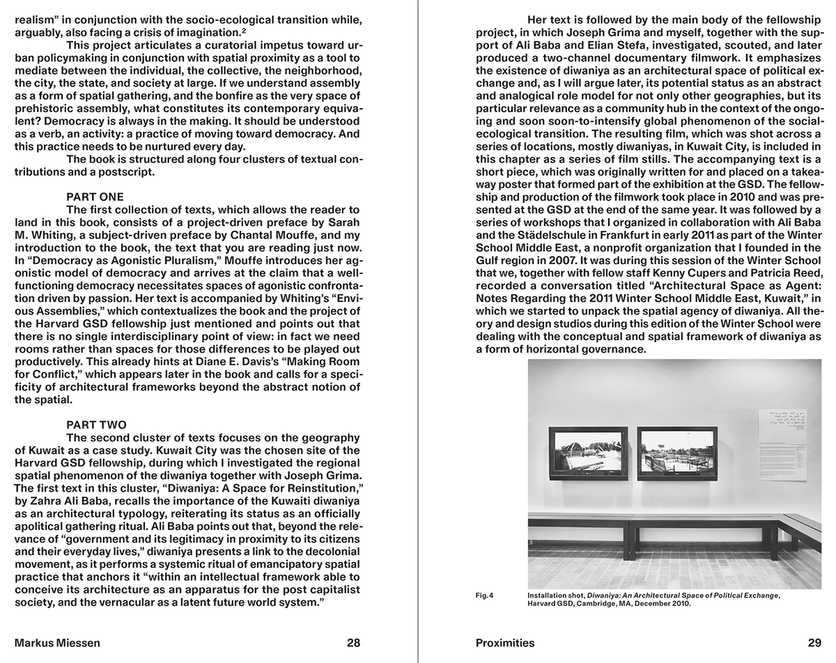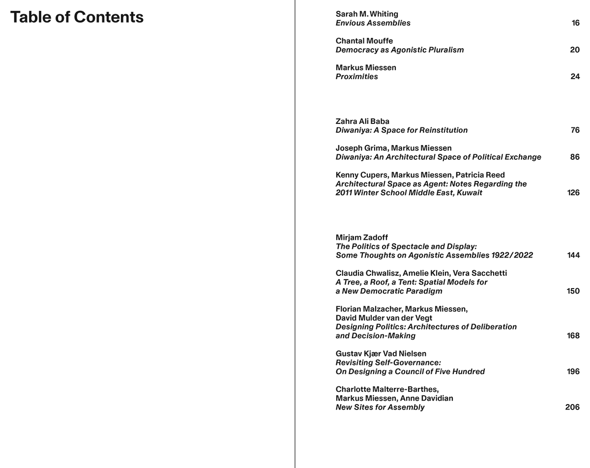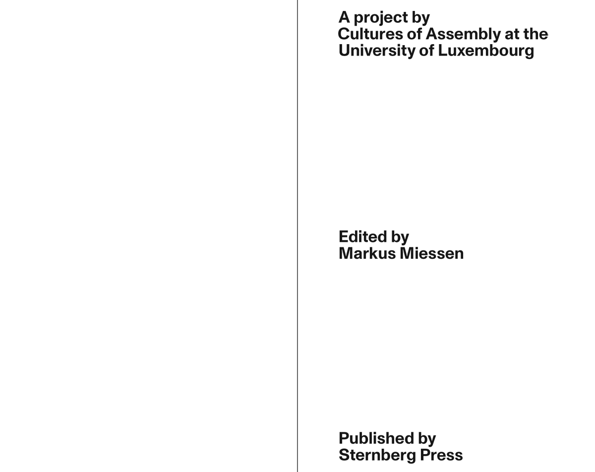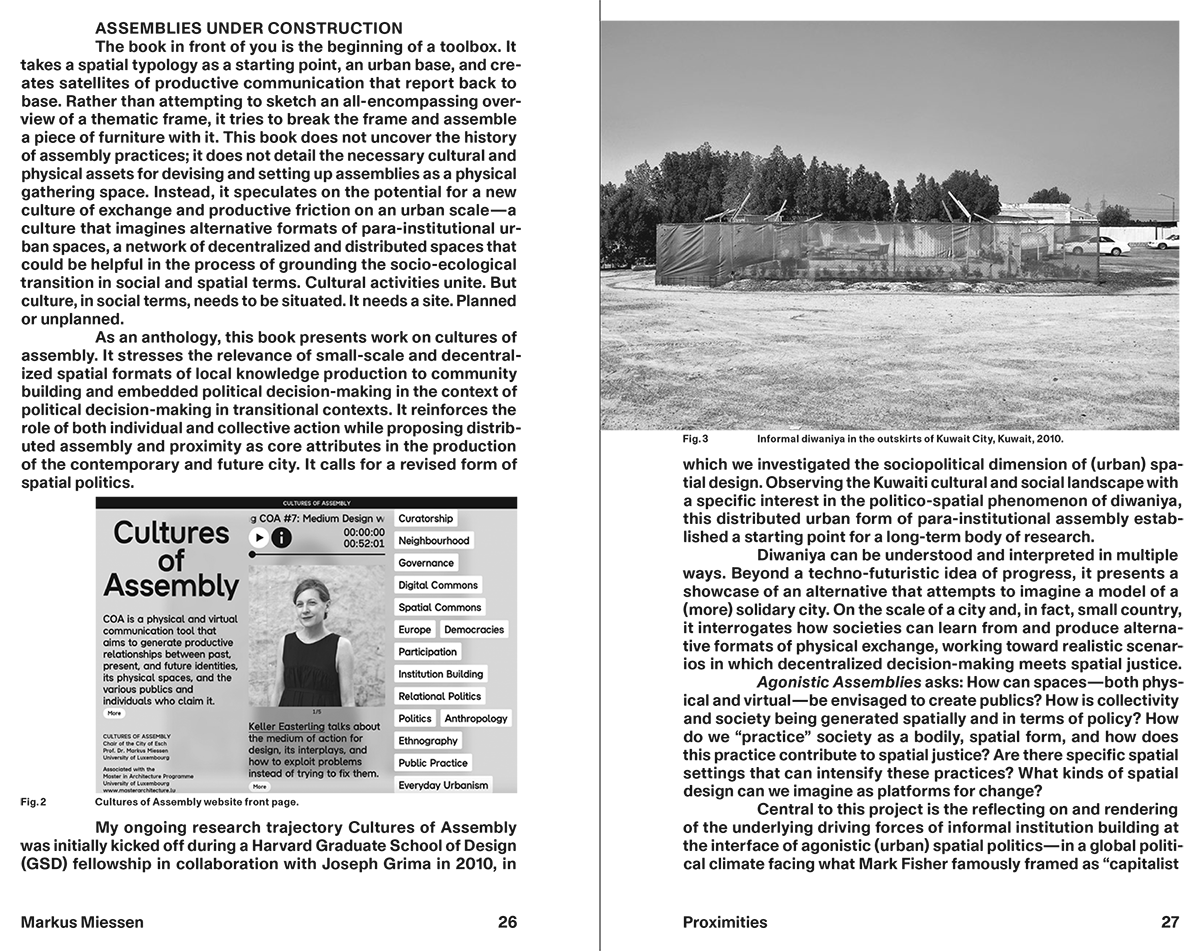 Miessen’s ongoing research trajectory Cultures of Assembly was initially kicked off during a Harvard GSD fellowship in collaboration with Joseph Grima, in which the two architects investigated the sociopolitical dimension of (urban) spatial design. Observing the Kuwaiti cultural and social landscape with a specific interest in the politico-spatial phenomenon of Diwaniya, this distributed urban form of para-institutional assembly established a starting point for a long-term body of research.
