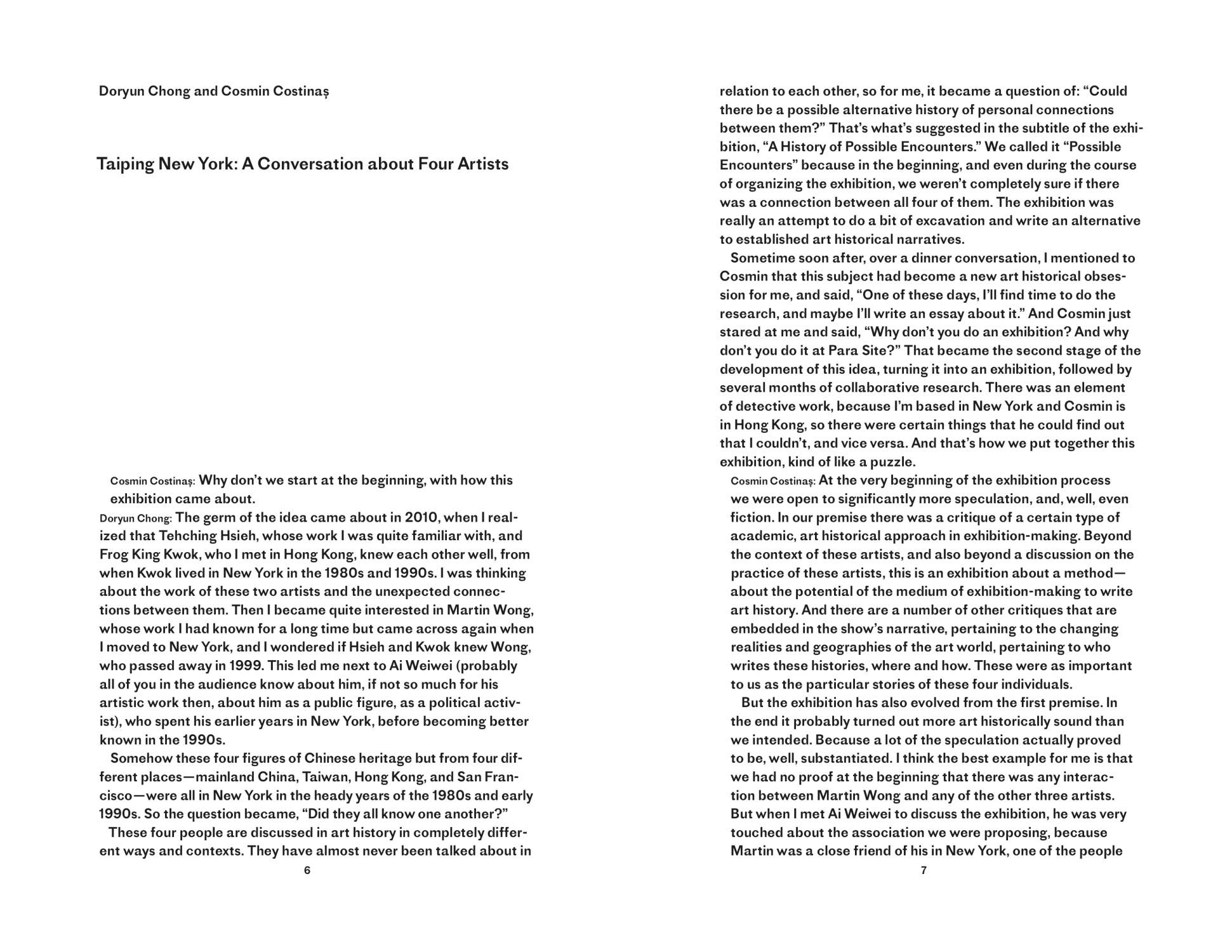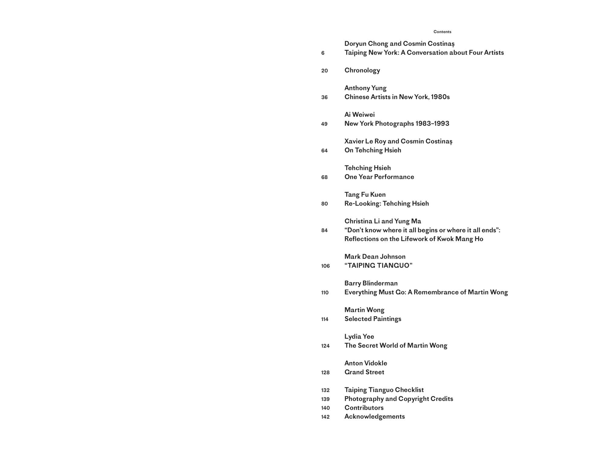“Taiping Tianguo: A History of Possible Encounters,” a touring exhibition organized by Para Site, Hong Kong, began as a series of questions: How did Ai Weiwei, Frog King Kwok, Tehching Hsieh, and Martin Wong—four artists of Chinese heritage hailing from mainland China, Hong Kong, Taiwan, and San Francisco, respectively—all end up in New York in the heady 1980s? Did they know one another? By considering them together, what might we learn about their practices and the storied time and place in art history? With nuanced glimpses of the artists’ overlapping experiences, networks, and friendships, this book makes a unique contribution to a critical reading not only of New York art of the 1980s, but also of nascent contemporary Chinese art in the advent of the globalization of the art world.
