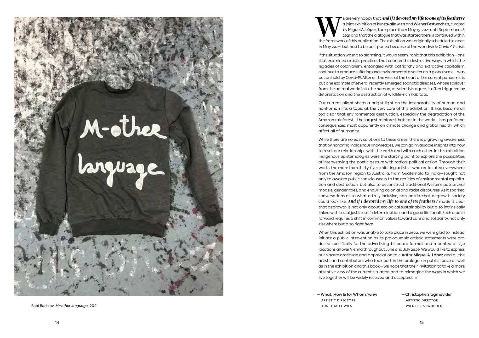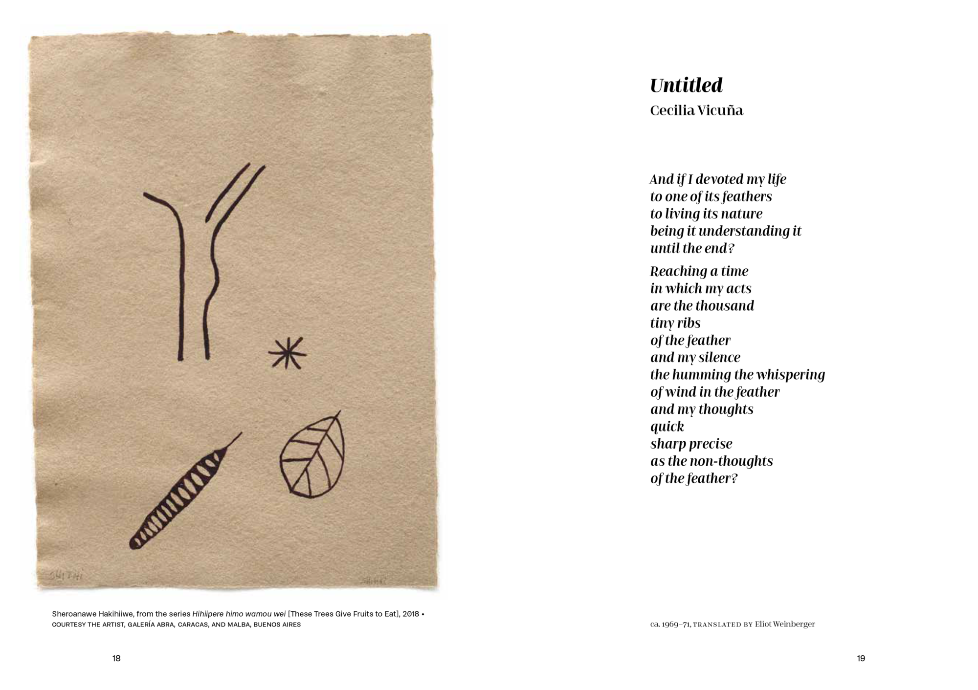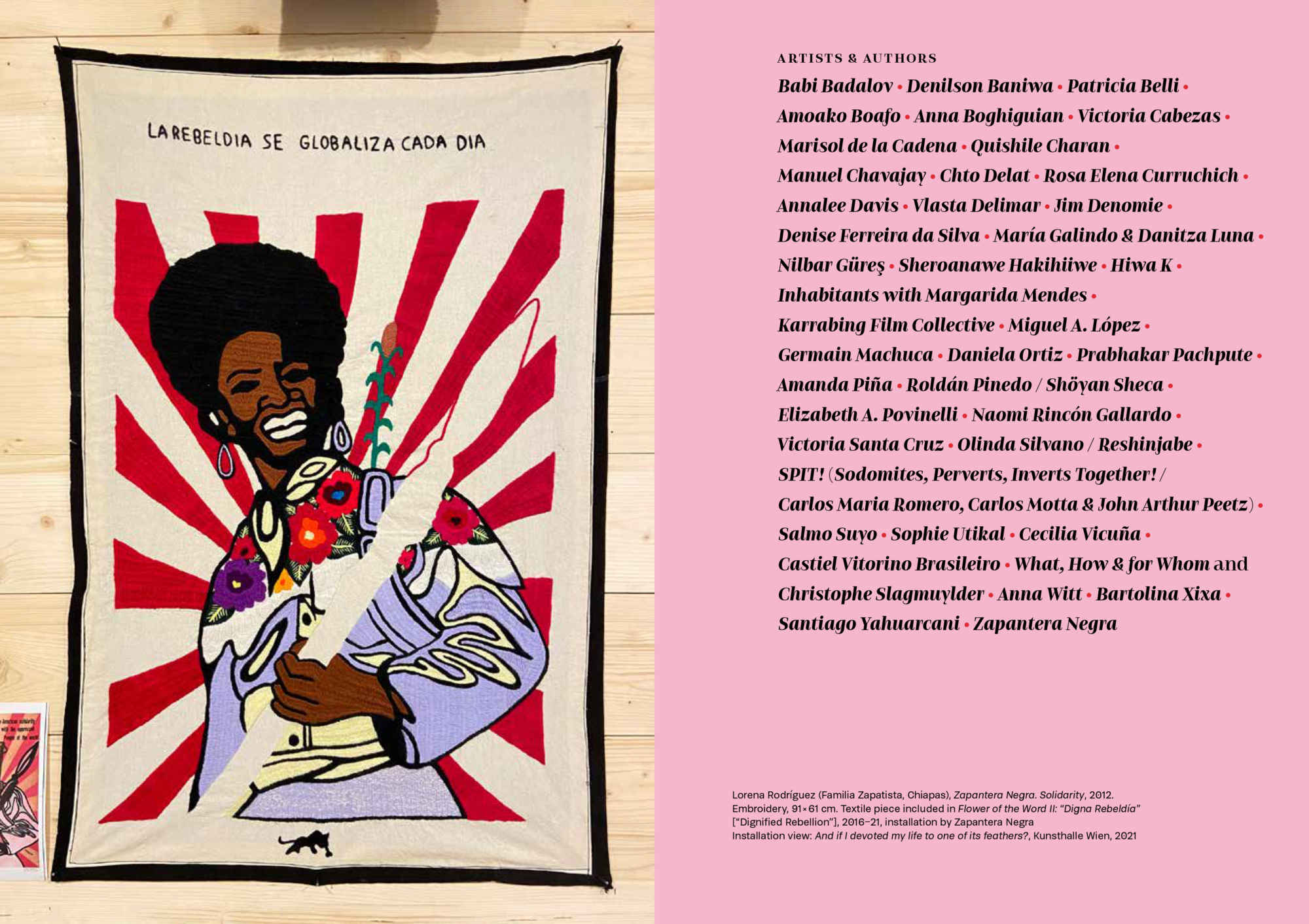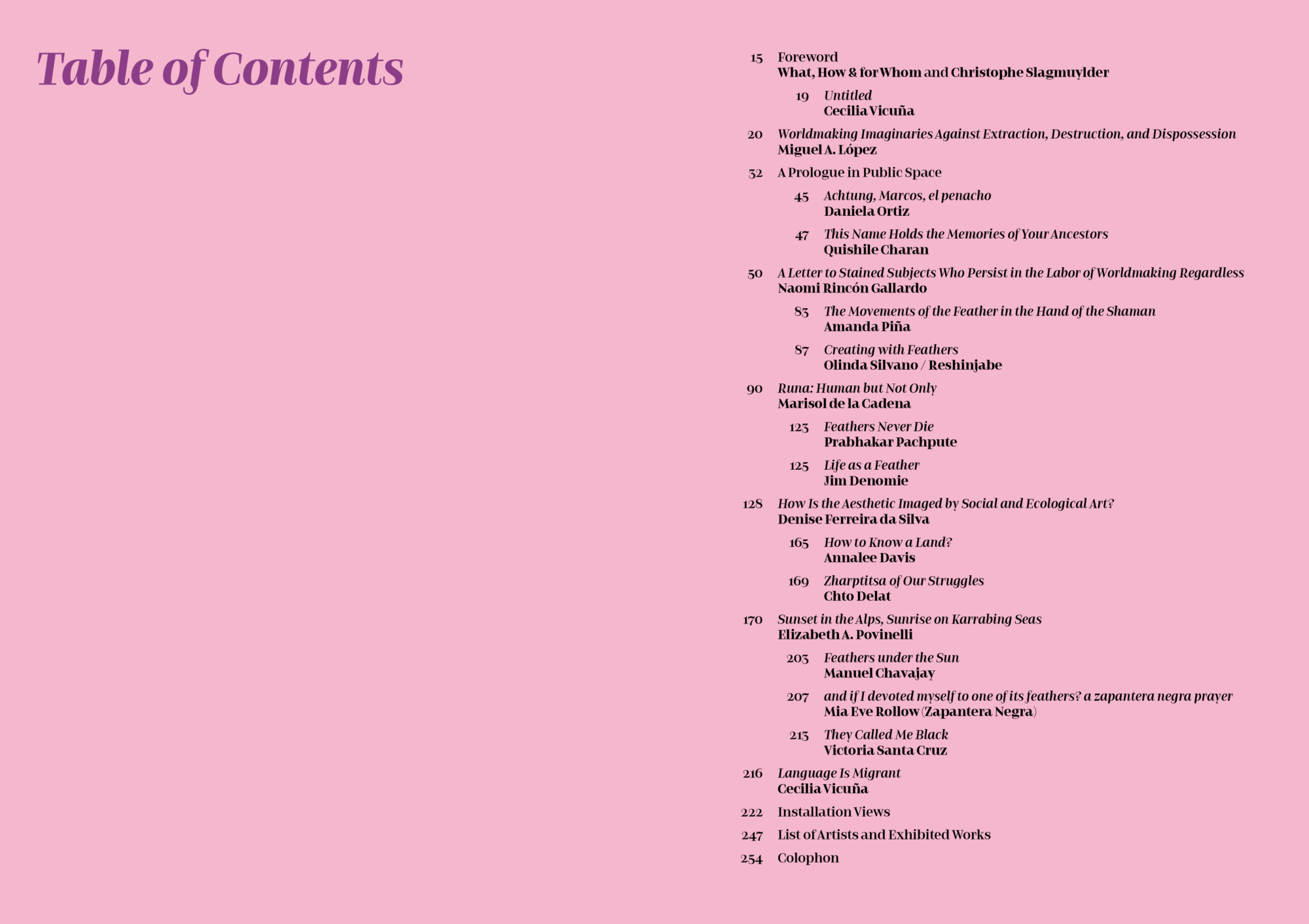 “And if I devoted my life to one of its feathers?” wrote the Chilean poet, artist, and feminist activist Cecilia Vicuña in the early 1970s. Vicuña countered anthropocentric and hetero-patriarchal urges with healing and appreciation, reviving the aesthetic and spiritual bonds between human and more-than-human entities and worlds. Revolving around this vision of interconnectivity, this book, which accompanies a joint exhibition of the same name of Kunsthalle Wien and Wiener Festwochen, seeks to create a collective dialogue around unequal distribution of power, sovereignty, and social and ecological justice.