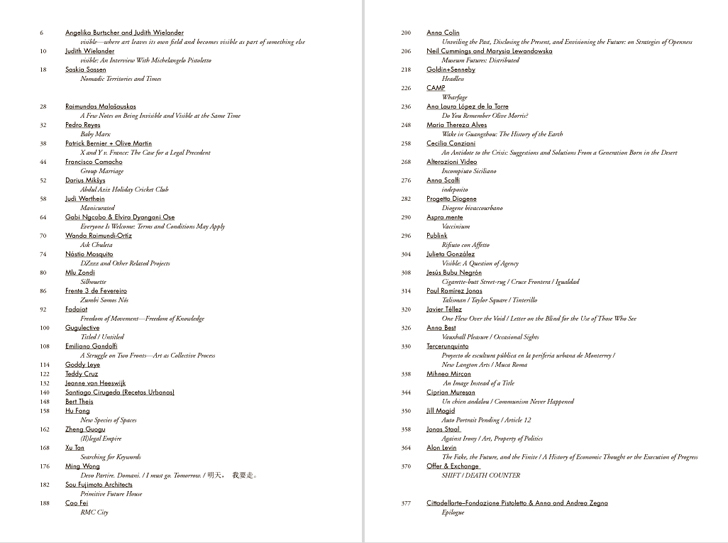Artists: Alterazioni Video, Maria Thereza Alves, Aspra.mente, Patrick Bernier and Olive Martin, Anna Best, Francisco Camacho, CAMP, Santiago Cirugeda (Recetas Urbanas), Teddy Cruz, Neil Cummings & Marysia Lewandowska, Fadaiat, Cao Fei, Frente 3 de Fevereiro, Sou Fujimoto Architects, Goldin+Senneby, Gugulective, Zheng Guogu, Jeanne van Heeswijk, Paul Ramírez Jonas, Alon Levin, Goddy Leye, Jill Magid, Darius Miksys, Nástio Mosquito, Ciprian Muresan, Jesús Bubu Negrón, Offer and exchange, Progetto Diogene, Publink, Wanda Raimundi-Ortíz, Pedro Reyes, Anna Scalfi, Jonas Staal, Xu Tan, Javier Téllez, Tercerunquinto, Bert Theis, Ana Laura López de la Torre, Judi Werthein, Ming Wong, and Mlu Zondi