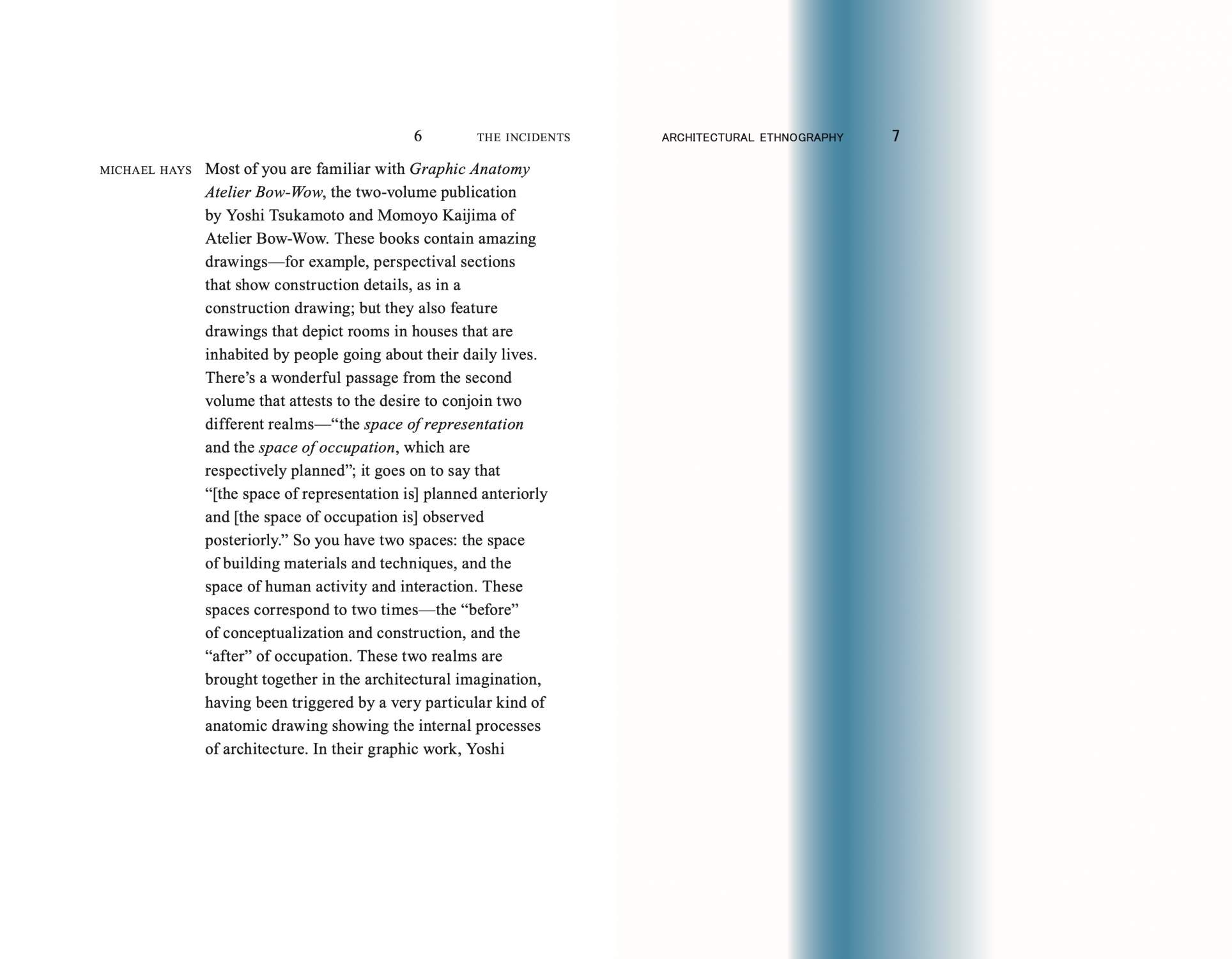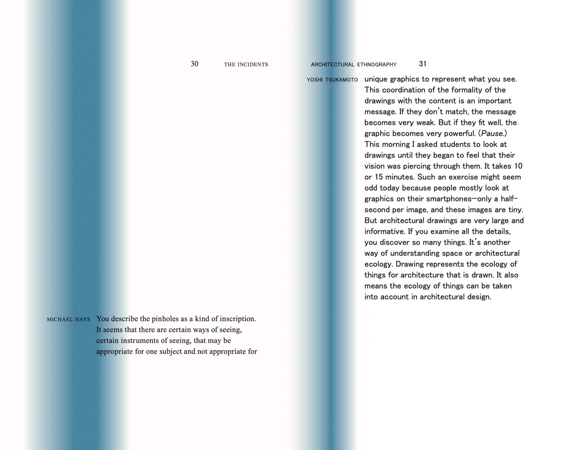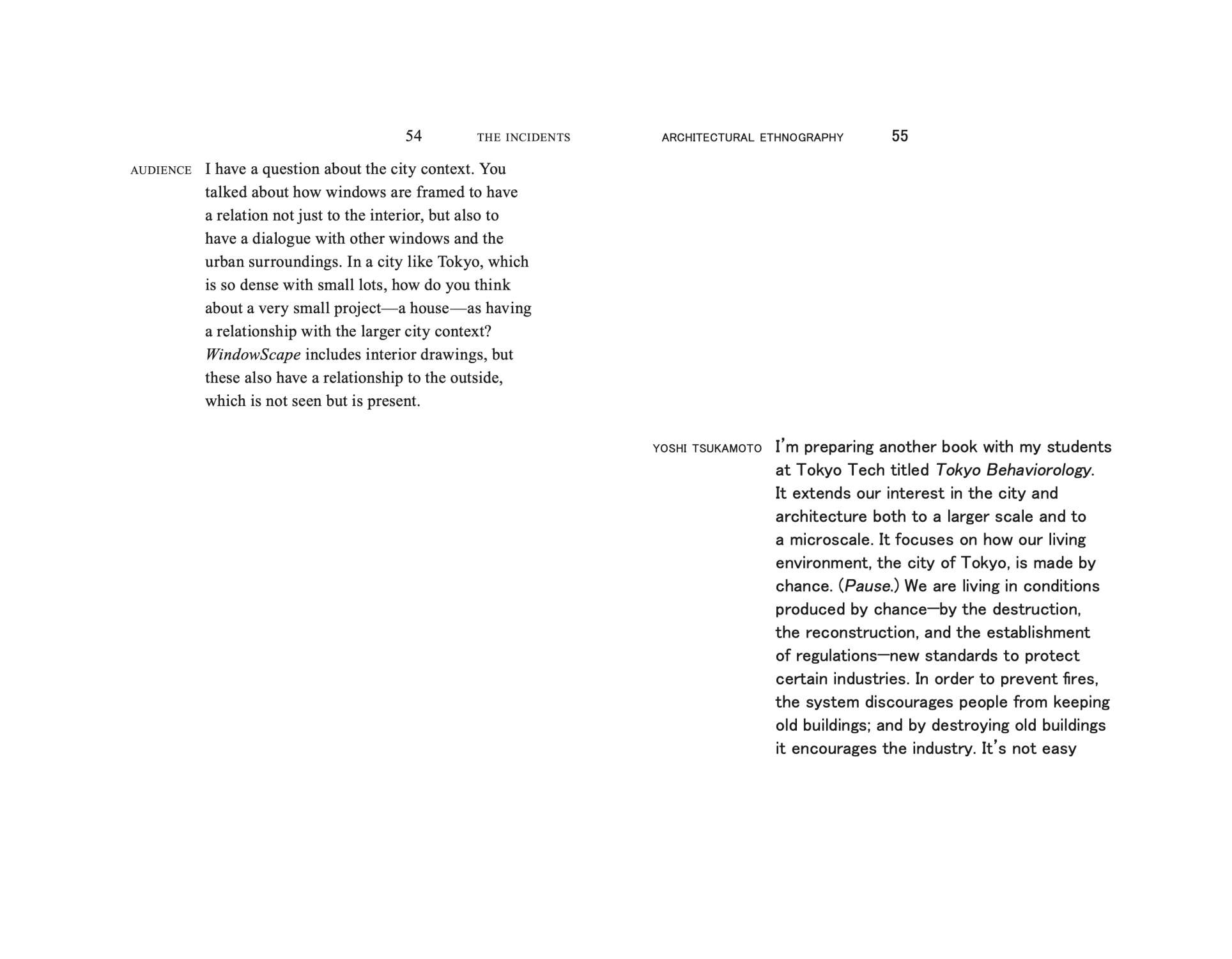Tsukamoto and Kaijima later spoke about the project with K. Michael Hays, Eliot Noyes Professor of Architectural Theory at Harvard’s Graduate School of Design, and reflected on representation, occupation, and the democracy of architecture. They unfolded their concept of an “ecology of livelihood,” wherein shadowless figures, objects, and spaces coexist with construction details. Explaining their belief in the “behavioral capacities” of humans, architecture, and nature, Tsukamoto and Kaijima revealed the generosity of spirit in their work, and the importance of pushing such capacities to their most yielding limits.