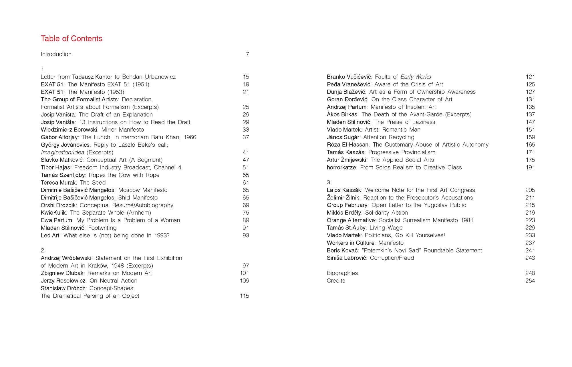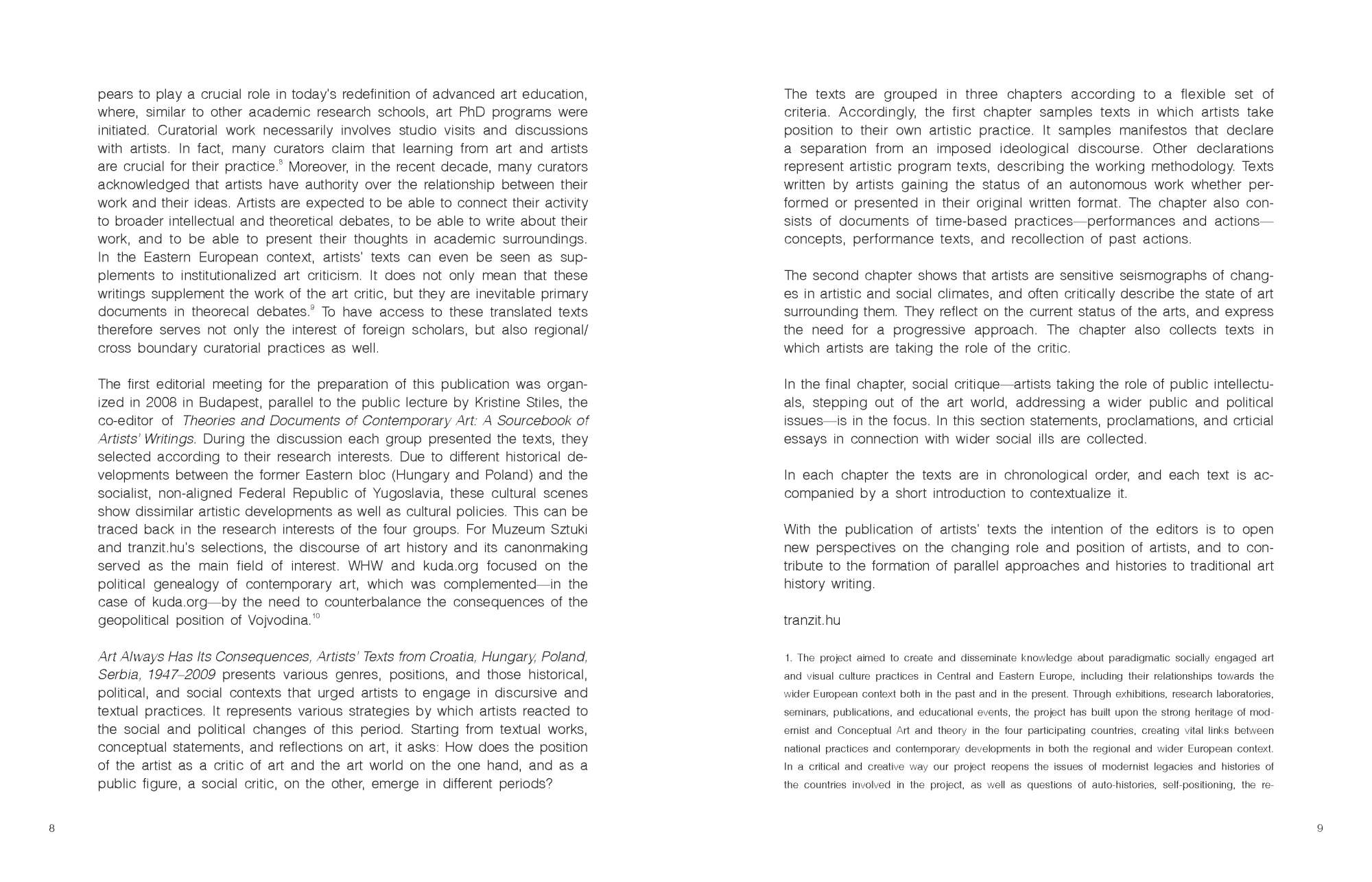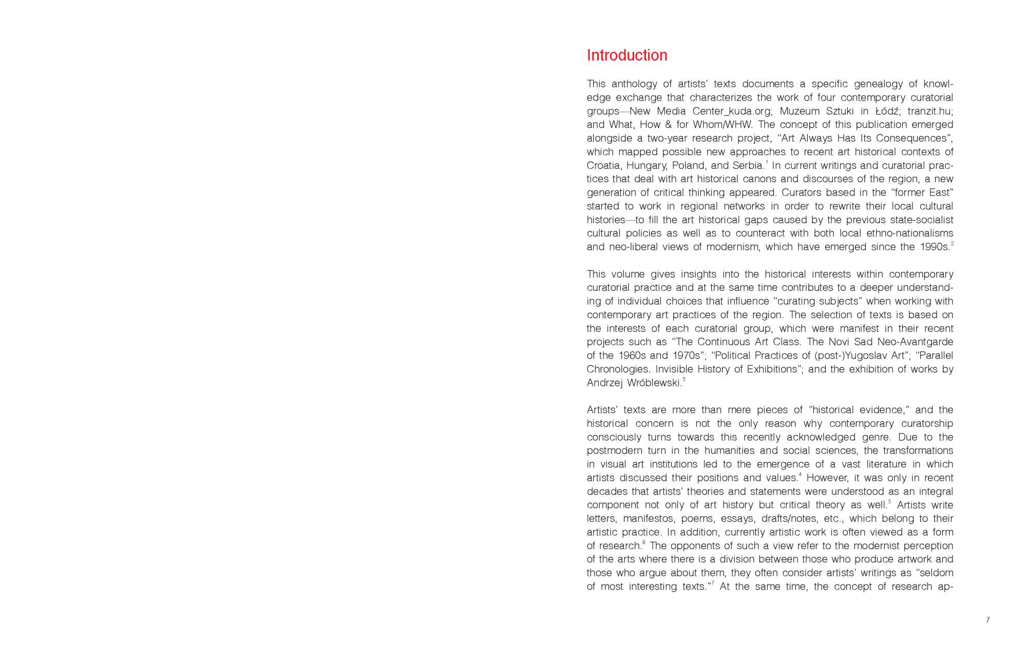Art Always Has Its Consequences: Artists’ Texts is a collection of manifestos, critical texts, and writings addressing public issues written by artists and artist groups from Eastern Europe between 1947 and 2009. The reader is result of an international curatorial research collaboration of four organizations: What, How and for Whom/WHW, Croatia; New Media Center_kuda.org, Serbia; Museum Sztuki in Łódź; and tranzit.hu.