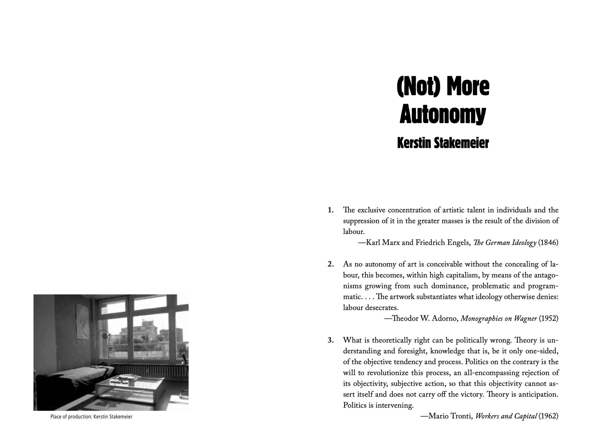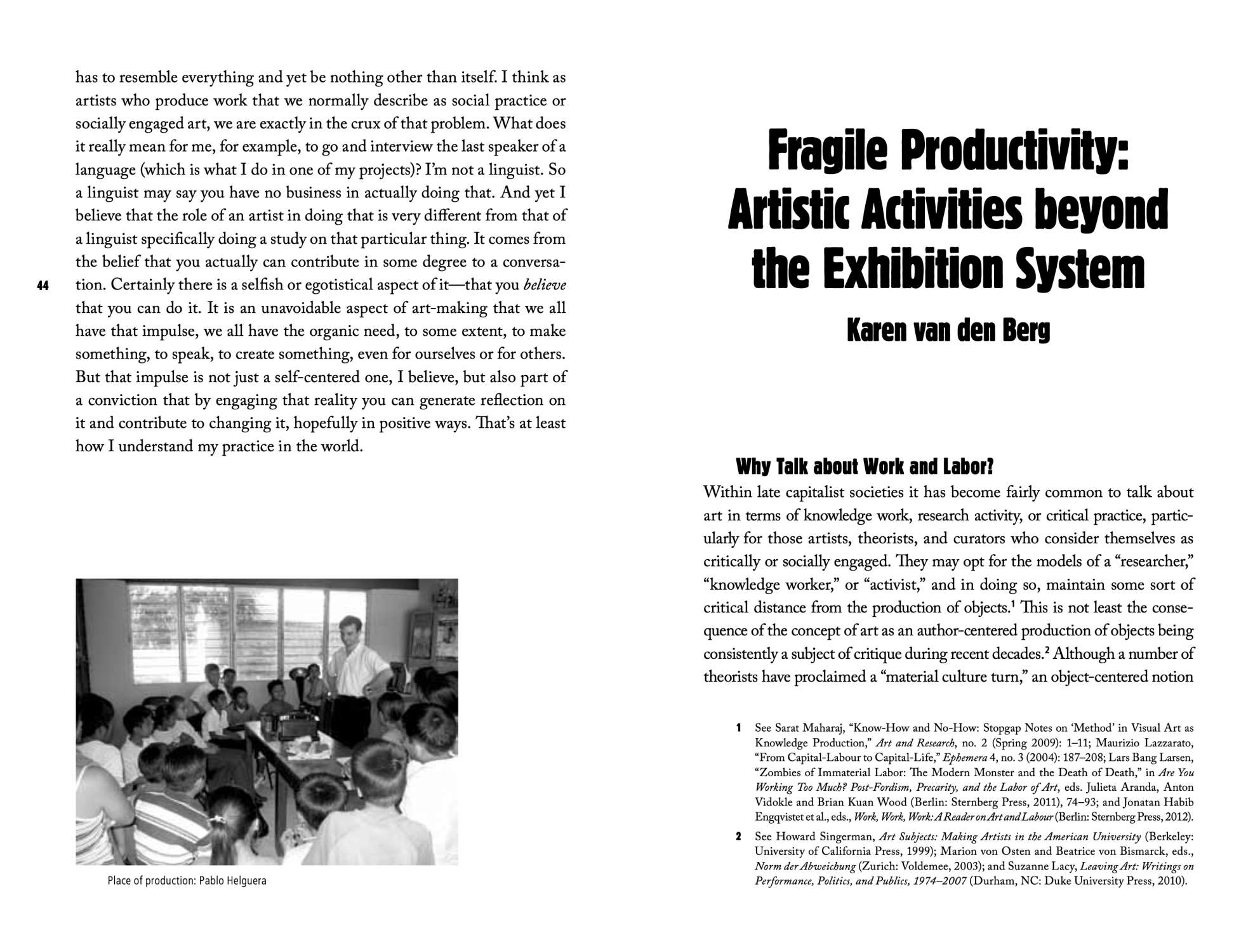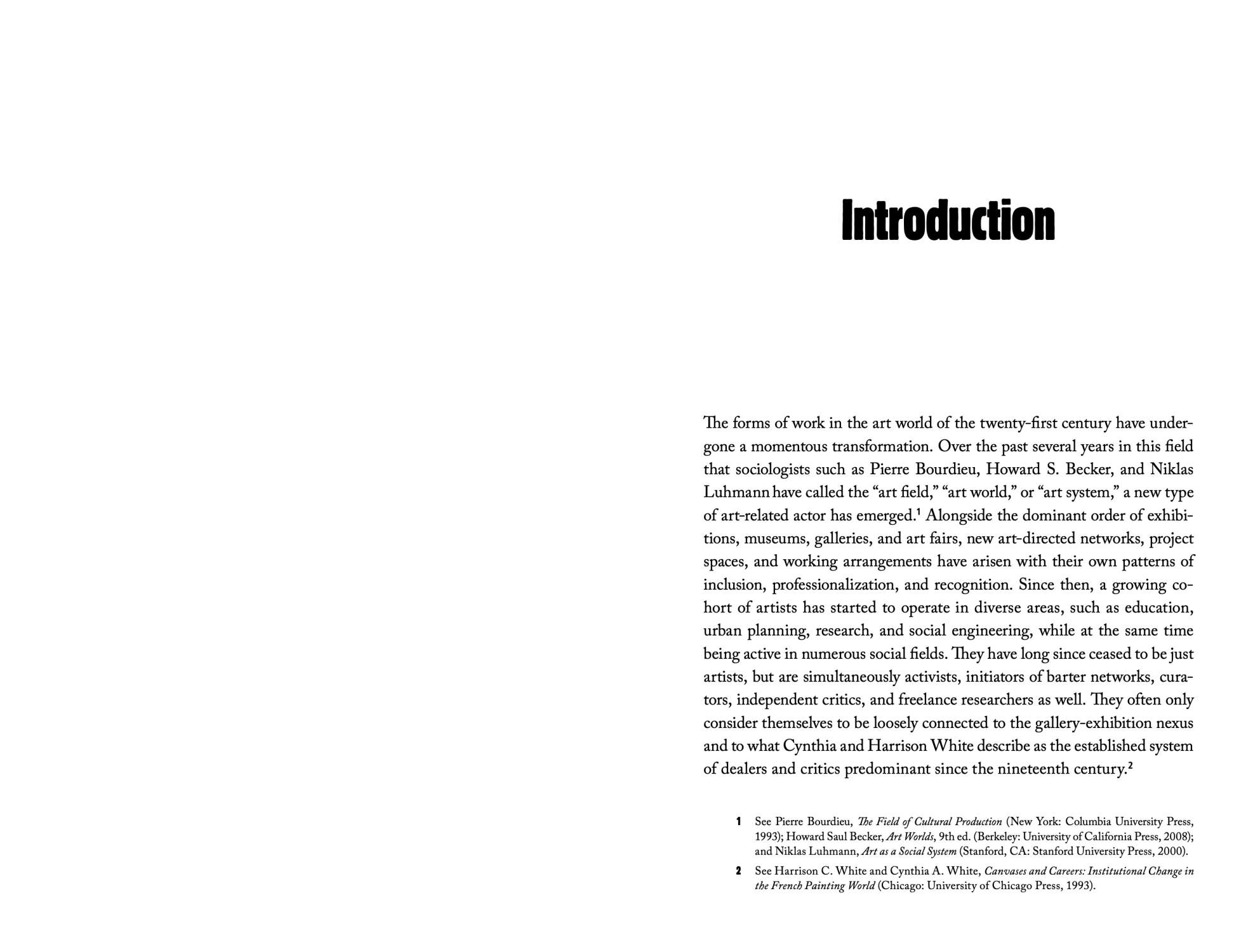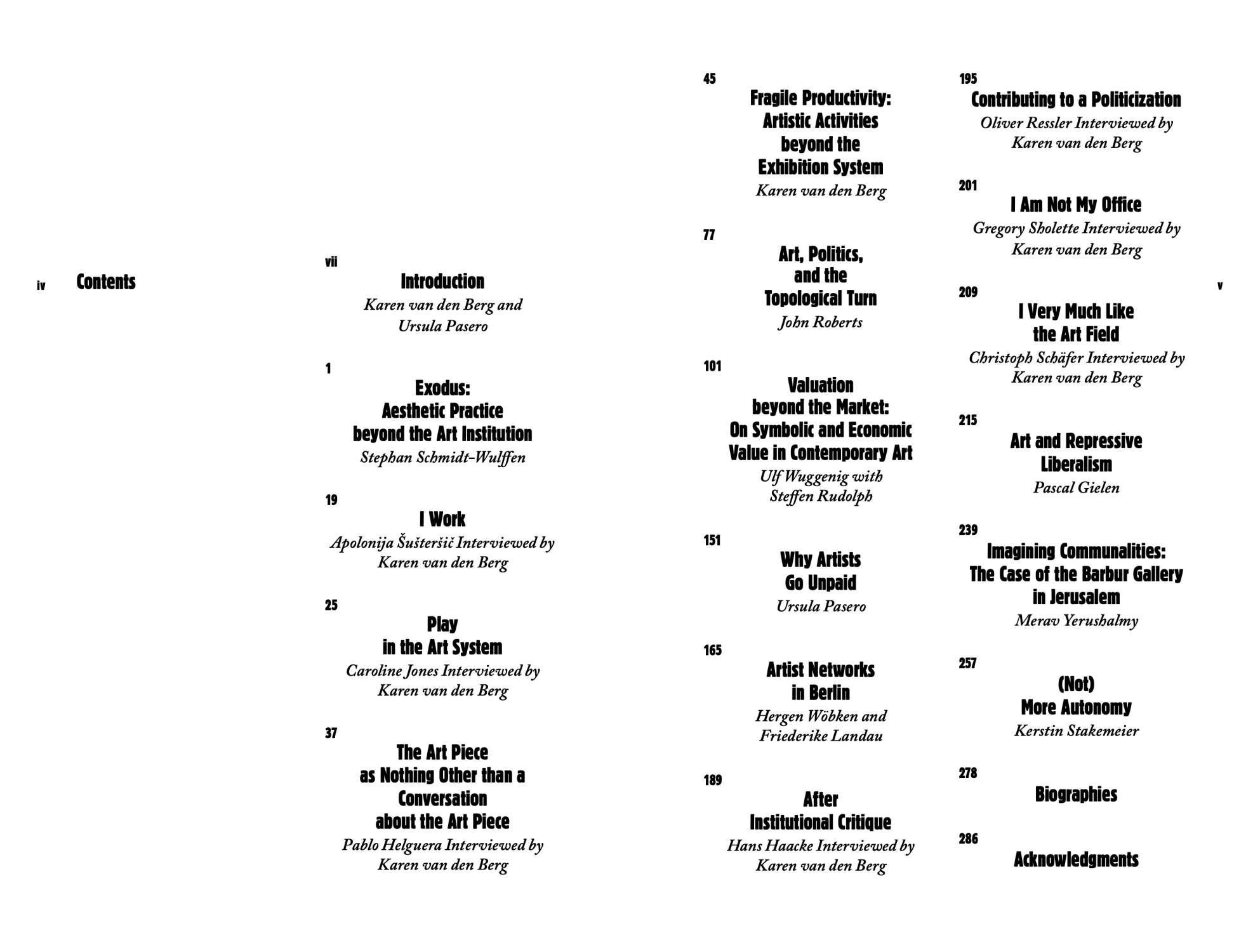 Much evidence suggests that a fundamental reordering of artistic production and a transformation of the art field are about to take place. Heated debates have been sparked over new forms of work, public subsidies, and the expanding impact of the creative industries. Independent education programs, self-organized urban planning, artistic practices in the outer field of scientific research, and similar initiatives have unfolded over the last few years. This publication addresses this wide field, focusing on theoretical reflections and exemplary insights into alternative artistic working models. The anthology assembles expert studies and artists’ interviews, in order to reflect on new forms of practices that have been established beyond the exhibition-gallery nexus and hegemonic market activity. These strategies in particular are investigated concerning their selfimages, organizational structures, networks, and economies—and the potential for usurpation.