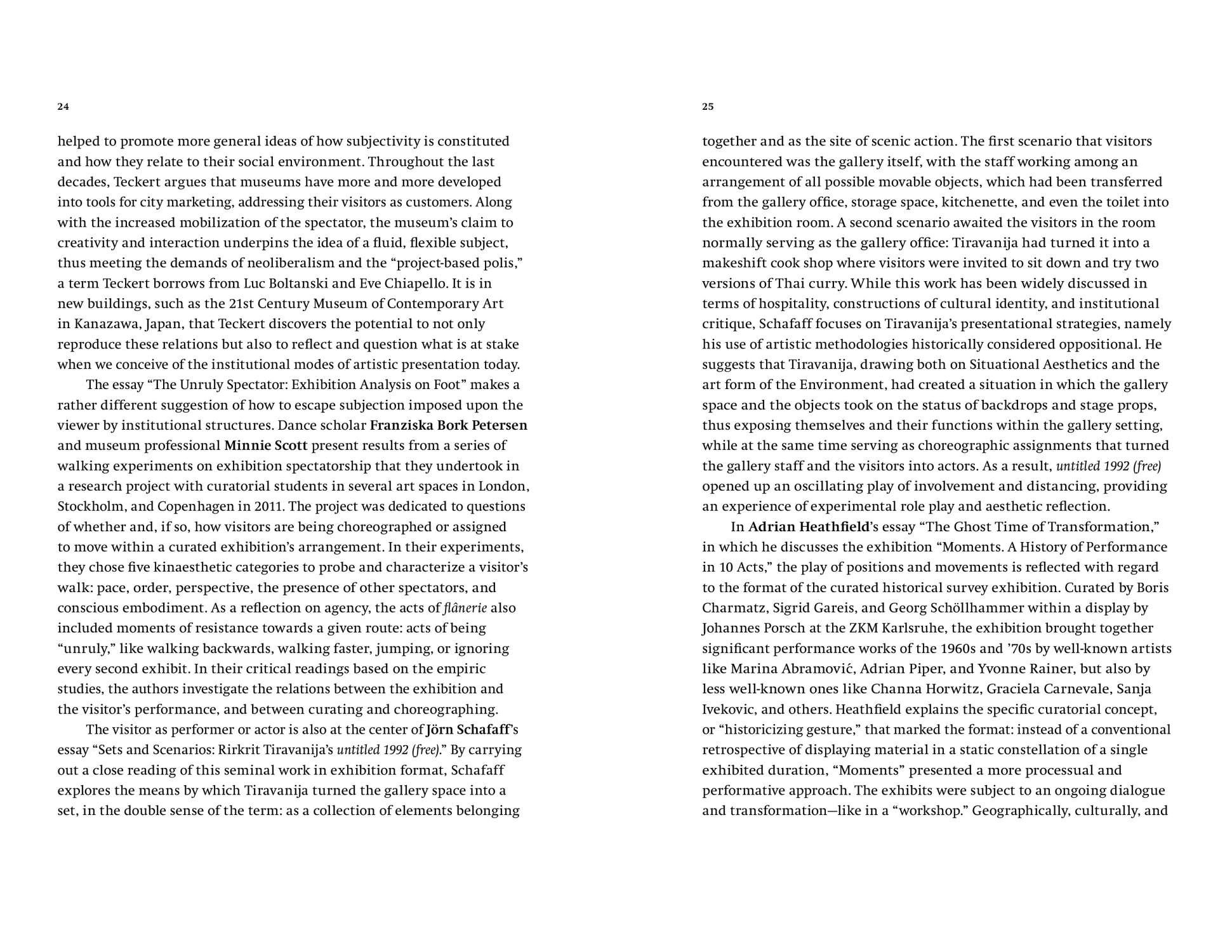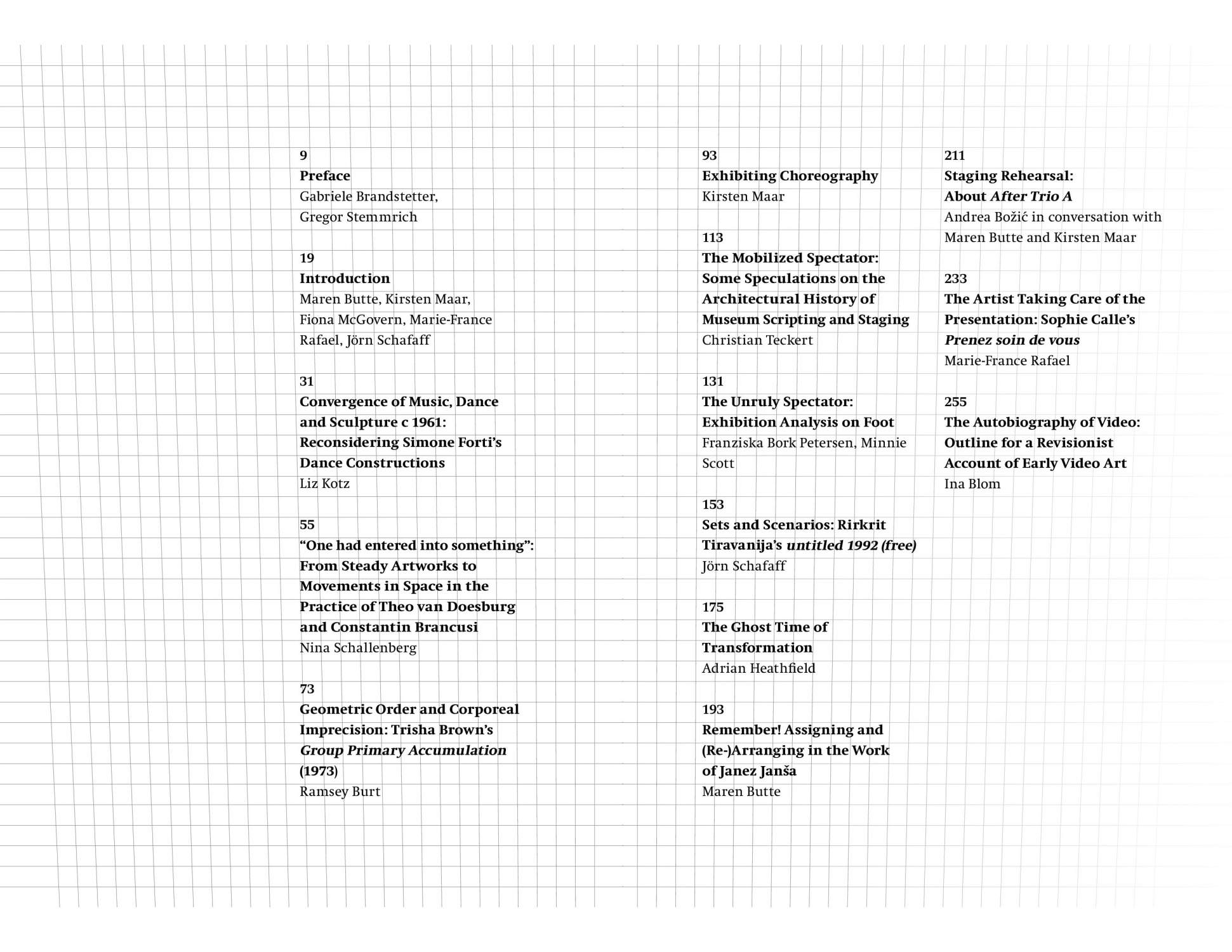 Assign & Arrange: Methodologies of Presentation in Art and Dance aims to map the exchanges and transgressions between art and dance that characterize the manifold variety of relations between art and dance that can be observed today: dance performances taking place in art galleries or public spaces, for example, or visual artists developing specific presentational formats or exhibition displays that generate dimensions of dramaturgy and choreography for their visitors. Terms like mise-en-scène, situation, setting, choreography, and installation are being almost coevally used not only by theoreticians but also by contributors from both art and dance in order to define modes of presentation or to specify visitors’ aesthetic experience. Taking into account historical and current examples, and involving perspectives from art history, dance studies, and architecture, the book explores similarities and differences in the respective practices, as well as in the theoretical concepts they correspond with.