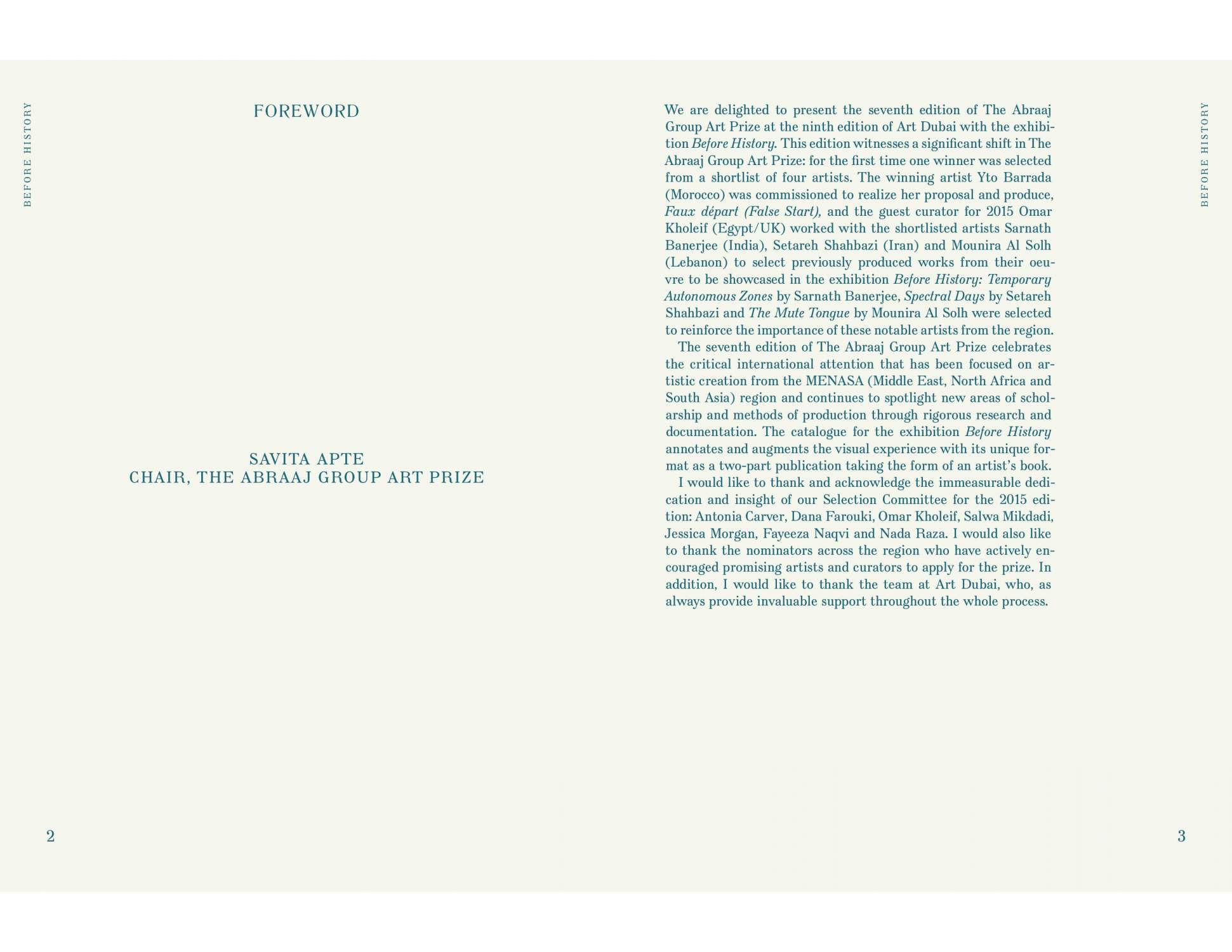 Before History catalogues the exhibition for the Abraaj Group Art Prize 2015, which includes a new body of work by Yto Barrada, the winner of the prize, and existing work by shortlisted artists Sarnath Banerjee, Setareh Shahbazi, and Mounira Al Solh. The exhibition explores the layering of time through historical artifice. History here is considered as a constructed sphere, constantly in flux, simultaneously being buried and excavated.