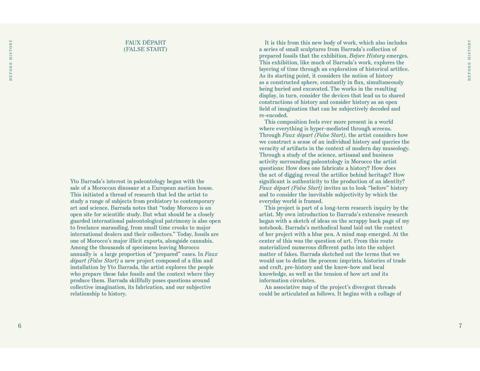 In a world of hyper-mediation, how can one construct a sense of an individual history? How does it relate to the sediments of culture? A film at the heart of Yto Barrada’s new work, Faux départ (False Start) (2015), questions the veracity of artifacts in the context of modern-day museology. Through a study of paleontology in Morocco, the artist asks: How does one fabricate a history?