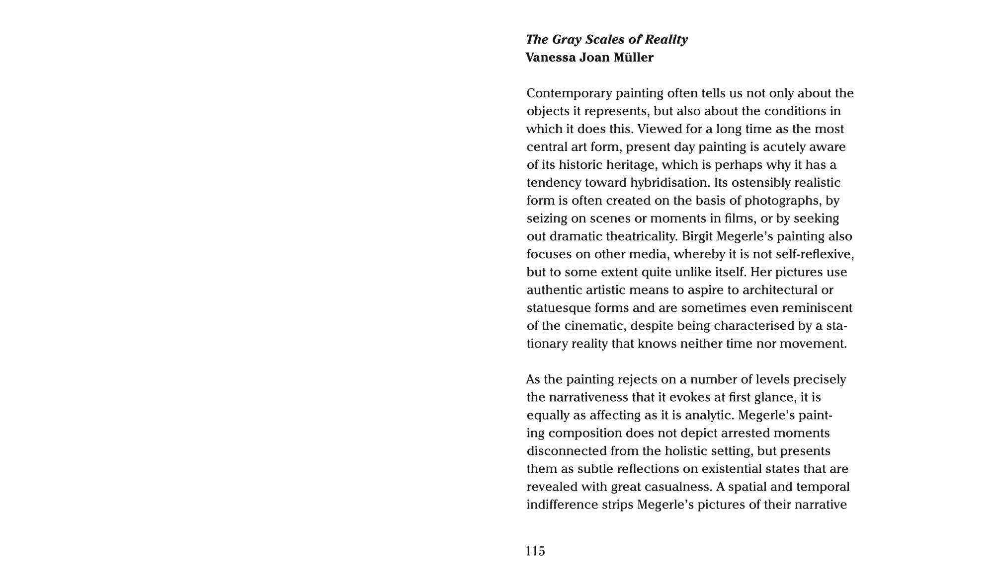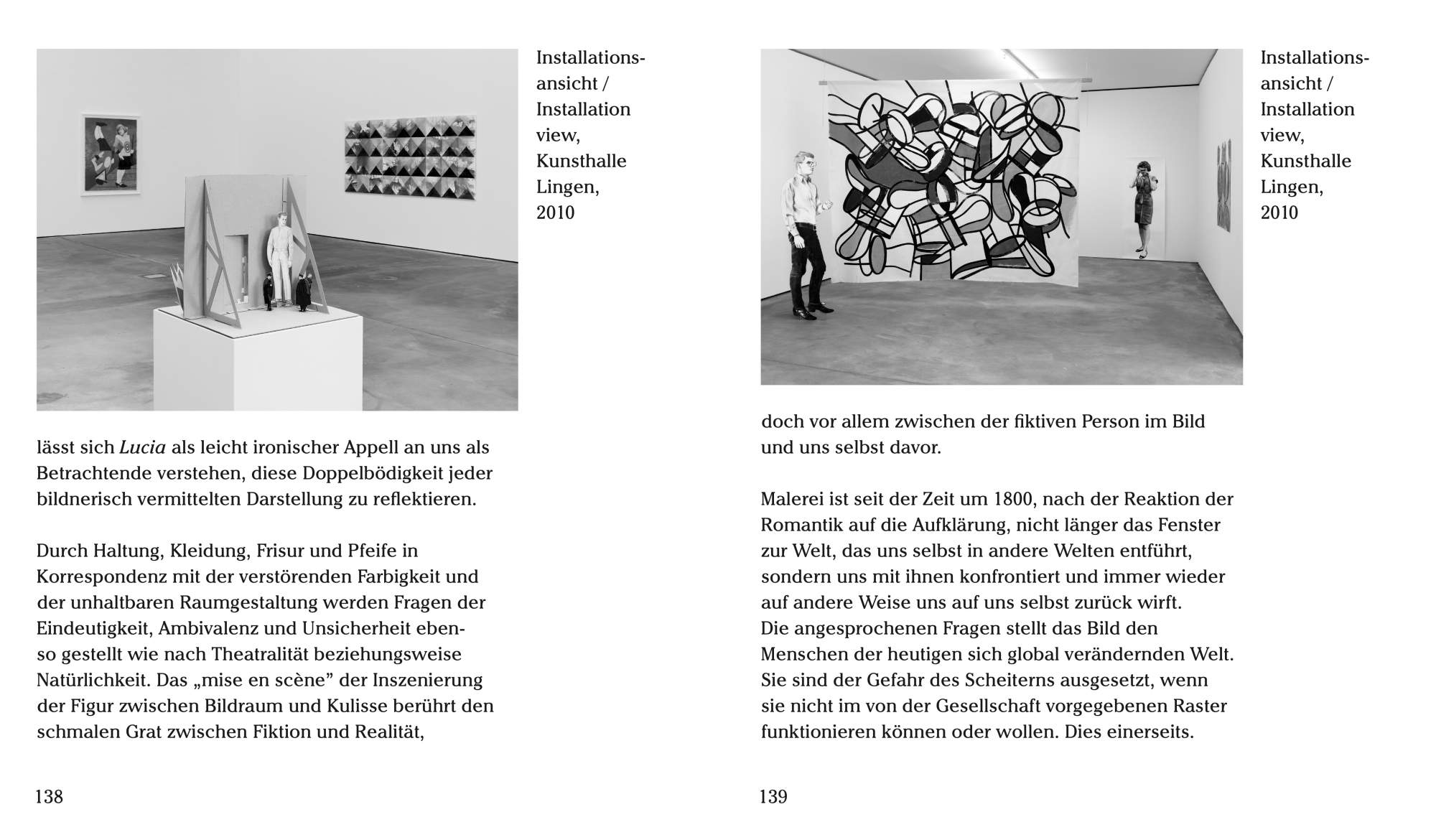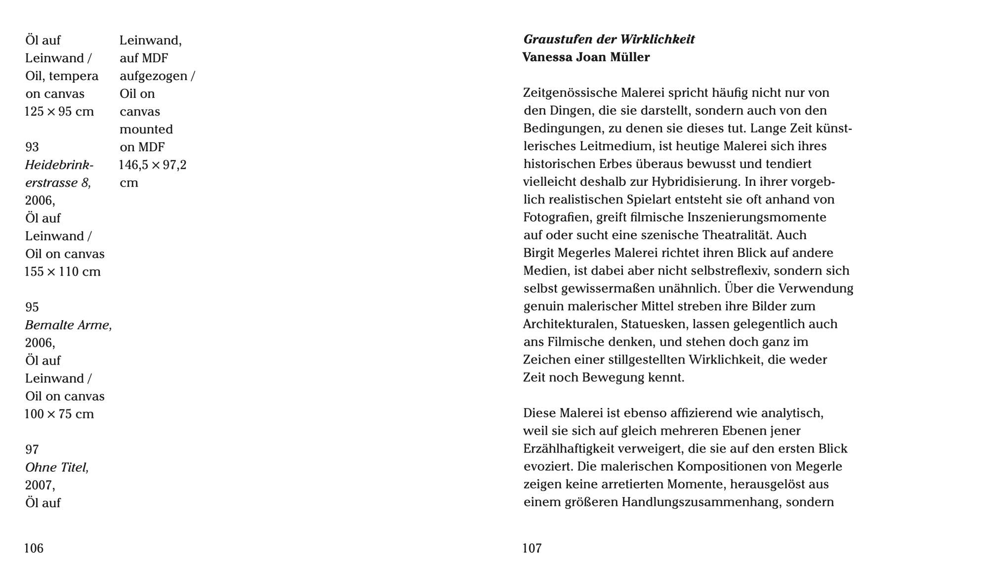Birgit Megerle’s figurative and abstract paintings are characterized by an artificial, rigid, and stage-like atmosphere. The female characters featured in her works are poised with a determination and a readiness to act, and while based in a tradition of representational painting, they are eerily unreal and remote. Despite their contemporary references, the works feel as though they have fallen out of time. Associations with performative events are amplified by Megerle’s installations, in which the works are hung not only on the wall, but also laid on the floor or presented as mise en scène. Although the works contain figurative elements, comprehensible narratives do not unfold, with Megerle challenging social constraints and norms without proffering solutions. This exhibition catalogue accompanied Megerle’s exhibition at Kunsthalle Lingen in the fall of 2010.