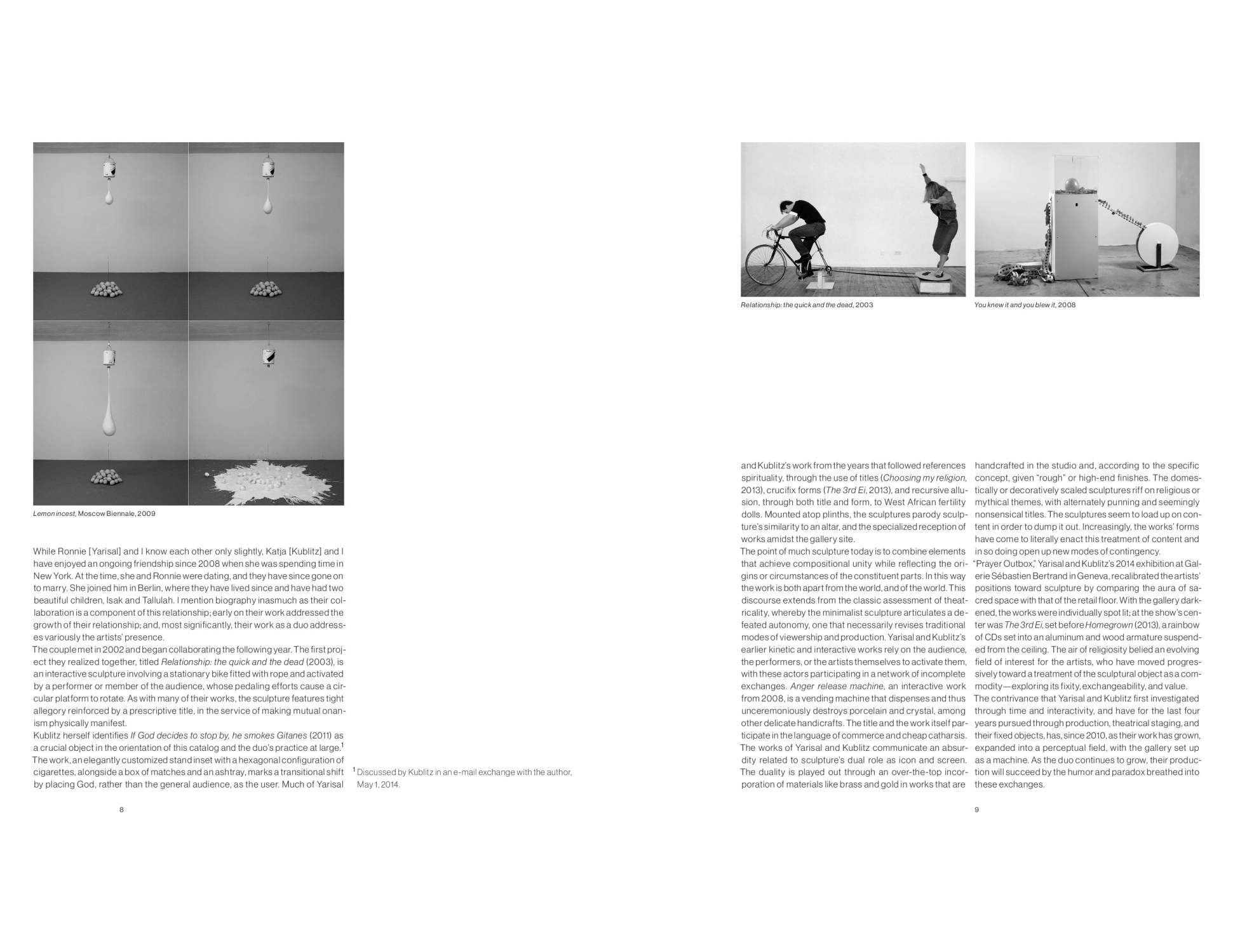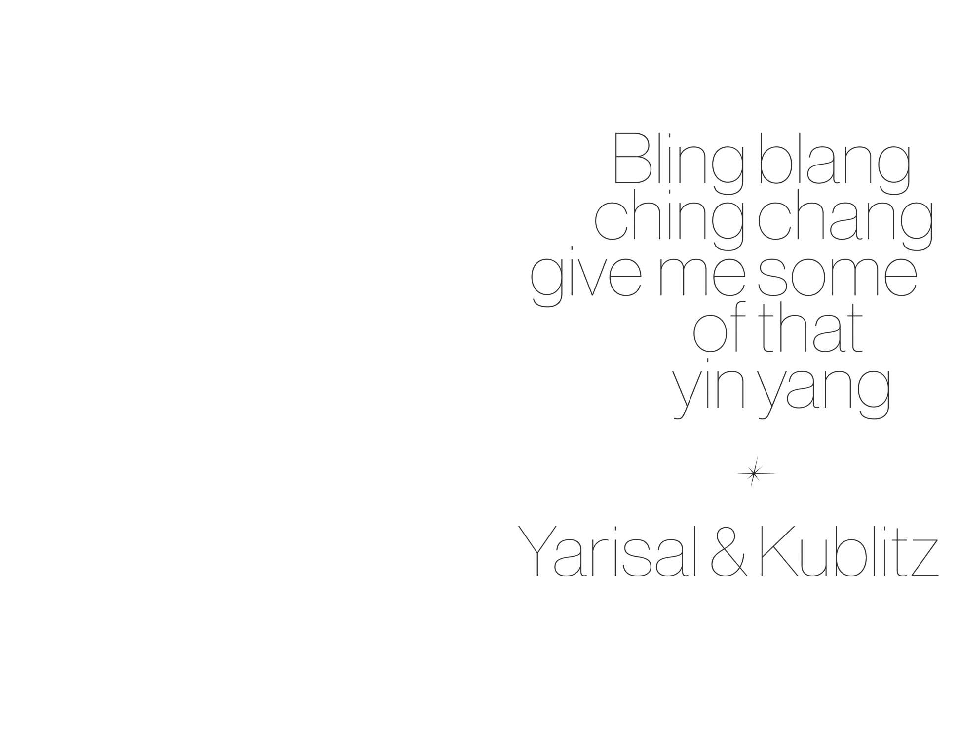 In this monograph the Swiss and Danish duo give us a deeper look into the emblematic and enigmatic, imaginative and often humorous works that the artists are known for. By mixing the inorganic with the organic, traditional religious symbols and their New Age counterparts with common everyday references and popular culture, the line between what is considered holy or secular becomes blurry. At once commonplace and strange, the sculptures compel their audience toward expanded associations by releasing iconography from accustomed paradigms. Elizabeth Grady writes, “Ultimately, their work as a whole explores the territory of the human condition; from our physical embodiment to our metaphysical state of being.” Bling blang, ching chang, give me some of that yin yang is the first survey of Yarisal & Kublitz’s works from 2010 to 2014.