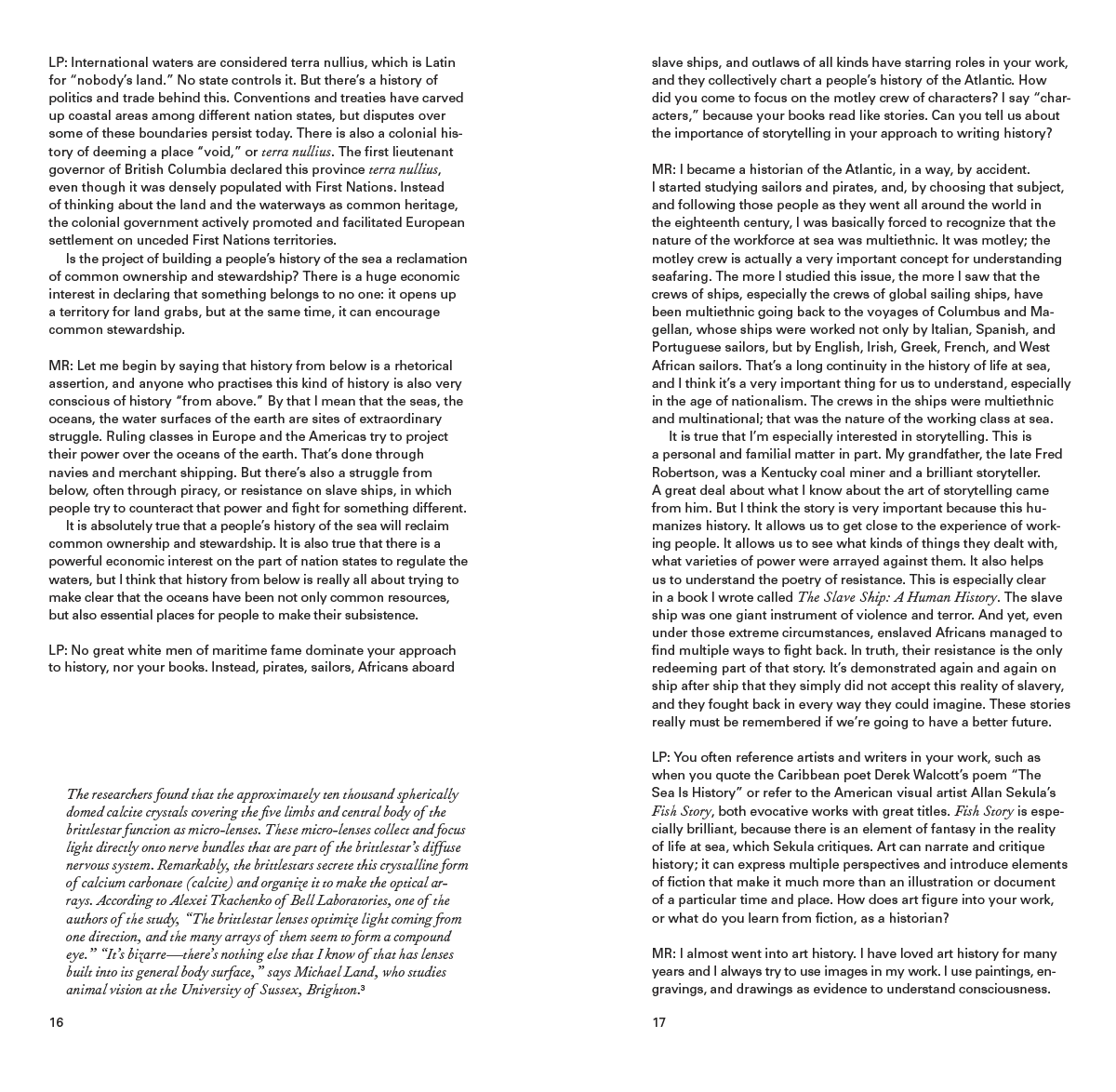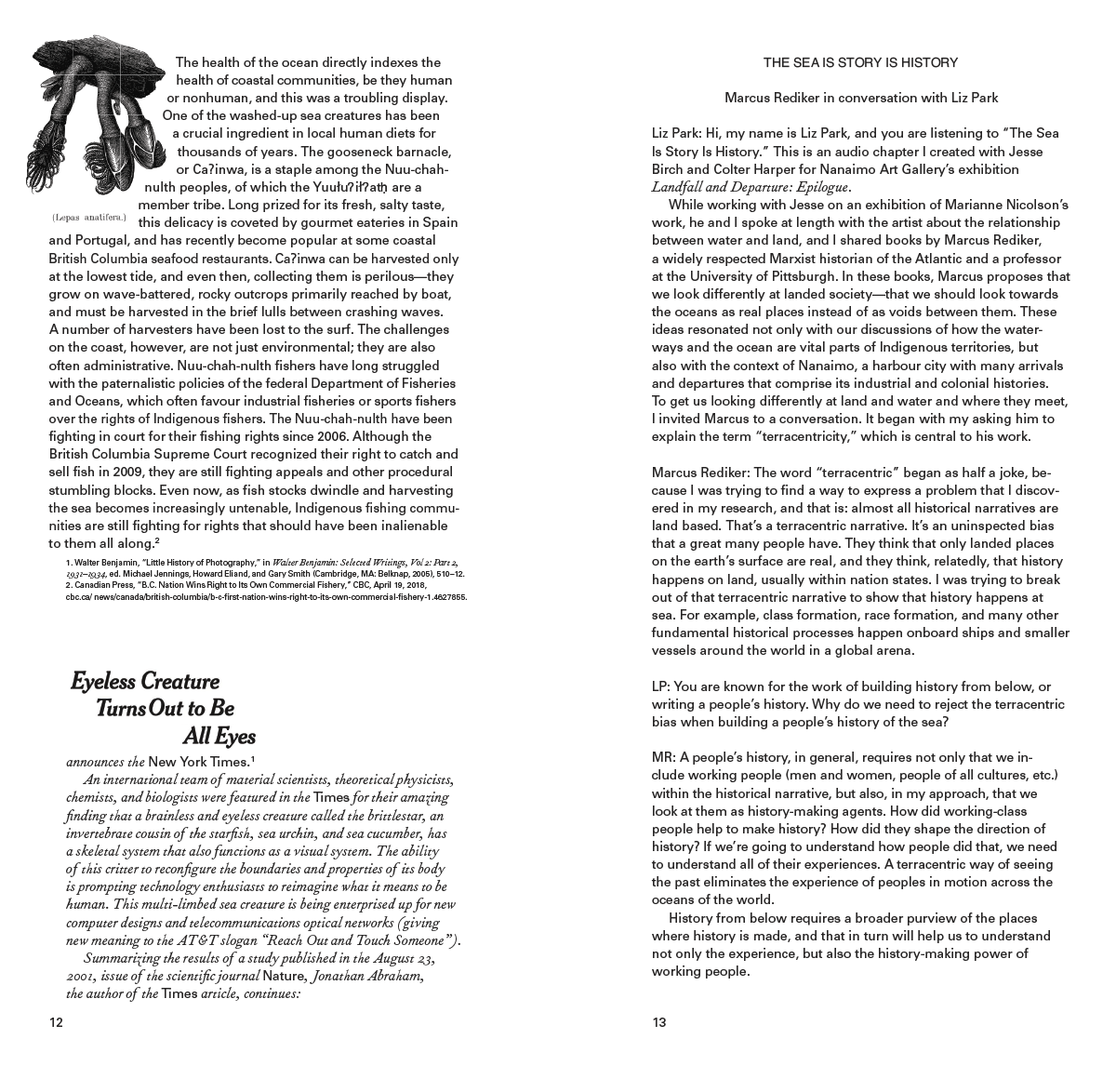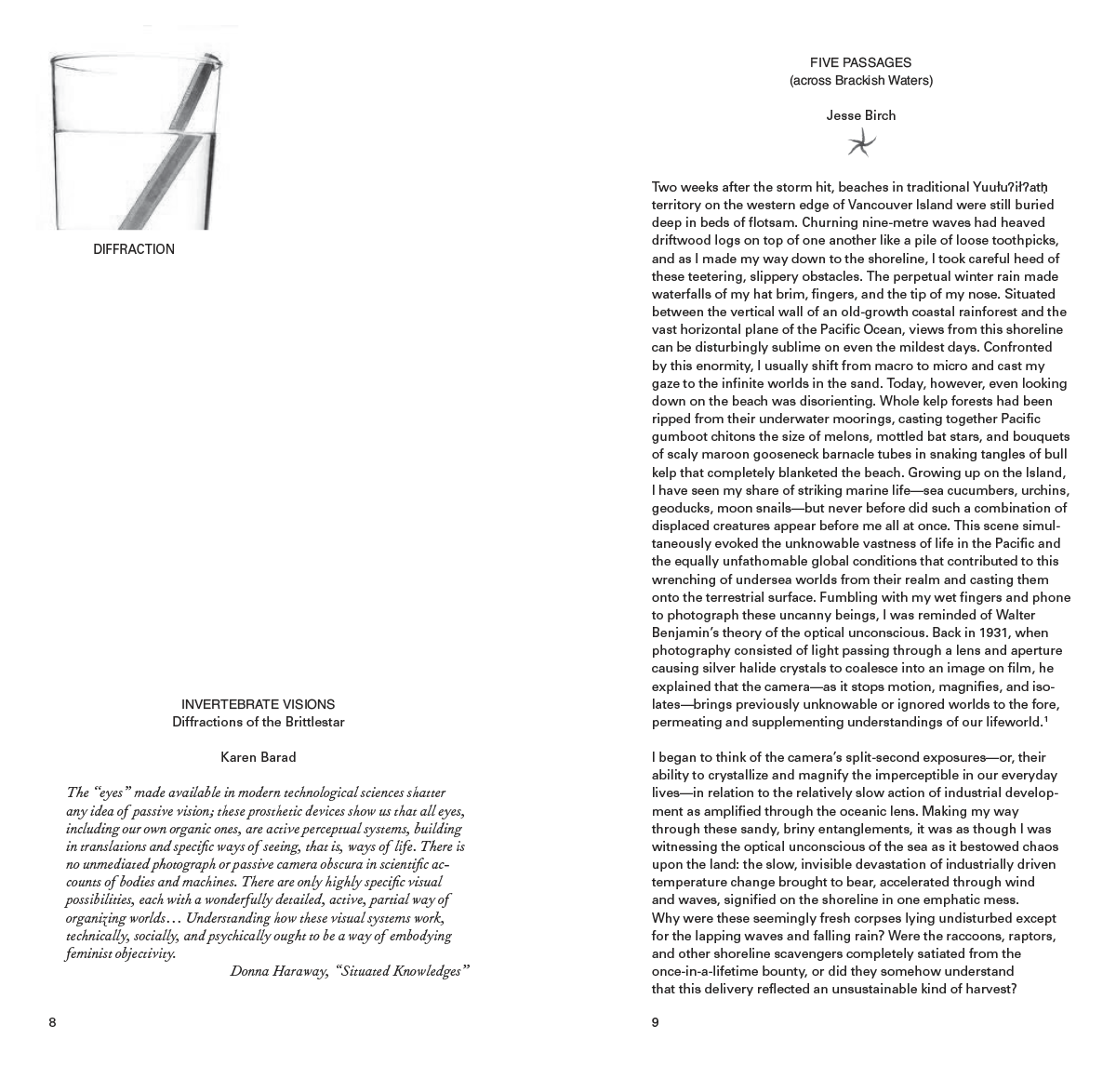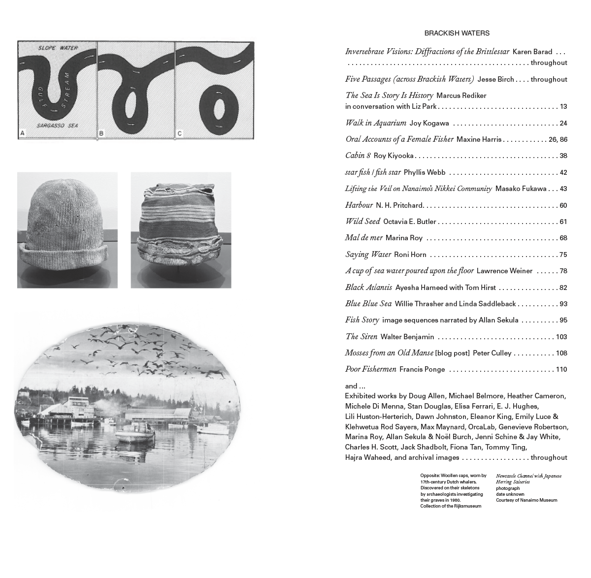 Brackish waters mingle the fresh with the salt. Departing from industrial ports and shoreline ecosystems, this publication crosses oceanic worlds of extraction and distribution. It responds to marine environments diffracted by the perspectives of artists, writers, Indigenous Elders, fish and fishers, biologists, citizen scientists, whales, physicists, boat builders, ship workers, sailors, pirates, brittle stars, and other creatures of the deep.