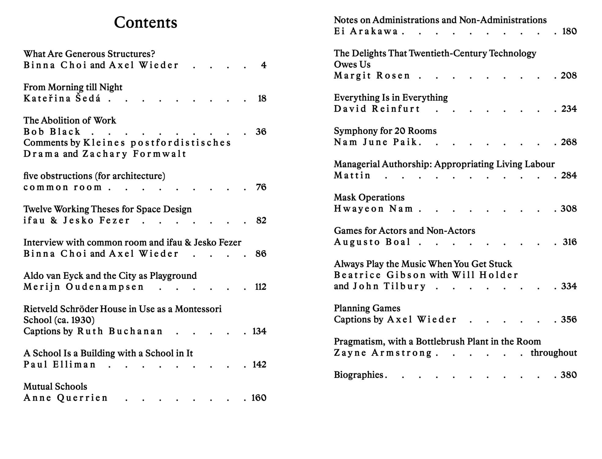 Casco Issues is a magazine published by Casco – Office for Art, Design and Theory, which explores recurring issues that emerge from Casco’s program. The twelfth edition of Casco Issues, Generous Structures, is a playful enquiry into “playfulness” as a value in critical cultural practice. It positions alternative notions of playing against the grain of neoliberal ideologies of “lifelong learning” and “work as play.”