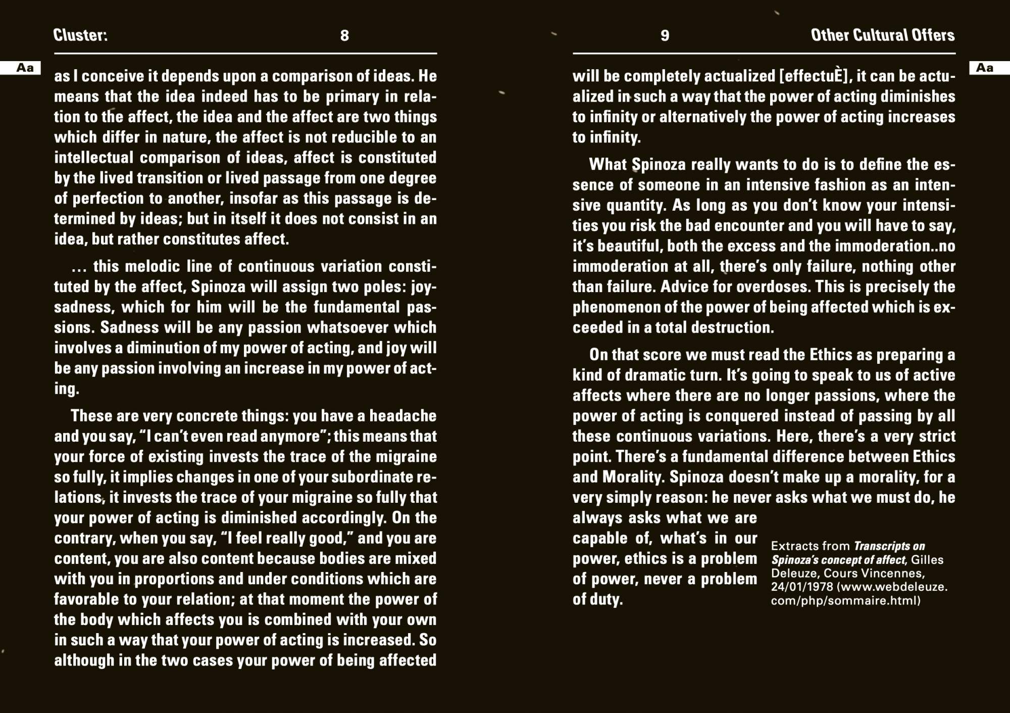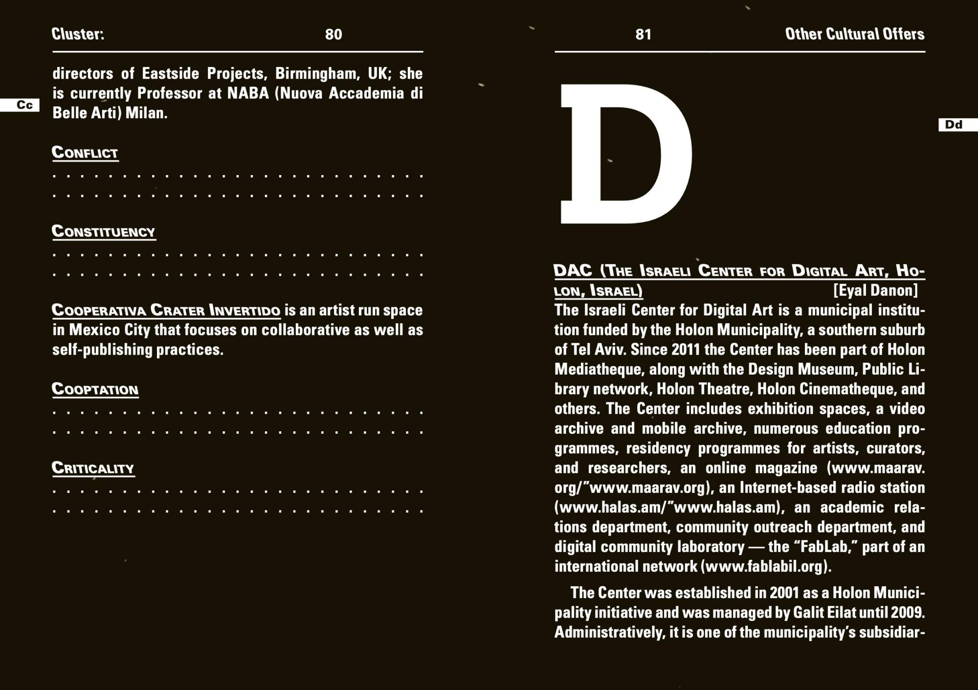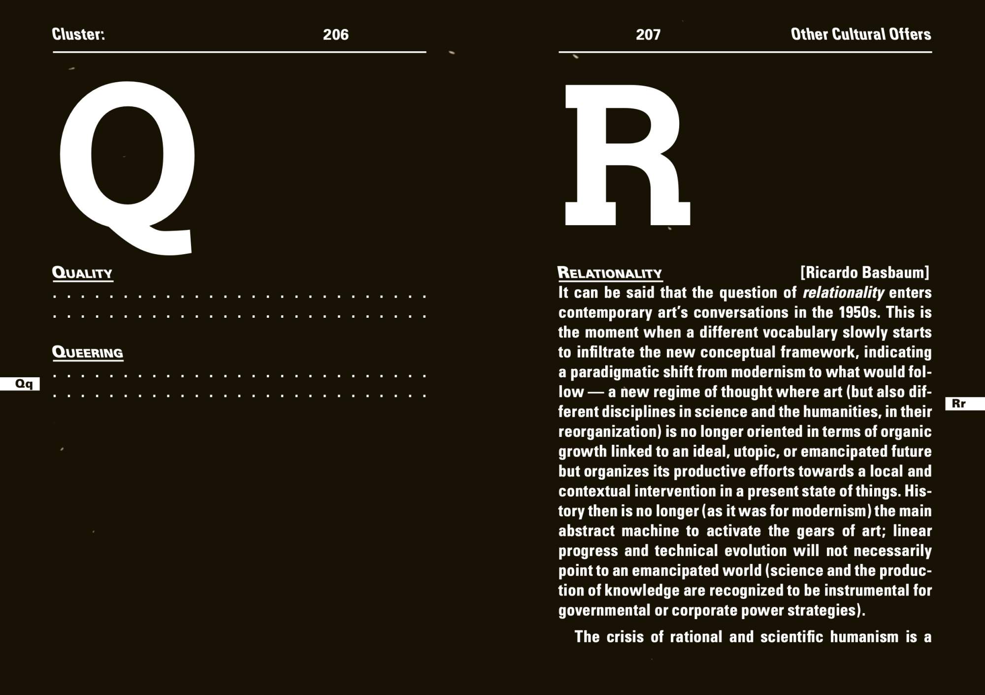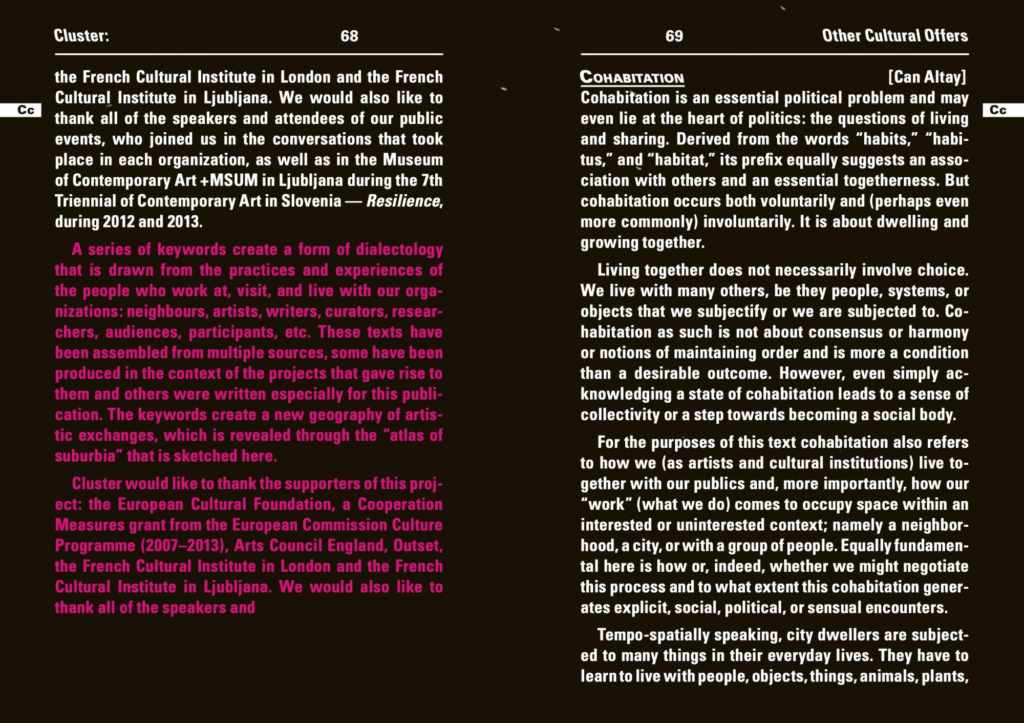 Compiled after a series of meetings in each organization over a period of two years, Cluster: Dialectionary aims to find new ways to position this work and the work of contemporary visual arts organizations more broadly, particularly in relation to wider social, political, and cultural concerns.