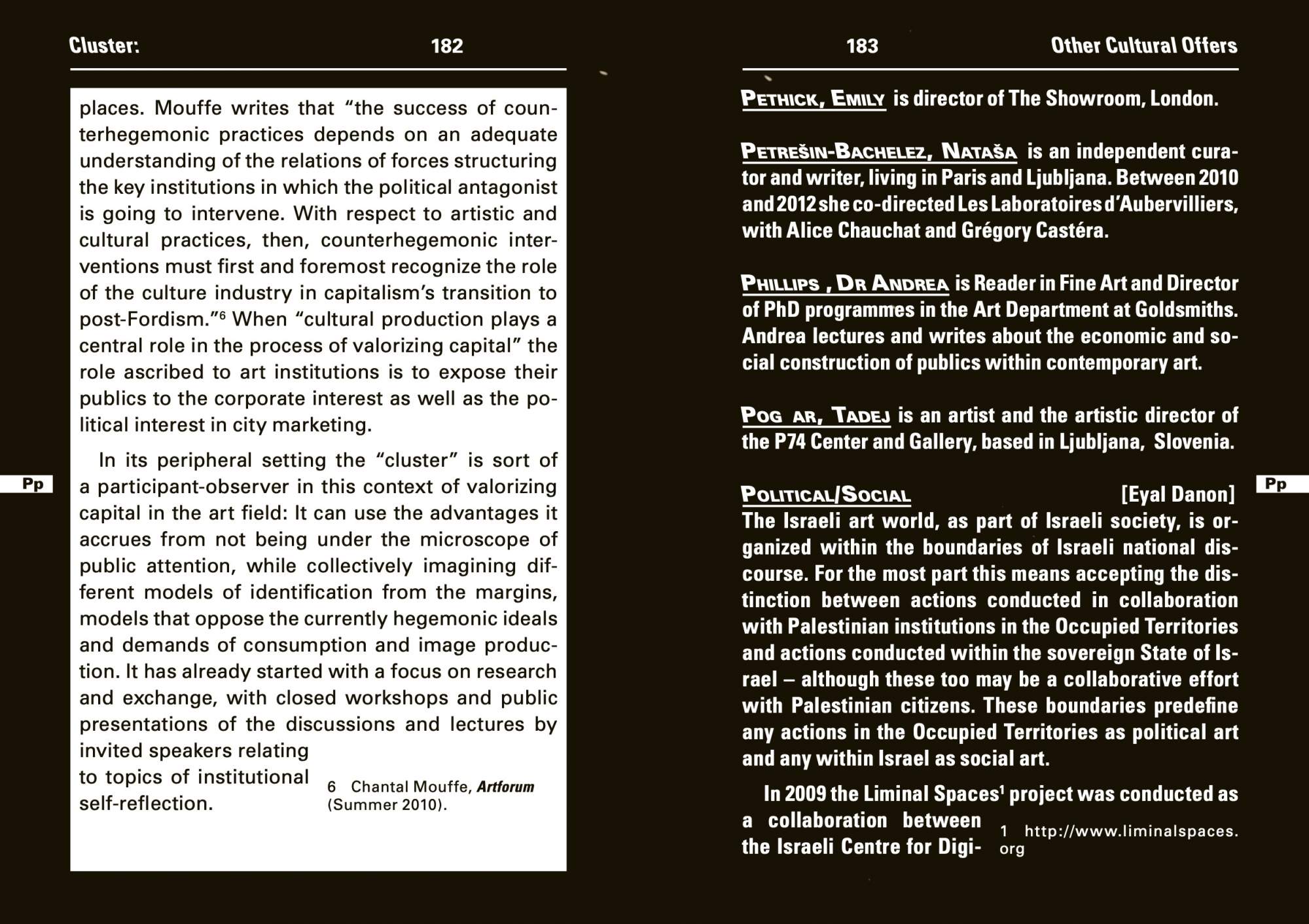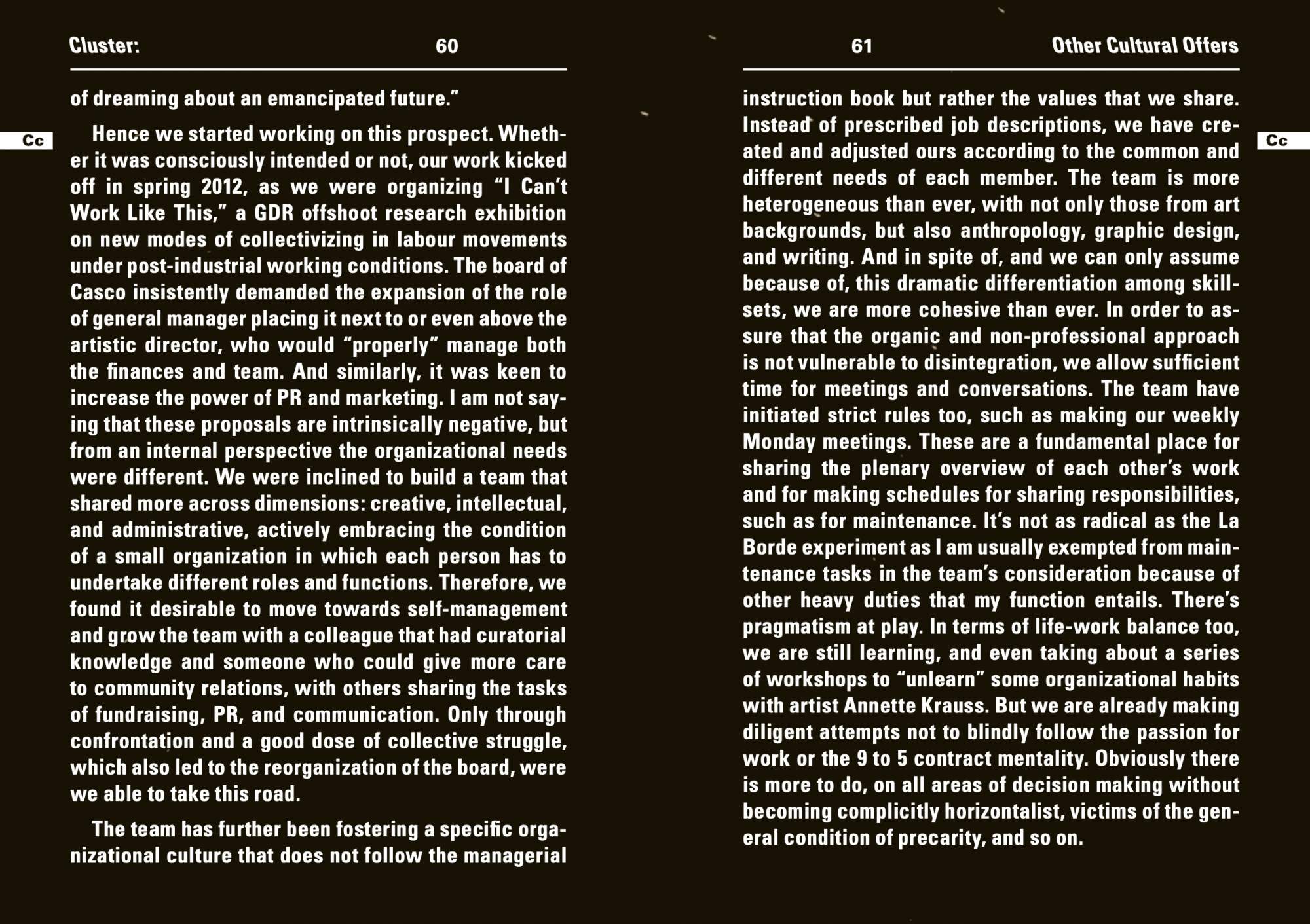 The book includes essays by Andrea Phillips, Mark Fisher and Nina Möntmann, Marion von Osten, and Cluster members. These are accompanied by a series of keywords that are drawn from the practices and experiences of the people who work at, visit, and live with the organizations. They have both been produced within the contexts of the projects that gave rise to them, as well as written especially for the publication. The contributors include Can Altay, Ayreen Anastas and Rene Gabri, Pierre Bal Blanc, Alexandre Baudelot, Ferran Barenblit, Ricardo Basbaum, Binna Choi, Céline Condorelli, Cooperativa Crater Invertido, Eyal Danon, Julien Duc-Maugé, Udi Edelman, Mark Fisher and Nina Möntmann, Daniel Foucard, Dora Garcia, Rebecca Gordon-Nesbitt, Elaine W. HO, Annette Krauss, Bojana Kunst, Maria Lind, Pablo Martinez, Mattin, Sanne Oorthuizen, Marion von Osten, Emily Pethick, Natasa Petresin-Bachelez, Andrea Phillips, Tadej Pogacar, Dimitrina Sevova, Simon Sheikh, Louise Shelley, Steven Ten Thije, Mathilde Villeneuve, and Jason Waite.