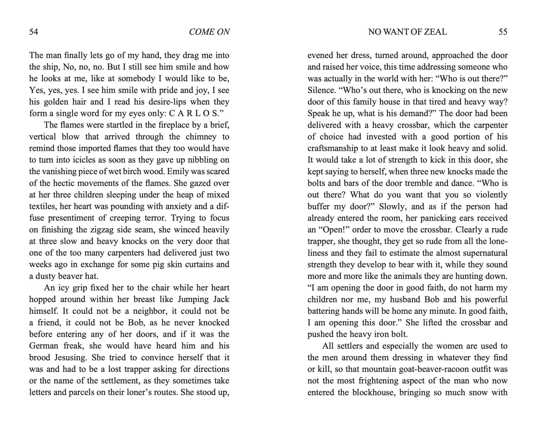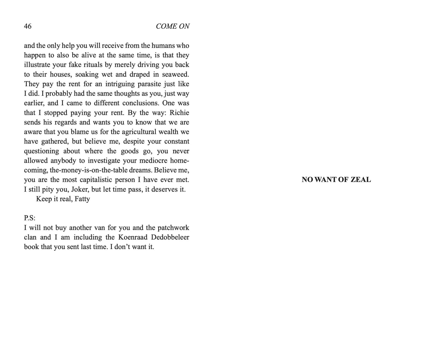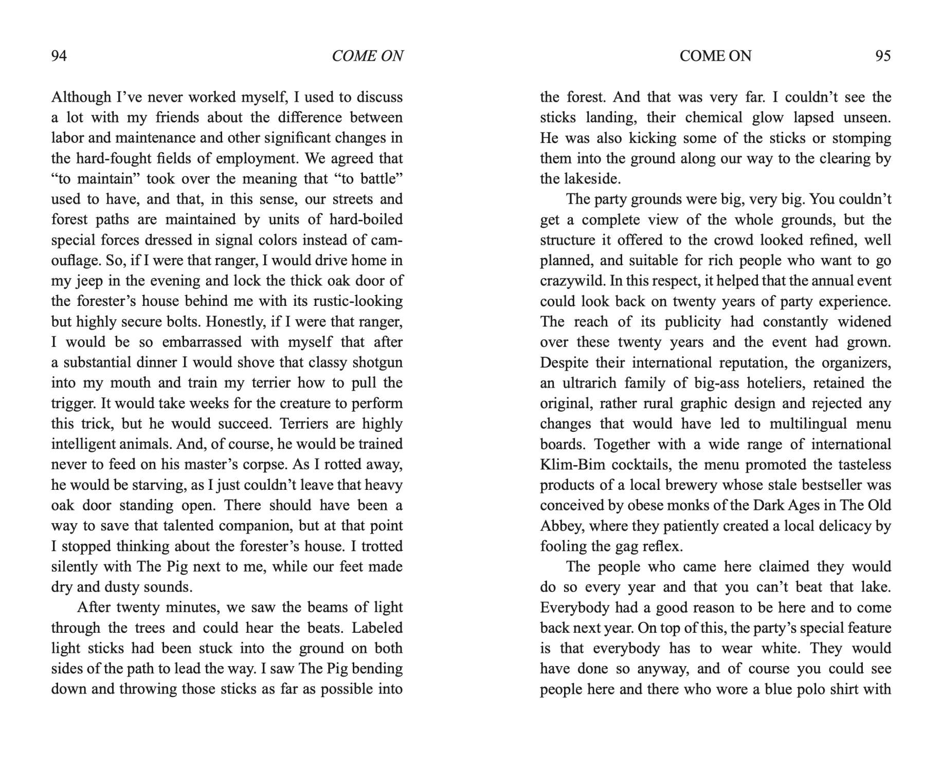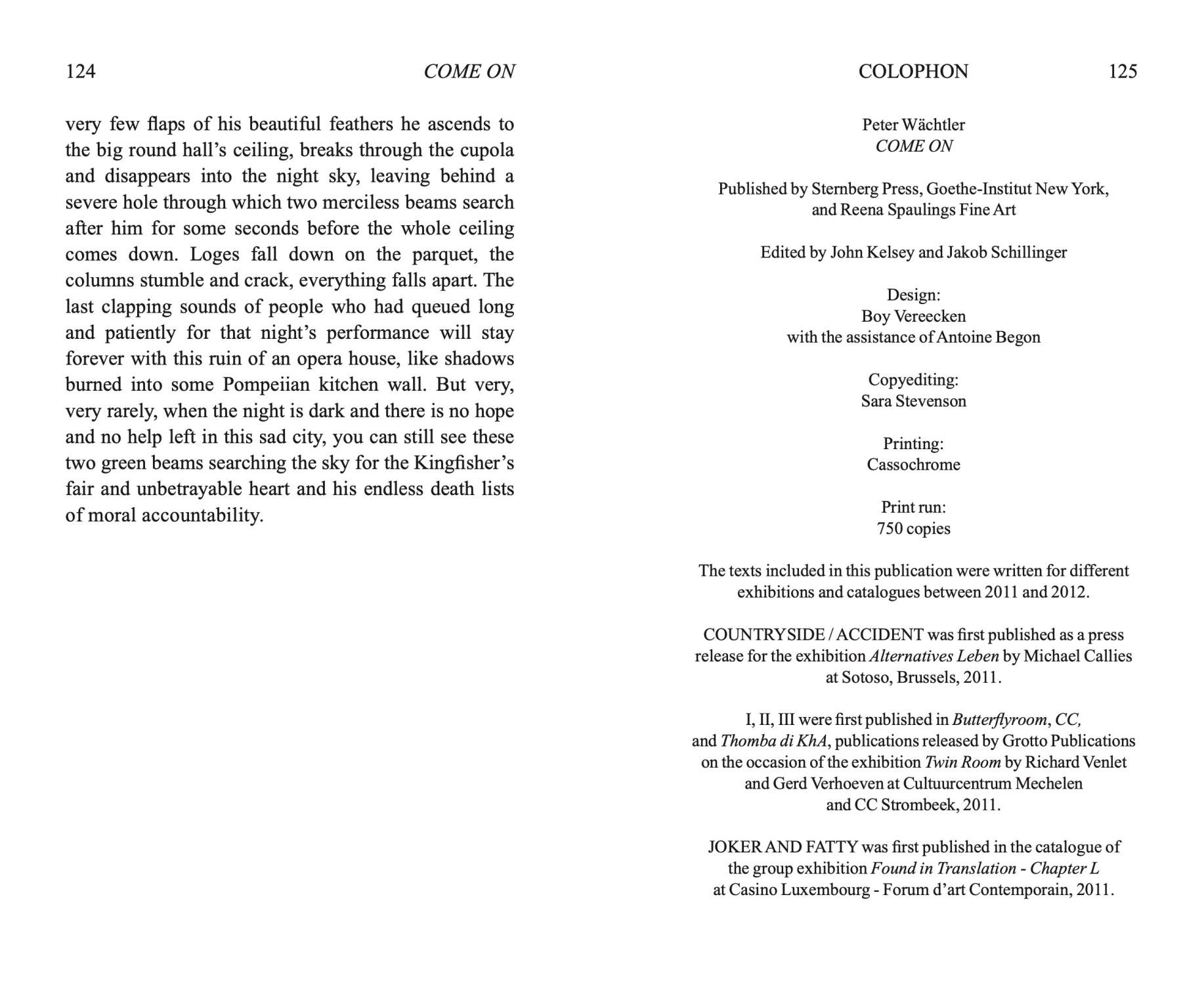 Come On is a MINI/Goethe-Institut Curatorial Residencies Ludlow 38 publication in collaboration with Reena Spaulings Fine Art. It compiles ten texts by Peter Wächtler written between 2011 and 2013.