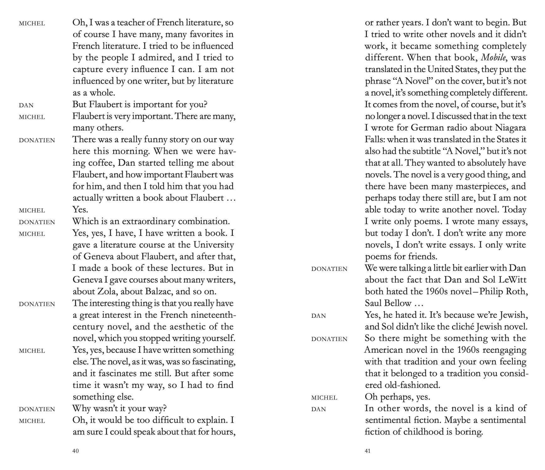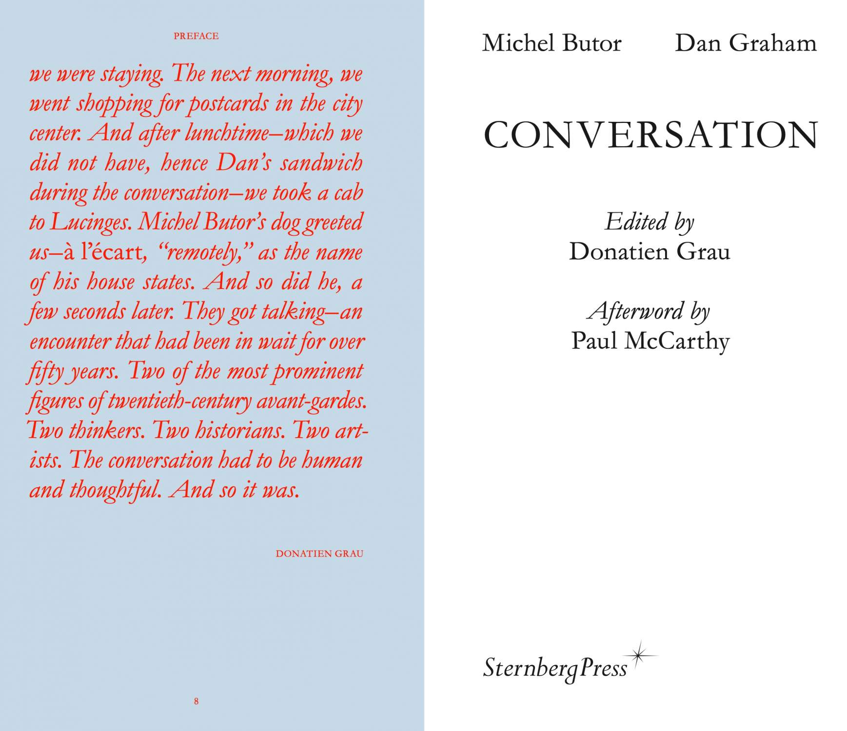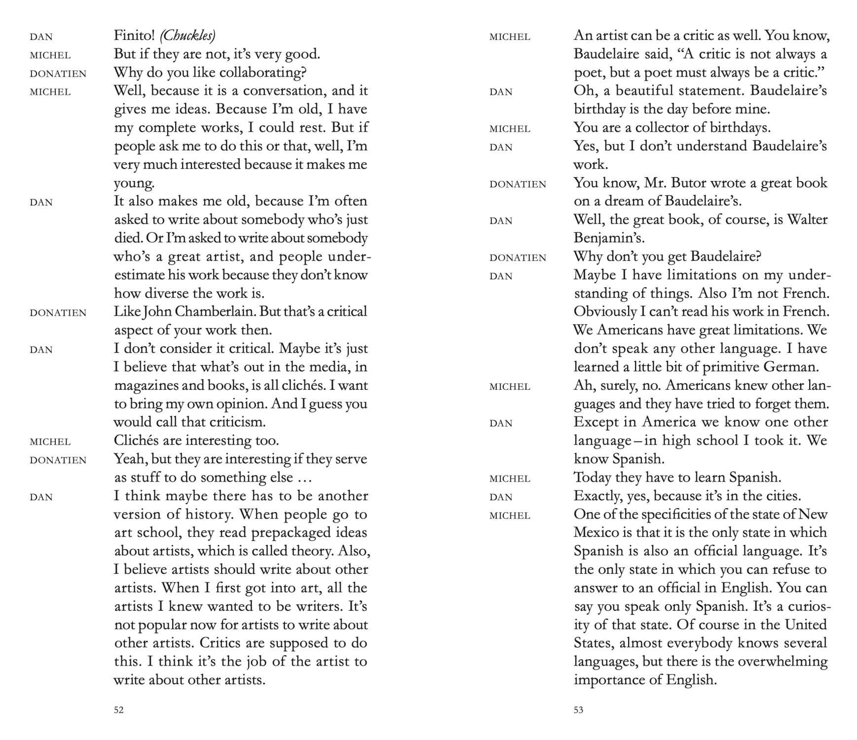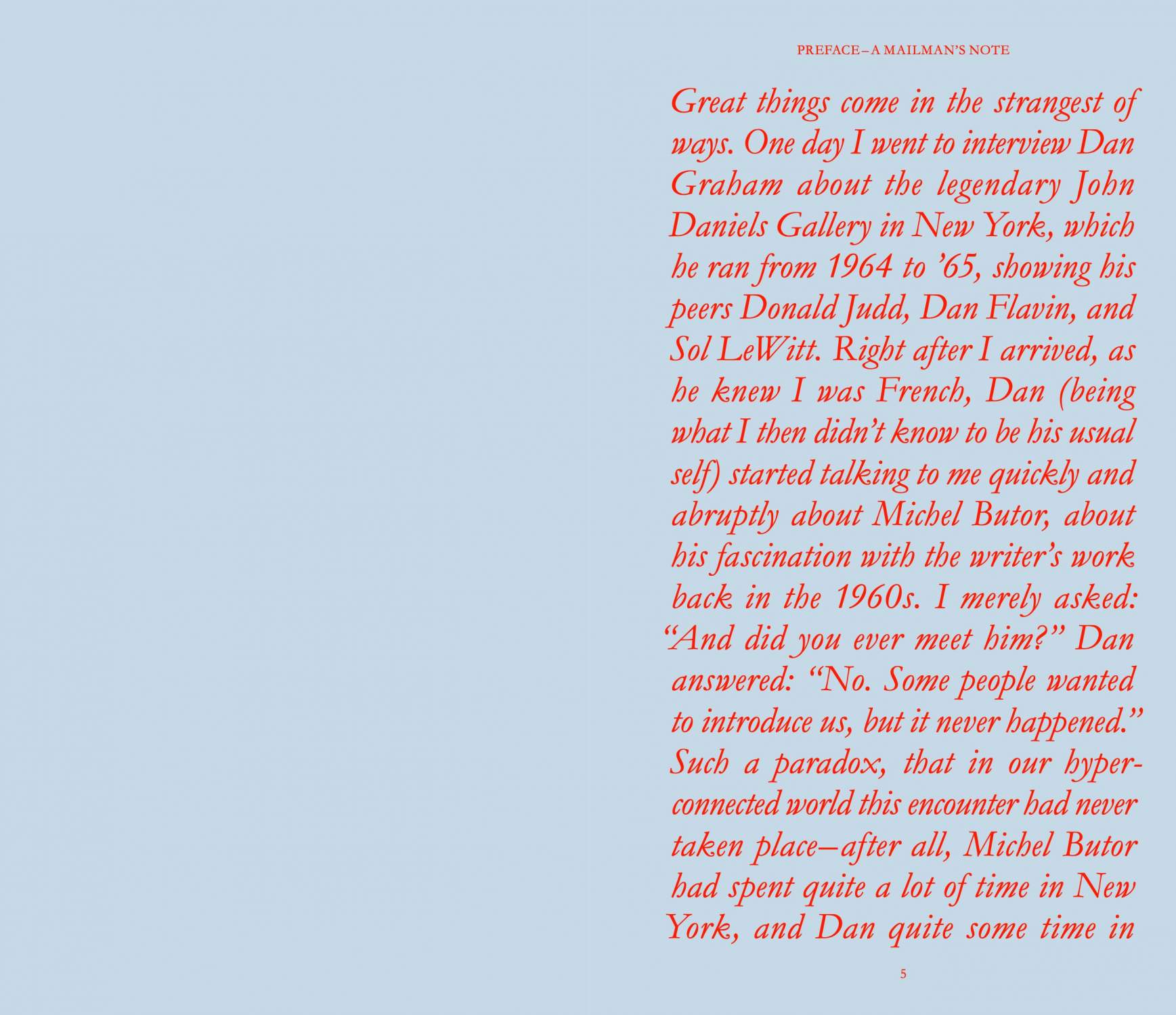 One day I went to interview Dan Graham about the legendary John Daniels Gallery in New York, which he ran from 1964 to ’65. Right after I arrived, Dan started talking to me about Michel Butor and his fascination with the writer’s work back in the 1960s. I merely asked: “And did you ever meet him?” Dan answered: “No. Some people wanted to introduce us, but it never happened.” I asked: “And would you like to meet him?” And he said, with his very own smile: “Of course I would.”