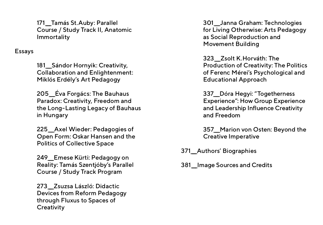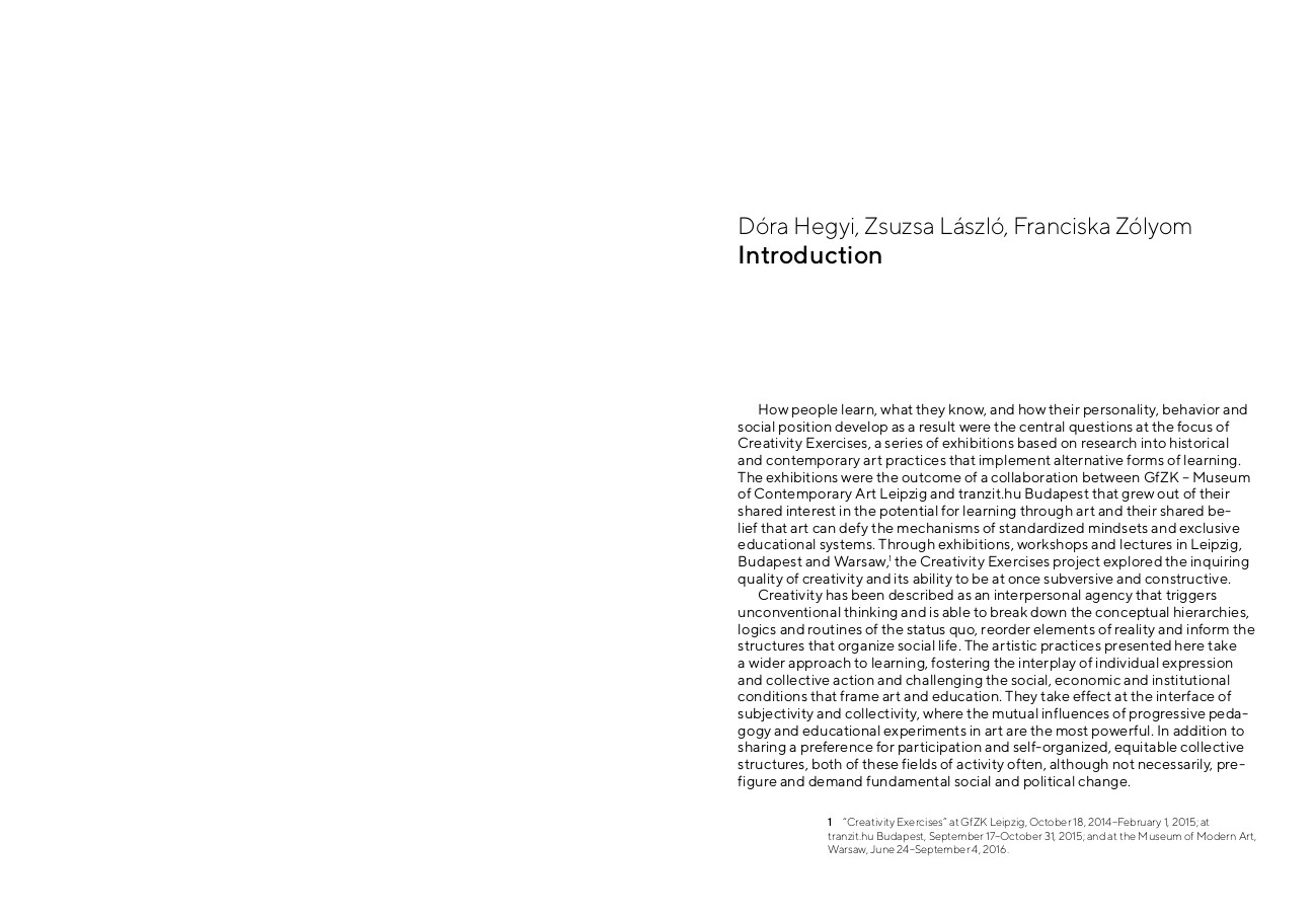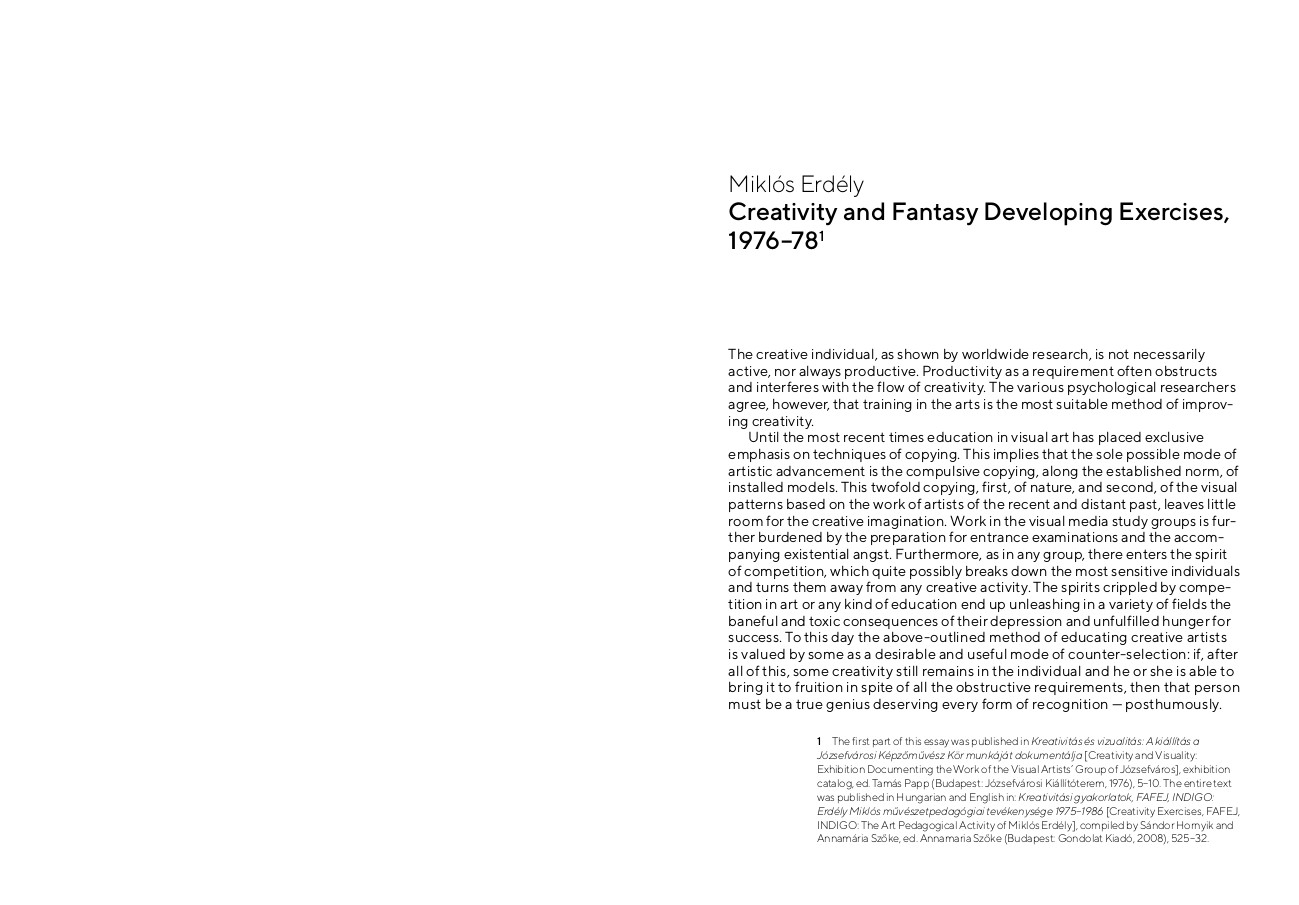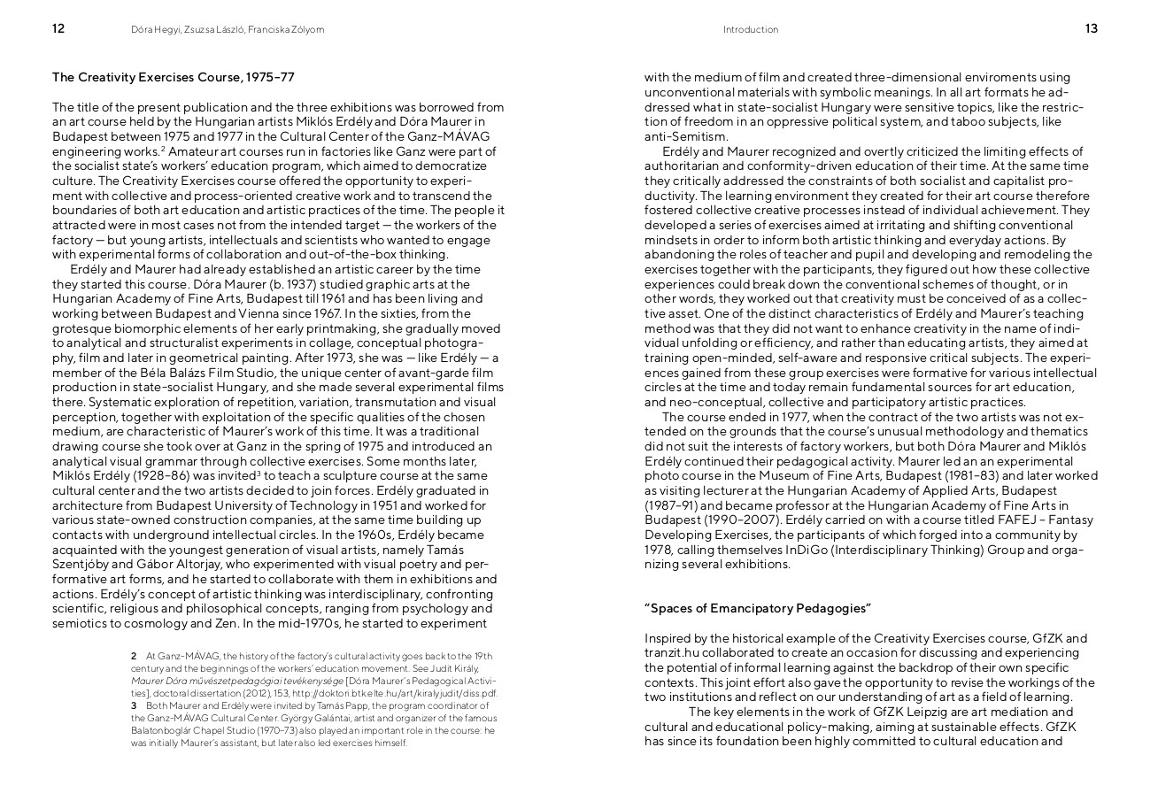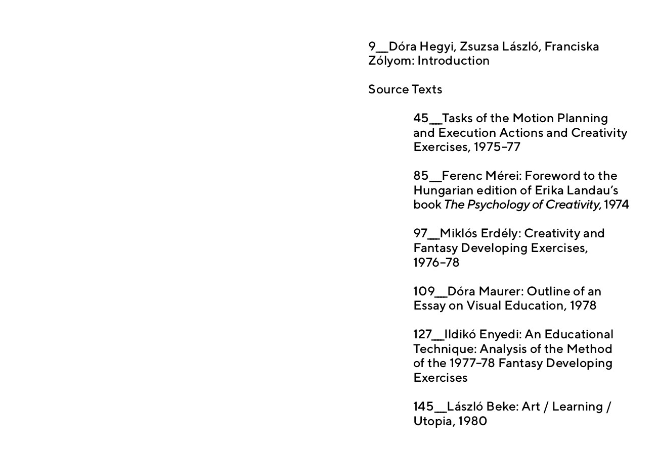 The book contextualizes the Creativity Exercises—an amateur art course led by neo-avant-garde artists Miklós Erdély and Dóra Maurer in Budapest from 1975 to 1977—within the postwar intellectual networks that connected artists, architects, educators, sociologists and other socially engaged professionals, fostering the exchange of ideas and concepts and making connections between different fields of knowledge. The first part of the publication consists of historical texts translated into English for the first time, including the exercise descriptions that functioned as the curriculum for the Creativity Exercises, studies written on the methods employed in the Creativity Exercises course, and parallel models for progressive pedagogies and art education. In the second part of the book, newly commissioned essays offer historical and transnational context for the “case study” of the Creativity Exercises course. The impact that such “creativity exercises” had on aesthetic, educational and institutional concepts, and the impulses for participation, co-creation, knowledge production and exchange that they continue to give—even beyond the realm of art—are the central themes of the book.