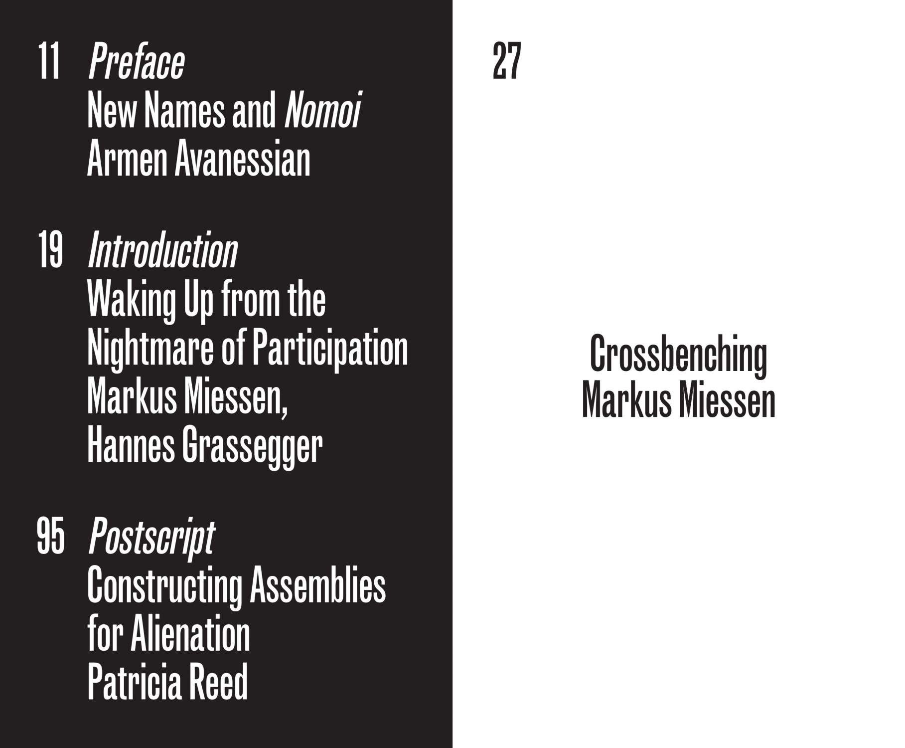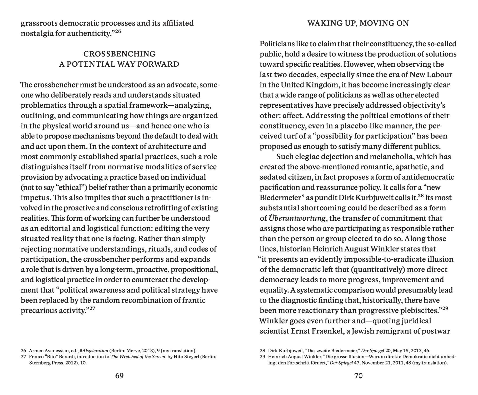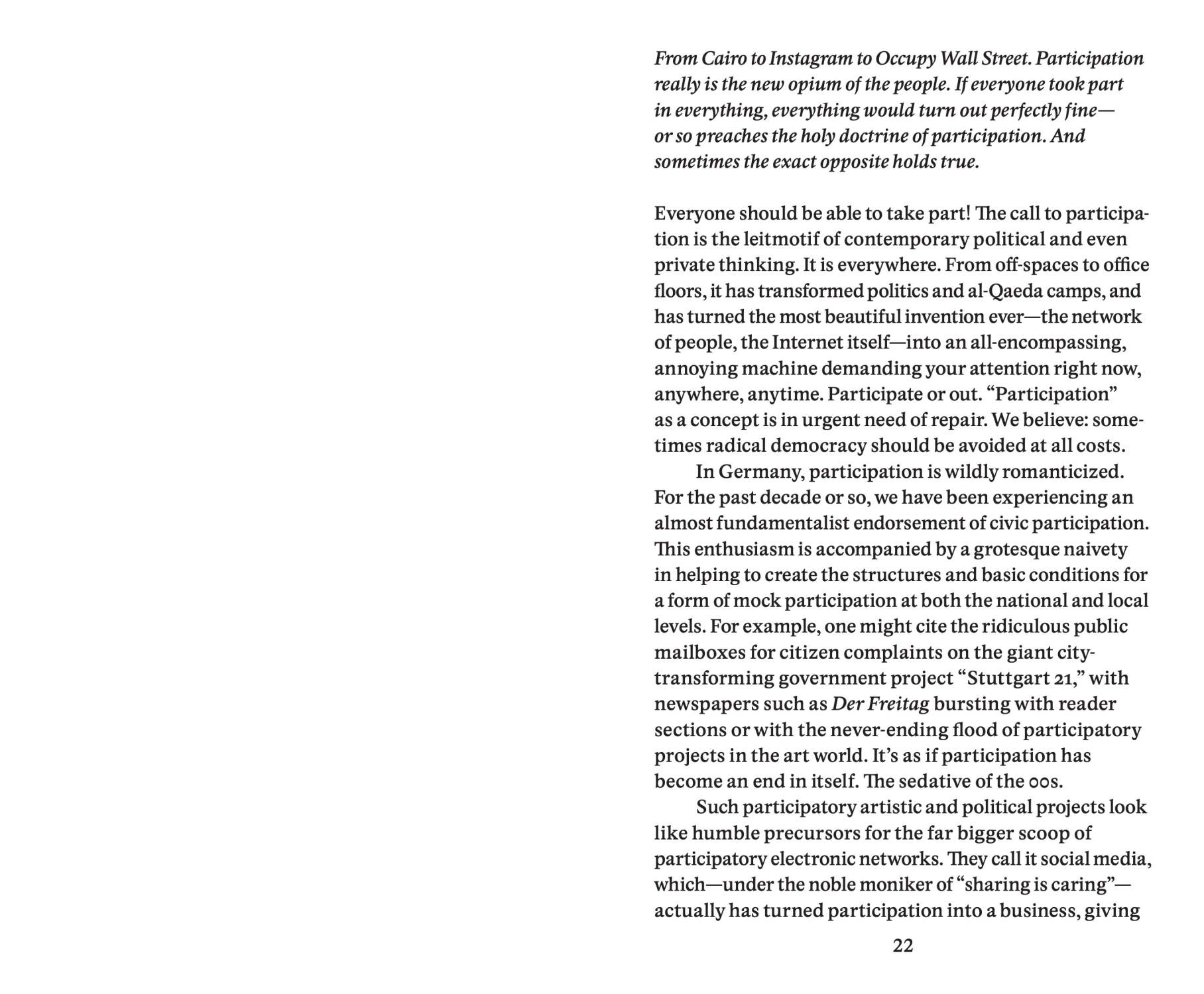 “Miessen’s new book depicts in a challenging and projective manner the problem of politics in times of conceptual indeterminacy, where ‘participation’ of the civil society seems to become the salvation for the political mess we are in, especially in Europe. Well, it is not! ‘Participation’ will not eradicate the Front National, and more transparency will not deprive Orbán of his power. Civil society will not gain power by criticizing or demonstrating loudly against the European system or chatting on the Internet. The populists have understood that if you want power, you need parties. What we risk to lose in that participatory game is representative democracy in its current shape and for no good: the majority of the street is no democracy. The post-structuralist hype for participation fuels into the mills of those who want to play la volonté de tous against la volonté generale, to go back to Rousseau: yet, the plebs killed Socrates in Athens.“