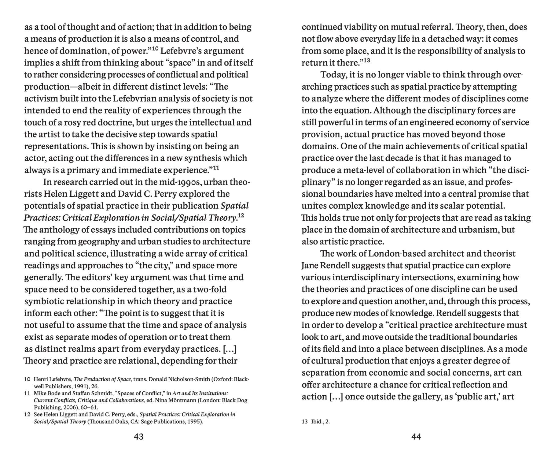 “At the heart of this book is a simple and profound proposition: to ‘do' architecture is to immerse oneself in a conflictual process of material production—participation is not a productive encounter of multiple practitioners and stakeholders, but a set of conflicts, negotiations, maneuvers, and swindles between and within a multiplicity of agents, human and nonhuman alike—equally including architects, clients, financiers, and builders, say, but also silicon, plastic, concrete, each with its conflicting aims and different material means to achieve them. Every building is thus the materialization of such encounter. So, despite the hubris of the field, none of the parties to such an encounter can ultimately control that the result—architecture (unlike real estate), according to Miessen, belongs to no one but affects and is affected by everyone—and this proposition asks that we reframe questions of ethics and politics. They can no longer be the property of an individual but a collective set of interrelations—it is through such profound departure from the terms of architecture that Miessen’s new book demands nothing less than to reimagine how we might finally become citizens.”