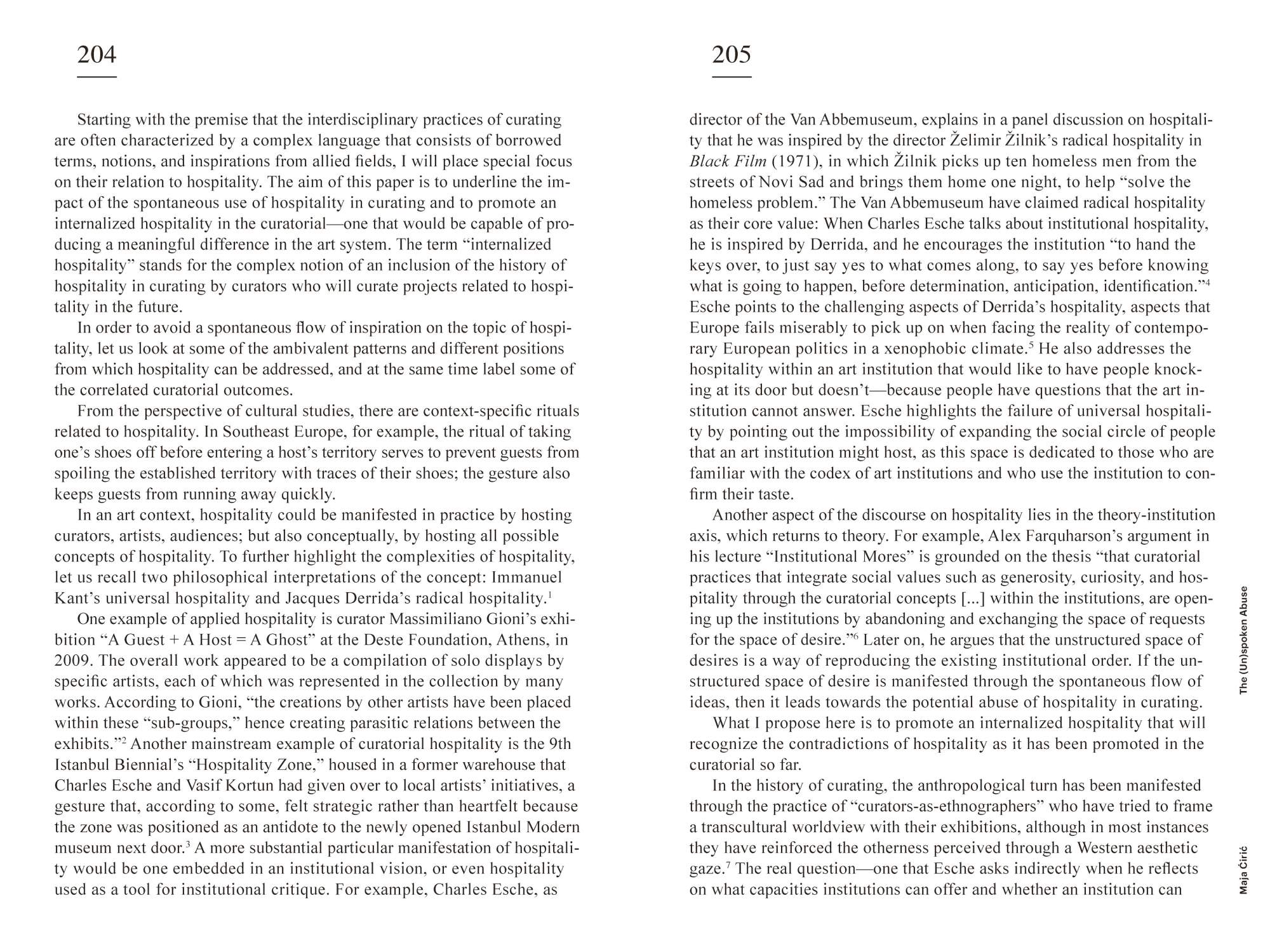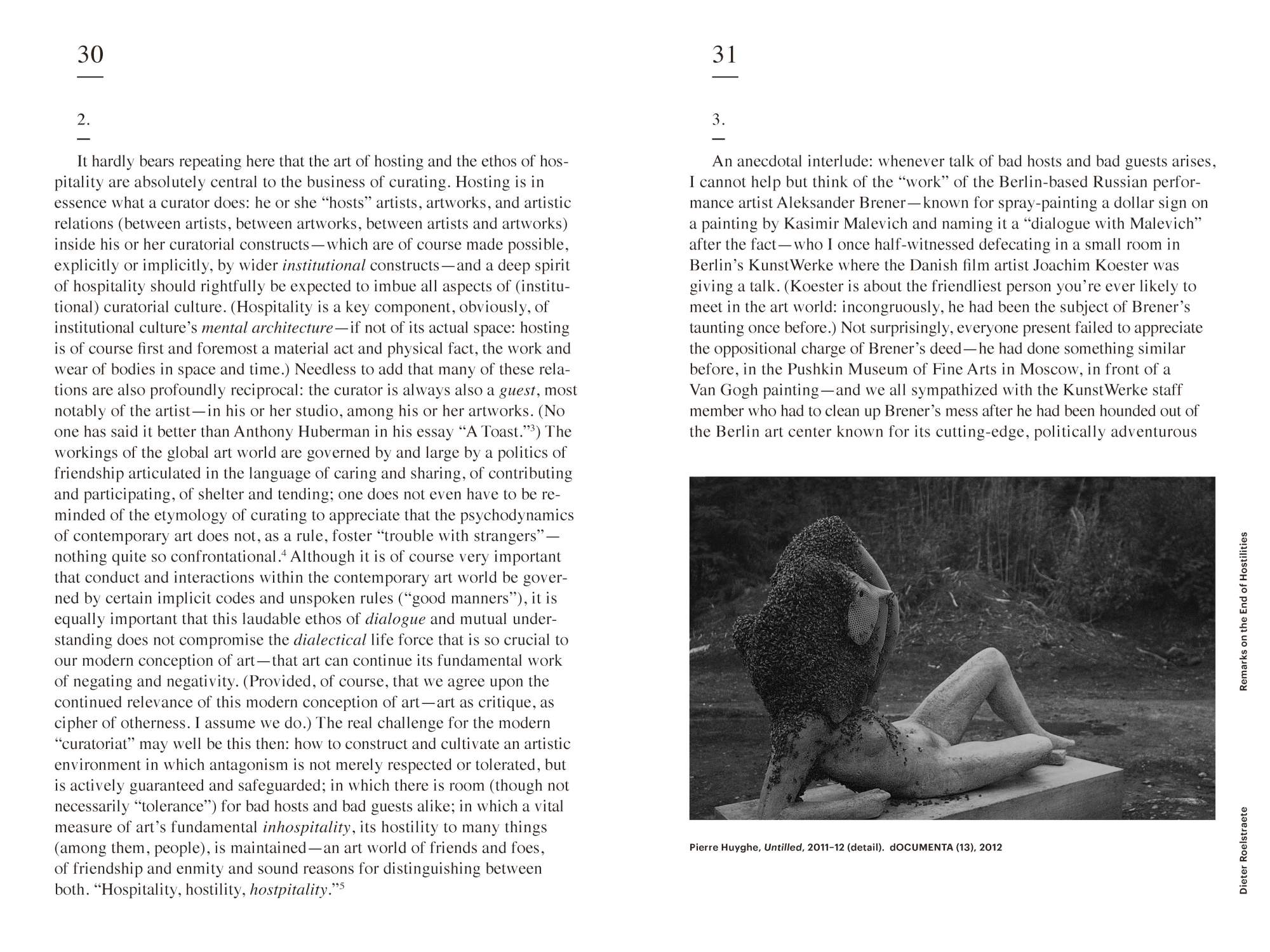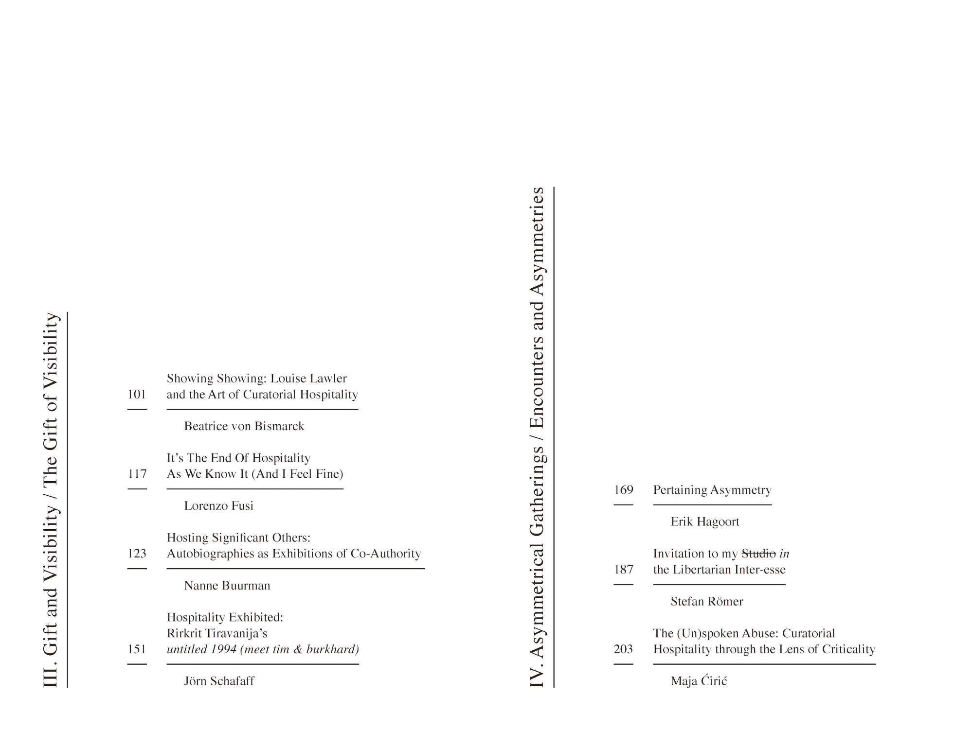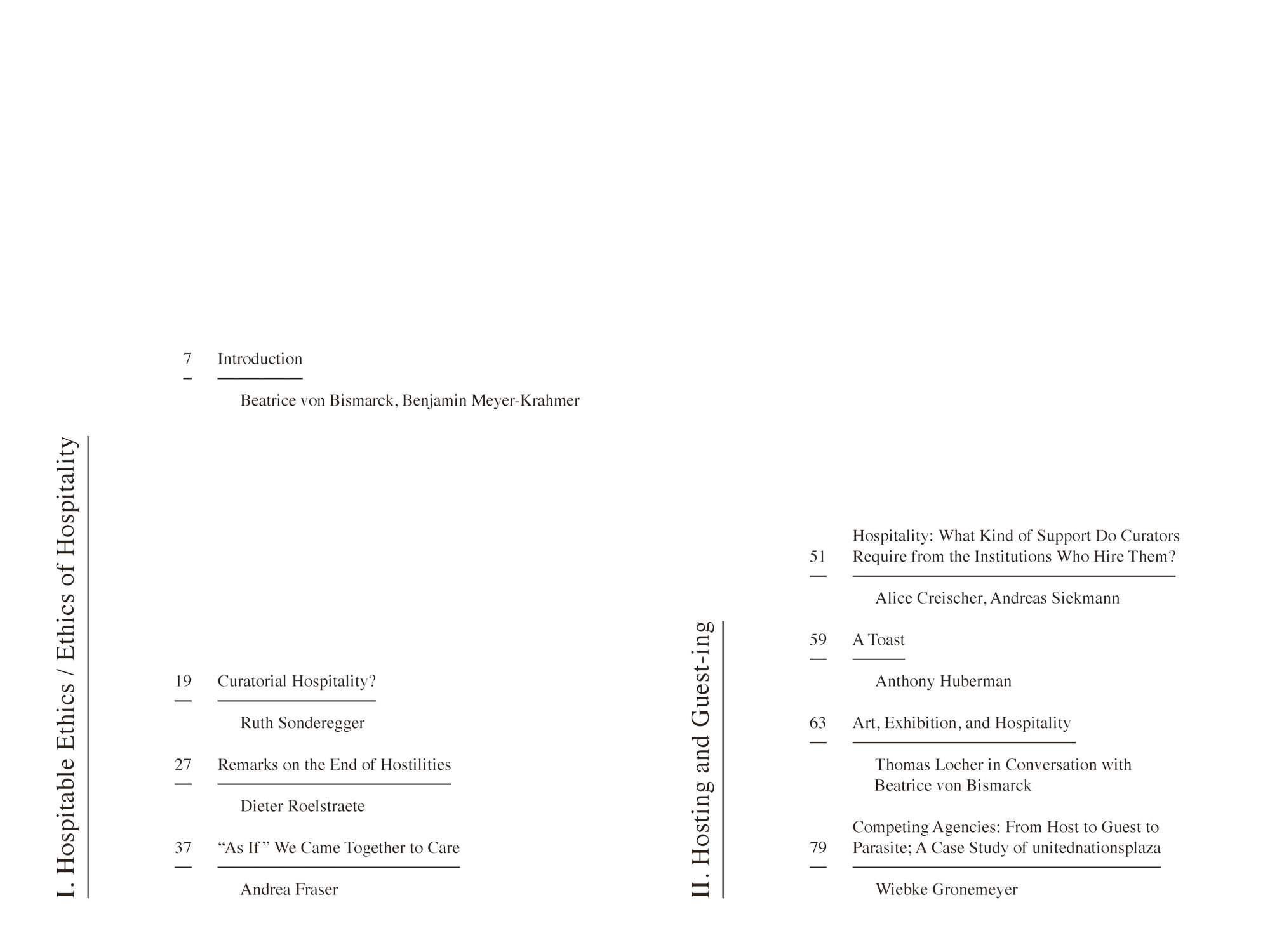 A curatorial situation is always one of hospitality. It implies invitations to artists, artworks, curators, audiences, and institutions; people and objects are received, welcomed, and temporarily brought together. It offers resources for material and physical support while also responding to a need for recognition, respect, or attention. Finally, and very importantly, a curatorial situation operates in the space between an unconditional acceptance of the other and exclusions legitimized through various rules and regulations.