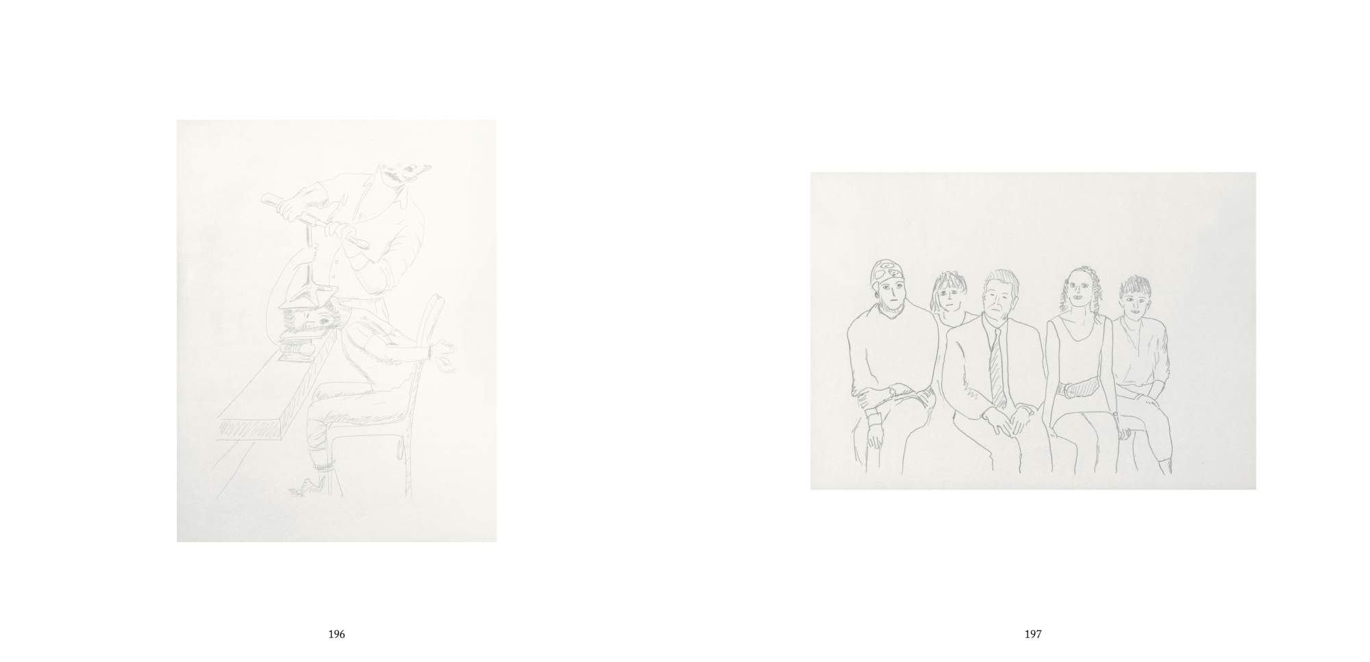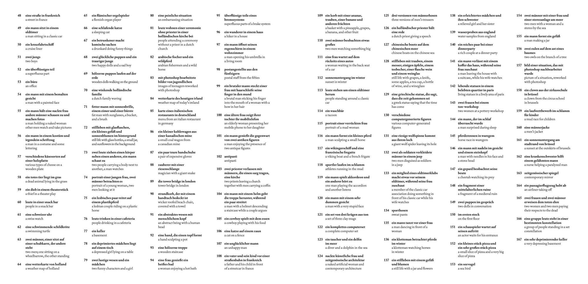 Like a pictorial encyclopedia, Das Wunder des Lebens contains over four hundred drawings that show all that the modern world has to offer, from maps and city views to cars and airplanes. However, unlike conventional pictorial dictionaries, there is no symbolic system. We see laundry bags and paint buckets as well as a nun and a man with a hat in front of a double window, a shy animal with a thick fur, and breakfast on a Victorian table. Juxtapositions are normalized, and normality becomes a farce. Everything is exposed to everyone; everything becomes equal.