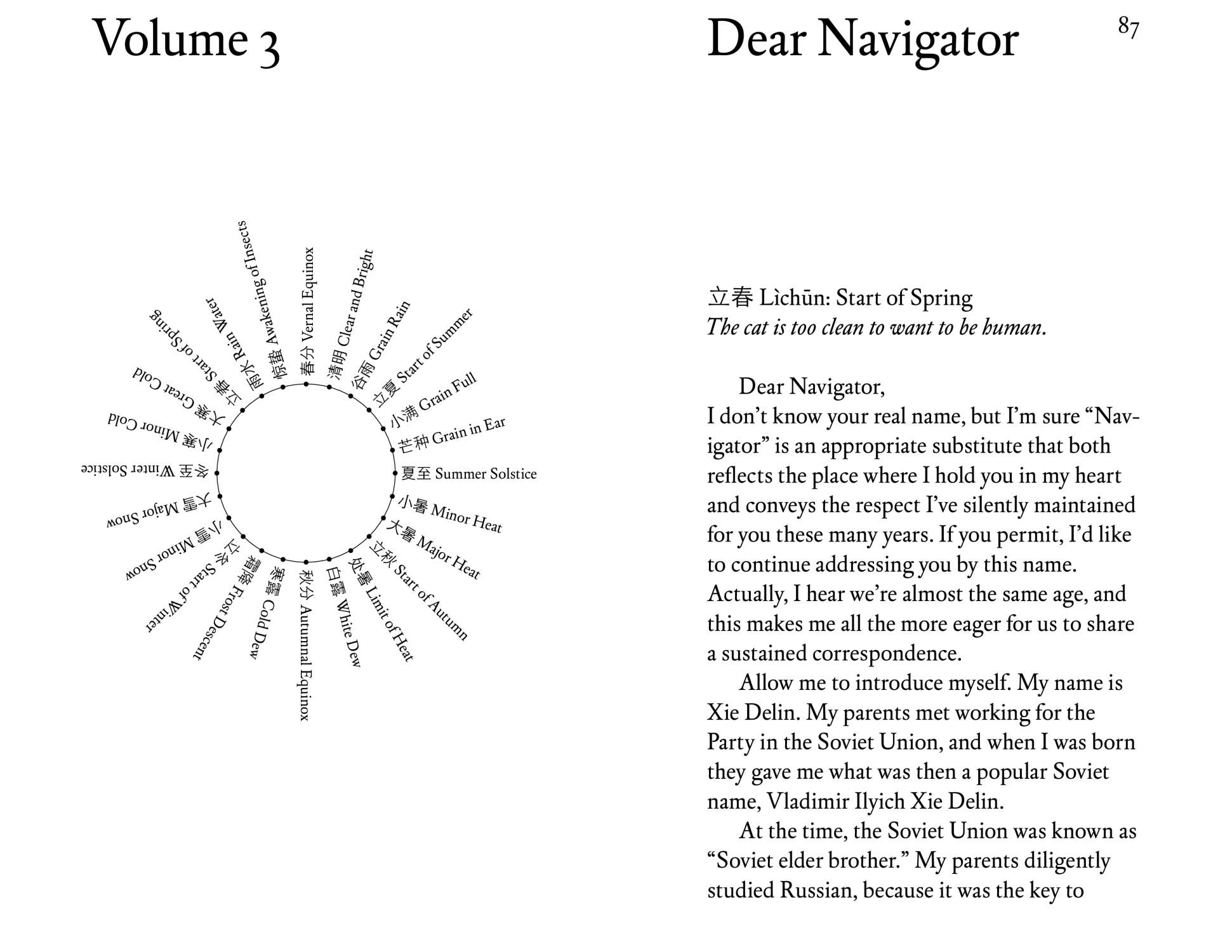 Hu Fang’s Dear Navigator is a collection of ten short stories that reflect on contemporary society, politics, and the human condition. The author takes us on a journey across time and space to hidden realities where we meet culture workers, astronauts, airplanes, Zen masters, and hunger artists. The title story “Dear Navigator” is a collection of letters written during a 520-day simulated space mission to Mars—to test if humans can endure travel from Earth to Mars and back again. “Whale Song” tells the story of XP, a lonely male escort, as he goes on a surreal journey to self-realization, and “The Shame of Participation” tells a tale of two thieving artists who legally steal objects from those living in a city in desperation. When the reality turns into fiction, and the science fiction becomes reality, Hu draws on the experience of everyday life, the past, and the unknown future to create stories of otherworldly melancholy and humor.