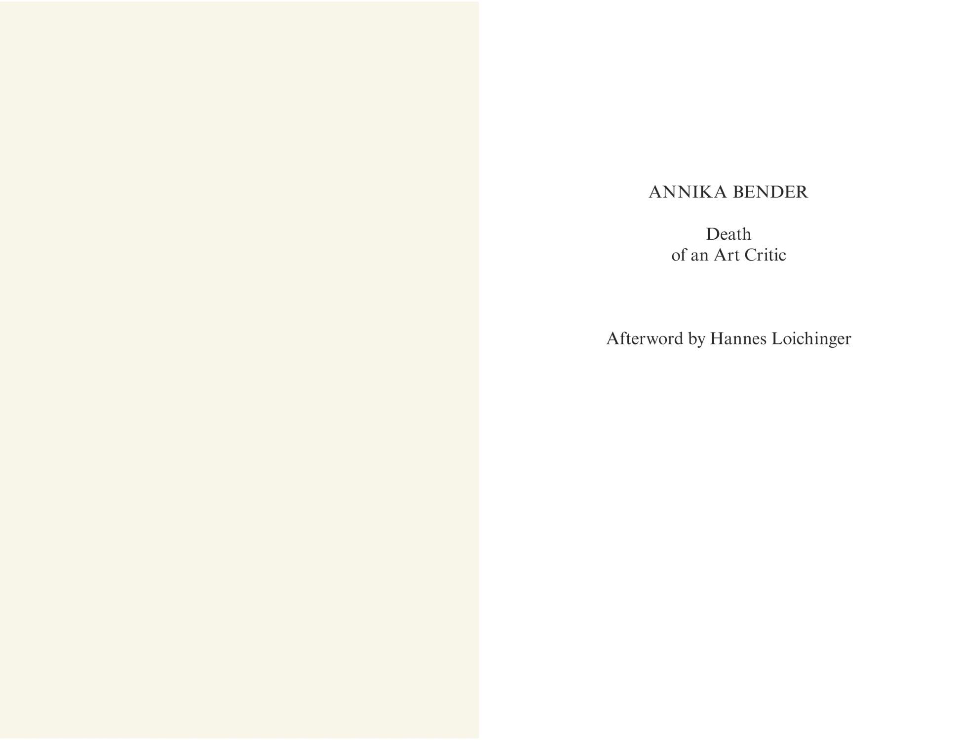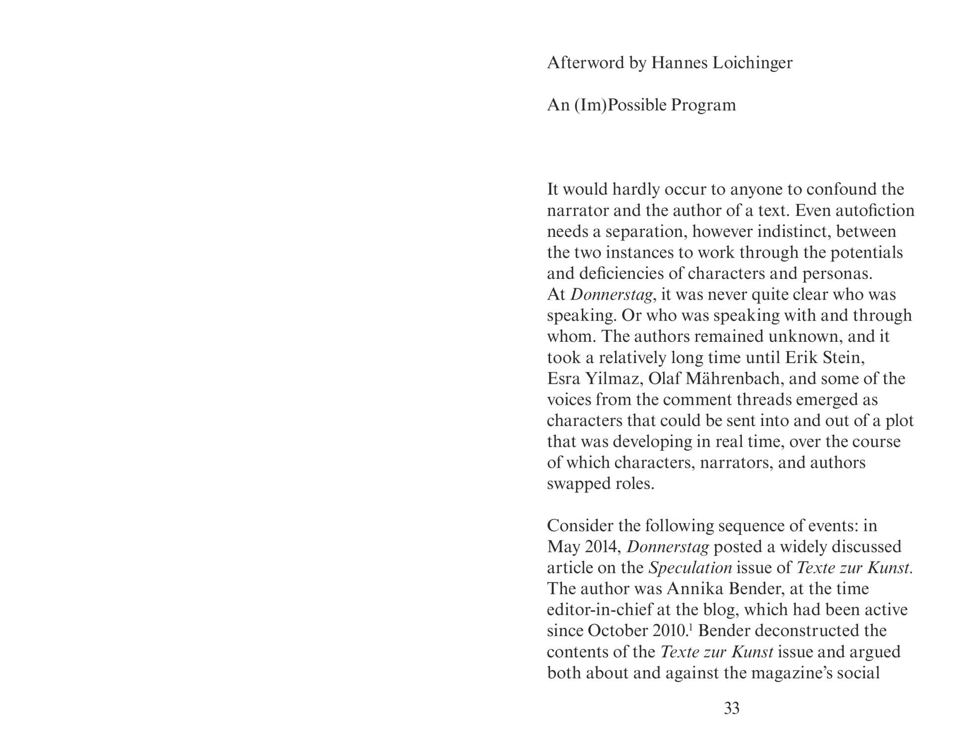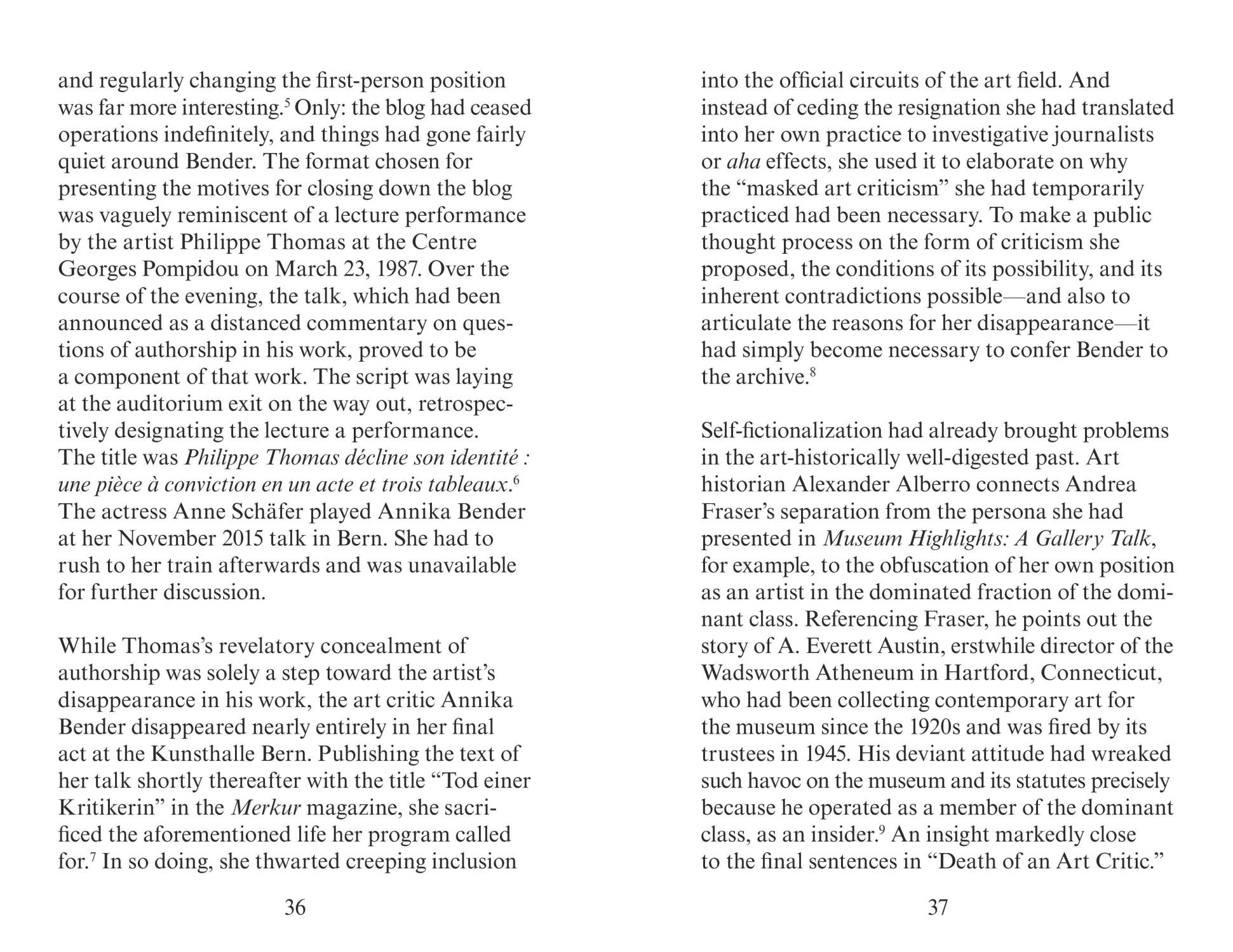 This book is an adaptation of Annika Bender’s lecture “Jump! You Fuckers!” which was presented at Kunsthalle Bern in the context of a series on overproduction and ambivalence in contemporary art. Annika Bender was one of the pseudonyms of artists Dominic Osterried and Steffen Zillig, who wrote the blog Donnerstag (now discontinued) under her name. To make the criticism she proposed possible, and make public its conditions and inherent contradictions—as well as articulate the reasons for her disappearance—it proved necessary to confer Bender to the archive.
