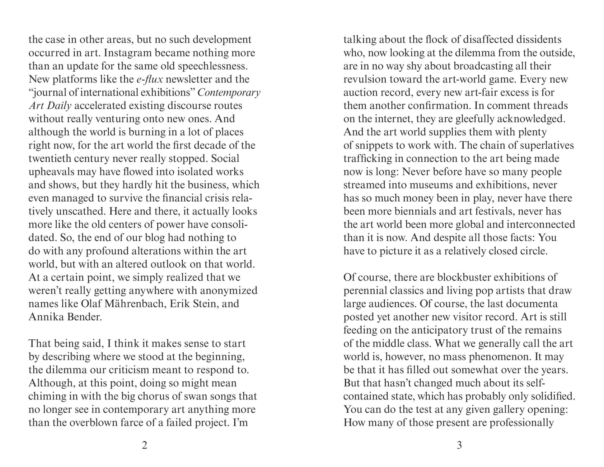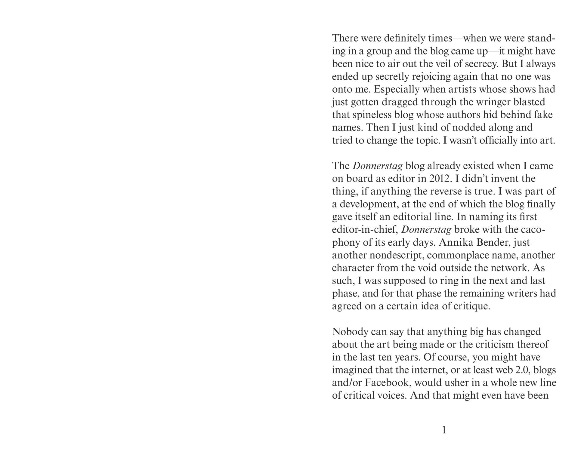 “The idea behind Donnerstag was to insist on the difference between good art and bad art. I am aware of how anachronistic that sounds and how quickly it evokes the image of an old critic-pontiff wagging his authoritarian pointer finger. But even that image is founded in a misunderstanding: the caricaturesque exaggeration of the critic’s voice as dictatorial. But it’s really nothing more than that very voice. And it pronounces a judgment that is not juridical, but ideally worth nothing more than the argument at its core. It’s far more authoritarian and antidemocratic to deny a public voice the act of judgment and concede to a postheroically styled art writer nothing more than the task of pointing at something. […] Whoever just leaves it at that has also parted ways with any hope of open rivalry between arguments.”
