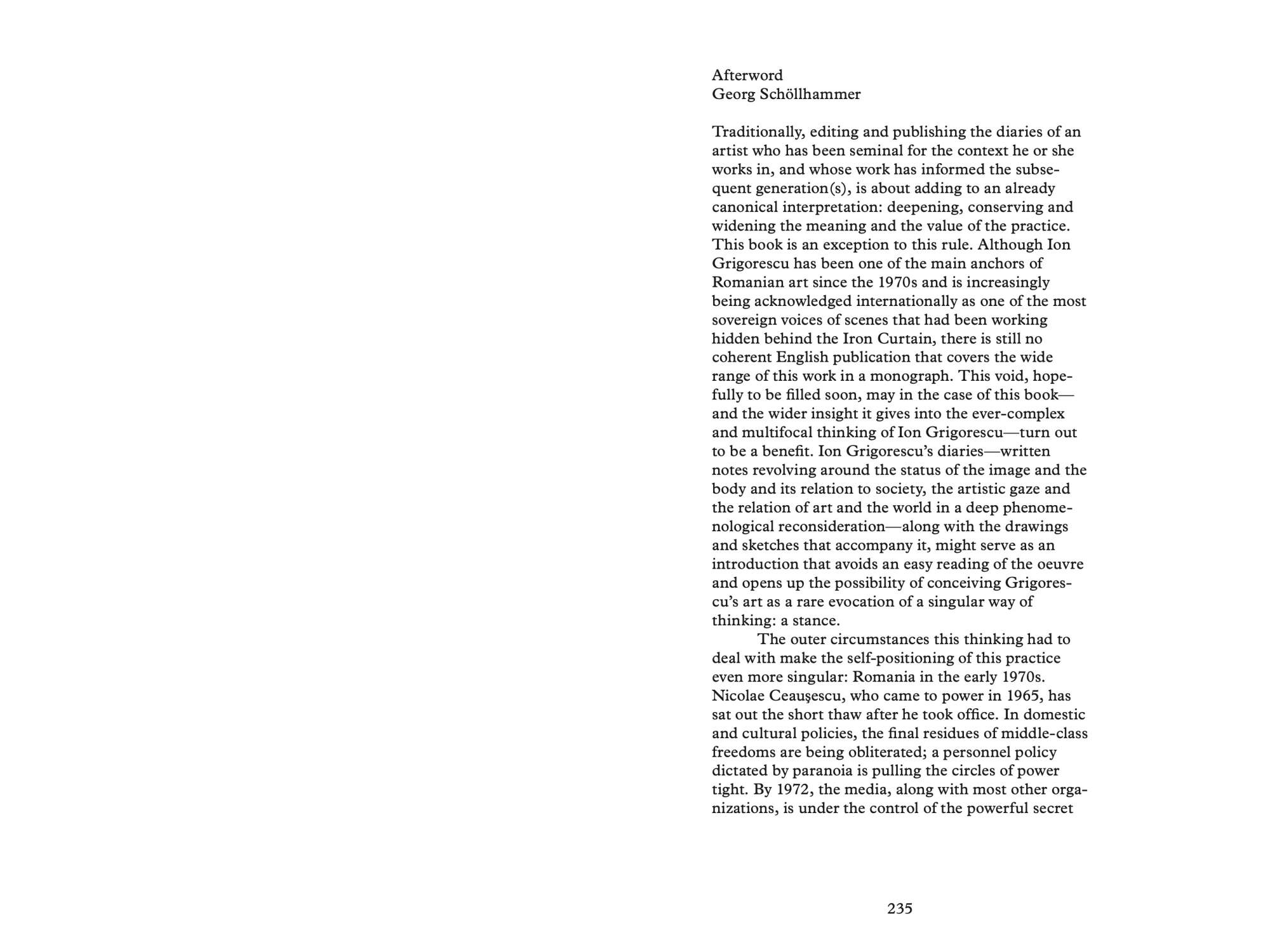 Ion Grigorescu is one of the seminal visual artists of his generation in Eastern Europe. In recent years, his complex body of work has attracted increasing attention in the West, entailing a reading of his oeuvre through the prism of canonized Western art histories. This first English edition of his diaries from the crucial years of 1970 to 1975 is a small literary and art-historical sensation. It not only corrects the facile reading of Grigorescu’s practice in the context of Conceptual art and performance, but provides insight into the artist’s multifocal thinking, which incorporates an original critique of modernism, the dystopian effects of an instrumentalized idea of reason and rationality, an analysis of subjectivity, and a penetrating gaze into a dialectic of secrecy and elucidation, of exposure and mystification.