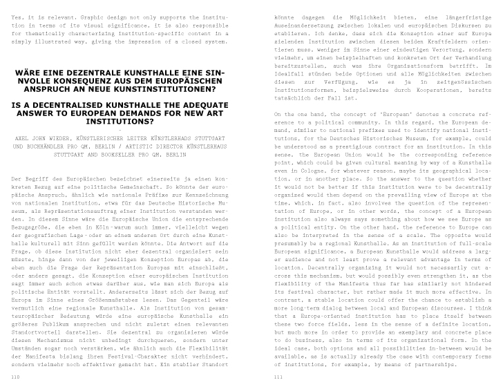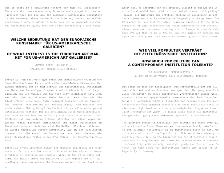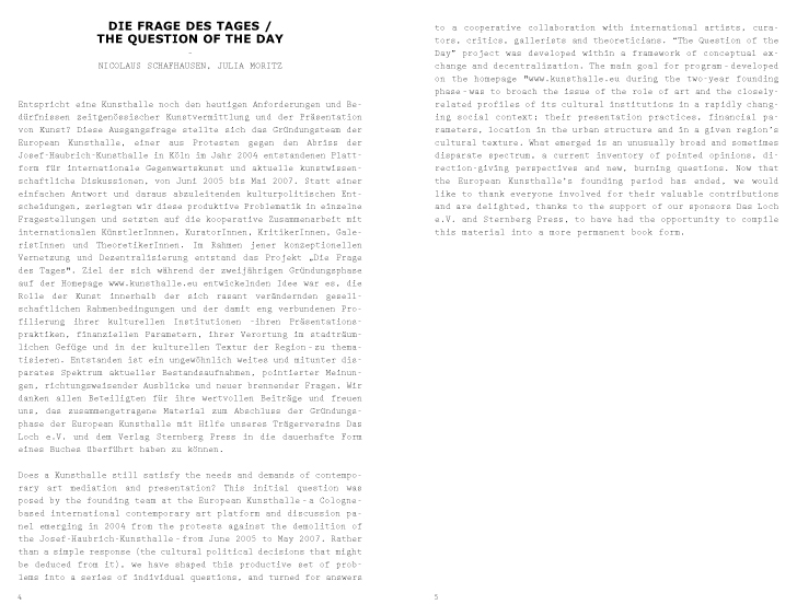 These are some of the 100 questions which have been asked over the last two years to experts from the fields of art, art theory, economics, and architecture. Their answers are gathered together in this book, published on the occasion of the European Kunsthalle project in Cologne.