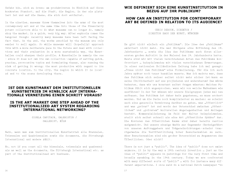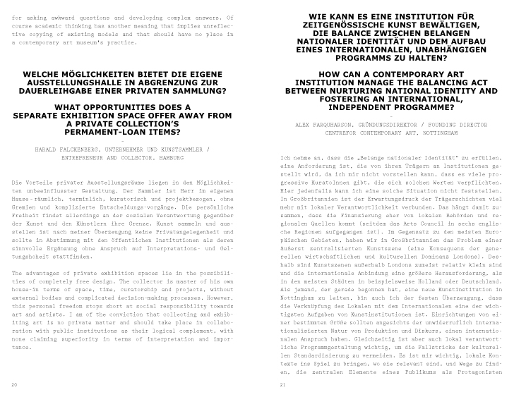 The German “Kunsthalle,” like other international institutions that deal with the visual arts, has to adapt to these changes if it wants to continue to play a relevant part. With its 100 questions and answers from major practitioners of the art world and beyond, this book helps to examine the various parameters for a new institutional model.