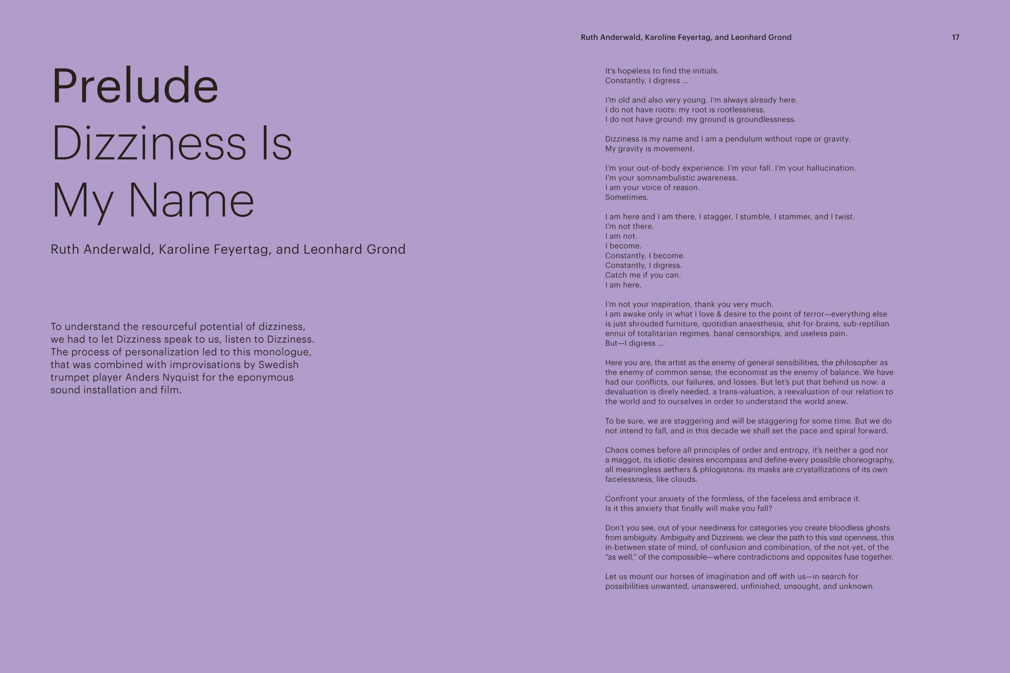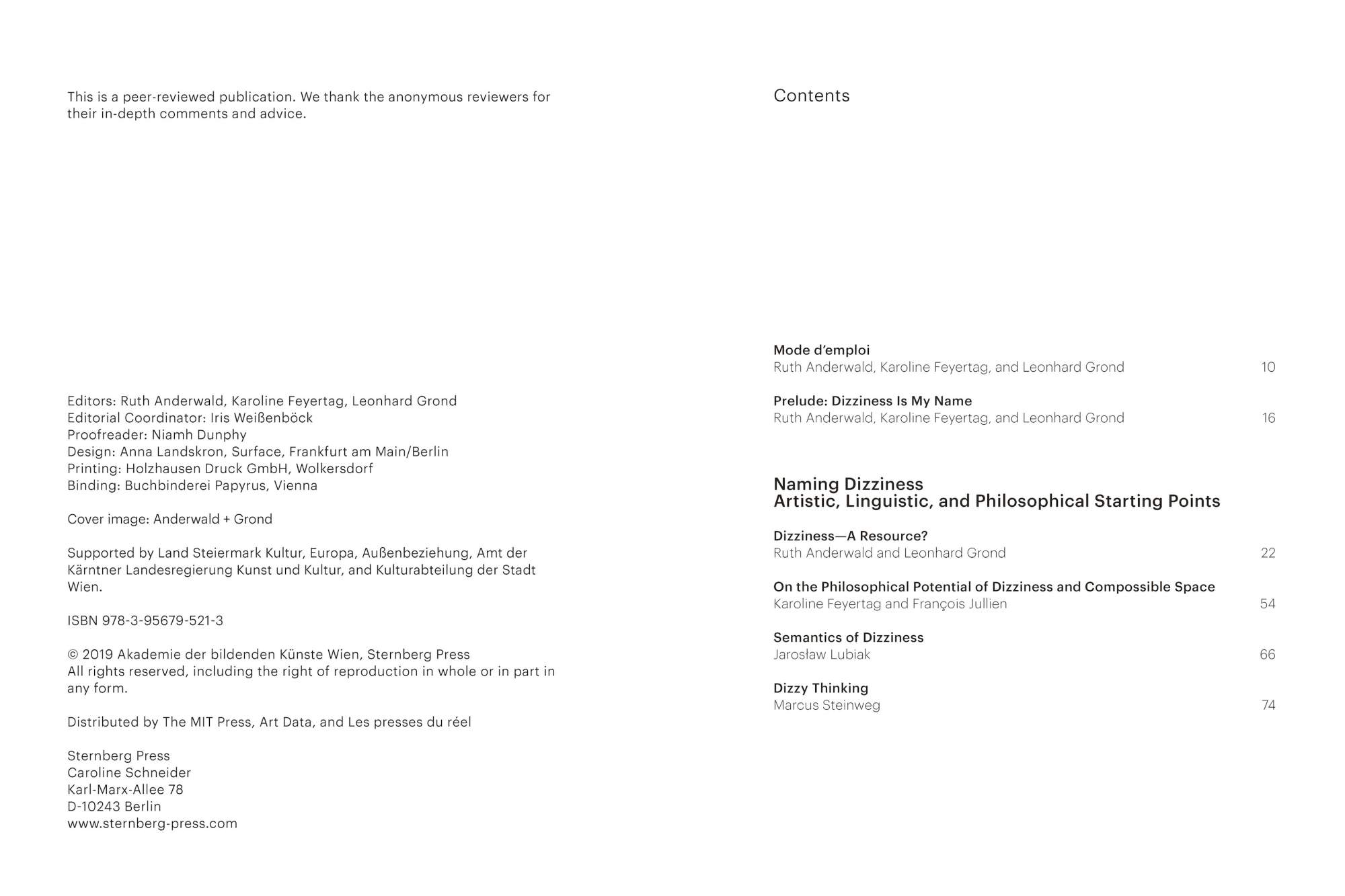 “This book gets your head spinning. While being bombarded by daily reports of crises (both real and fictional), while destabilization has become normal and feelings of disorientation, fear, and dizziness have started to prevail in our everyday lives, the contributors to this book reverse this perspective by emphasizing that dizziness is a valuable resource. Dizziness—A Resource is the result of the cross-disciplinary research project initiated in 2014 by artistic duo Ruth Anderwald and Leonhard Grond. What can we gain when balance is lost? How can anarchy and dizziness empower us? How can a cognitive vertigo fuel our cognition? Artists, scientists, philosophers, and art critics attempt to answer these questions and to show us how to navigate a world marked by unpredictable change.”