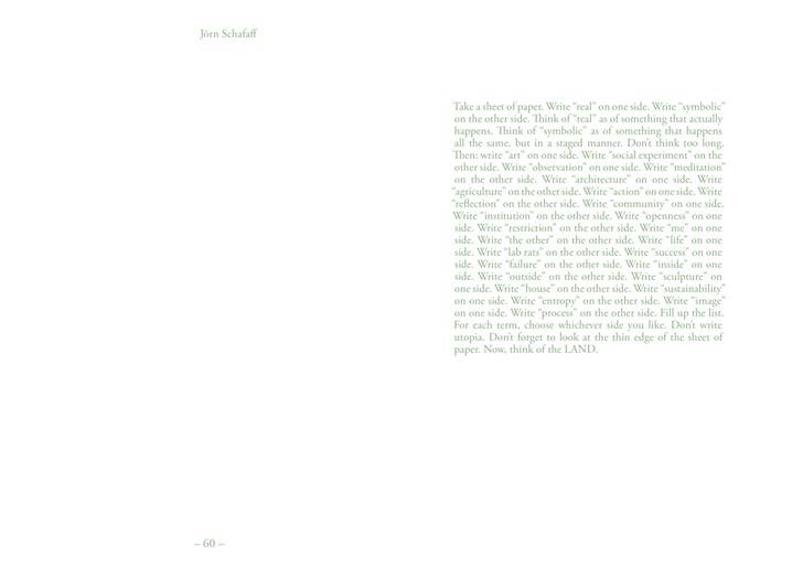 In a continuation of conversations among artists surrounding the land, this book explores urbanization in a post-rural condition, the act of building as a collaborative process, and land as a concept that can exist outside of ownership. A discussion with Hirsch, Tiravanija, Melasniemi, and Jörn Schafaff reflects on the way in which the installation builds on the land’s objectives relating to improvisation, collaboration, and the questioning of institutional structures. Also featured in the book are recipes developed by Melasniemi on the occasion of this installation-as-workshop, where the public is invited to participate in the cooking process.