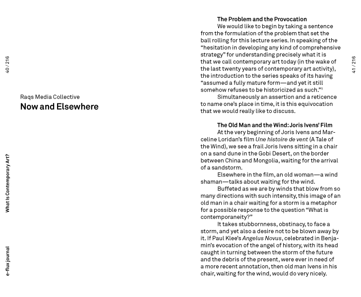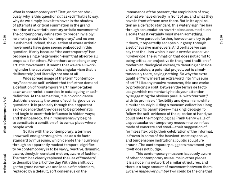 This book began as a two-part issue of e-flux journal devoted to the question: What is contemporary art? First, and most obviously: why is this question not asked? That is to say, why do we simply leave it to hover in the shadow of attempts at critical summation in the grand tradition of twentieth-century artistic movements? A single hegemonic “ism” has replaced clearly distinguishable movements and grand narratives. But what exactly does it mean to be working under the auspices of this singular ism?