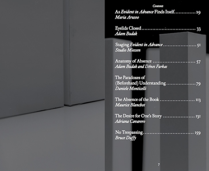 As a proposition, Farkas’s exhibition and publication for the Estonian Pavilion of the 55th Venice Biennale in 2013 is "an absent book" and yet "the book to come." The installation is a piece of spatial, rhythmical writing; a quintet of interiors woven of autonomous though intertwined, poetic fragments of quasi-domestic setting: a library, a garden, an absent cinema, a spatial book, an obsession chamber (a locus of deranged architect and non-writer). "A story? No. No stories, never again," Farkas repeats after Maurice Blanchot, while rehearsing his art of ultimate denial and rejection.