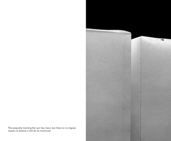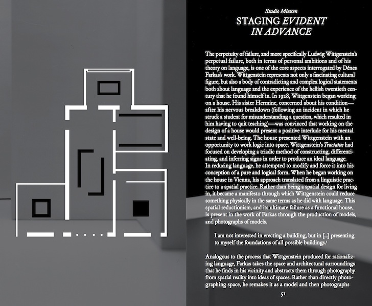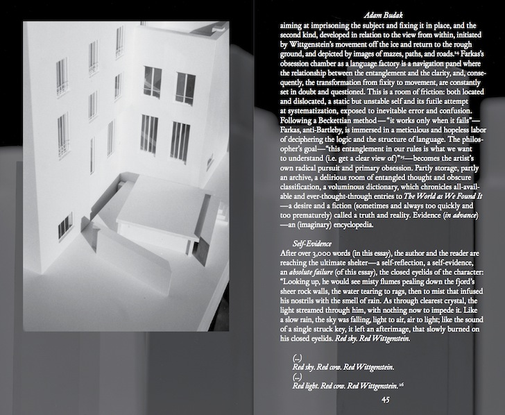 “If I don’t trust this evidence why should I trust any evidence?," Wittgenstein asked himself in "On Certainty." Dénes Farkas’s work is haunted by a drama of not delivering a trust to a singular evidence of this world: a world as he found it. Hysterically reproduced paper maquettes of choreographed architecture, imprisoned within a clumsy, photographic frame, are abstract shelters for imagined and unspoken texts. Words are characters in performance of a world as a text.