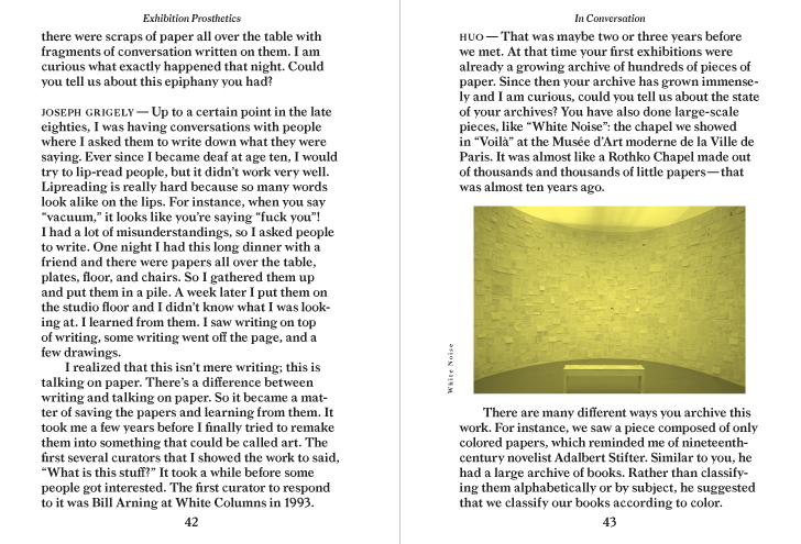 Exhibition Prosthetics by Joseph Grigely explores the artist’s use of language and images as a means of representation that further the reach of the real. Grigely uses the term “exhibition prosthetics” to describe an array of conventions, particularly (but not exclusively) in relation to exhibition practices. Exhibition Prosthetics is the first in the Bedford Press Editions series of artists’ books edited by Zak Kyes. The series will engage with publications as a primary medium of practice, enabling artists to explore the inherent constraints and possibilities of the printed document.
