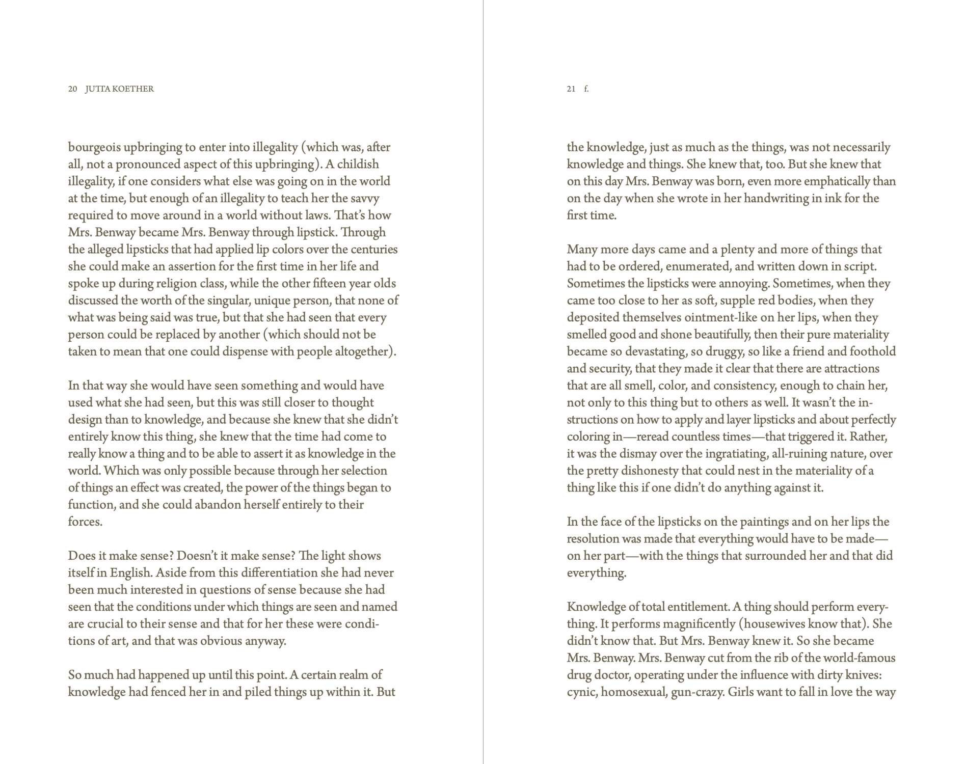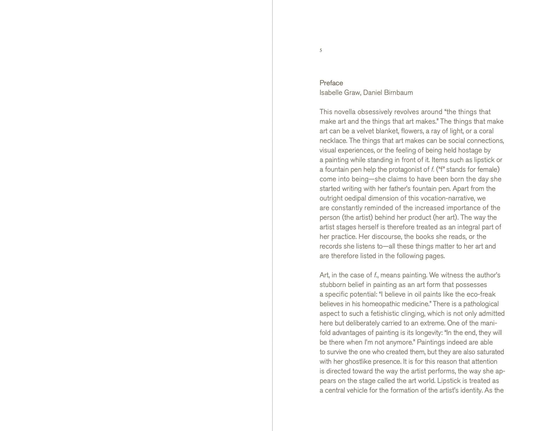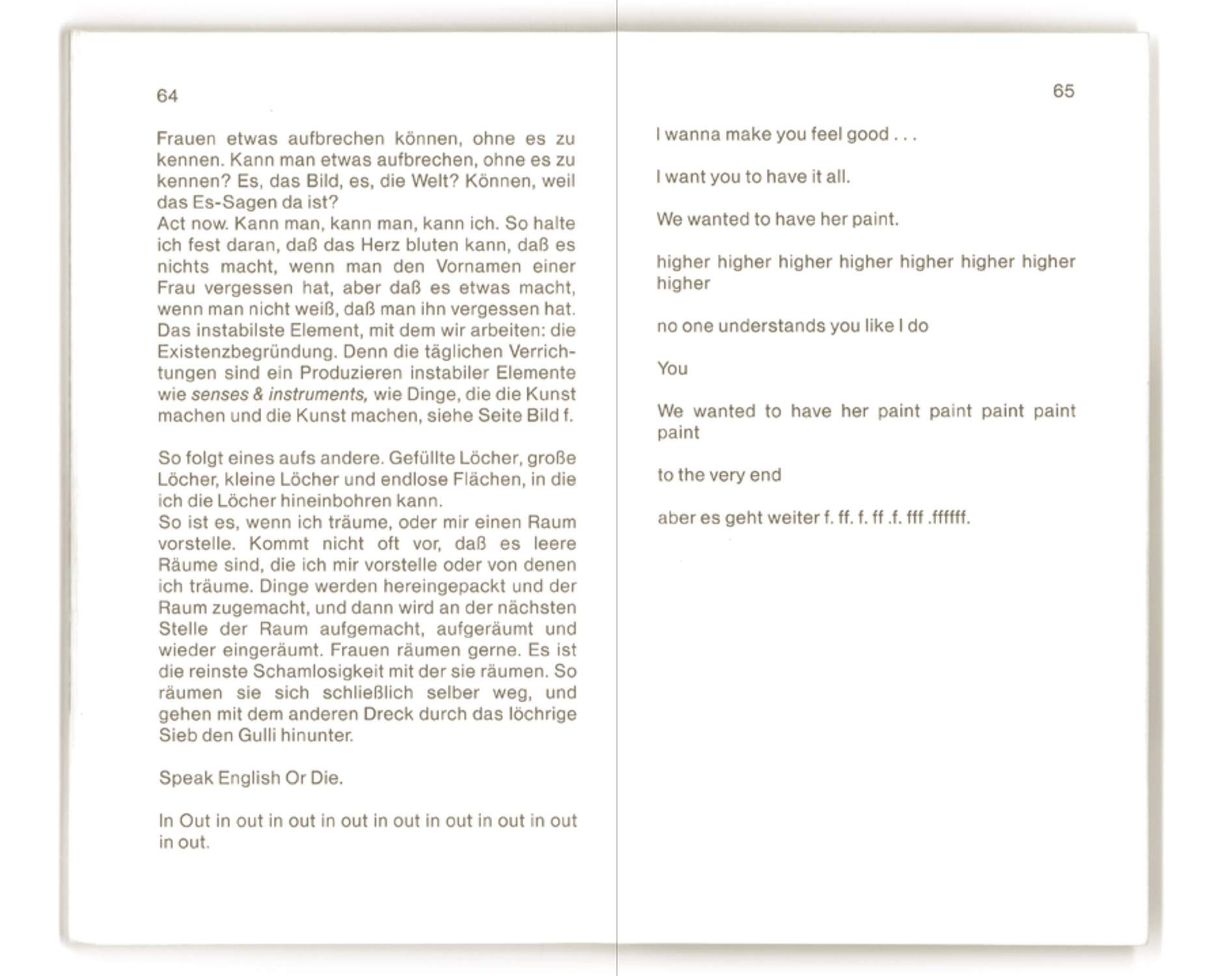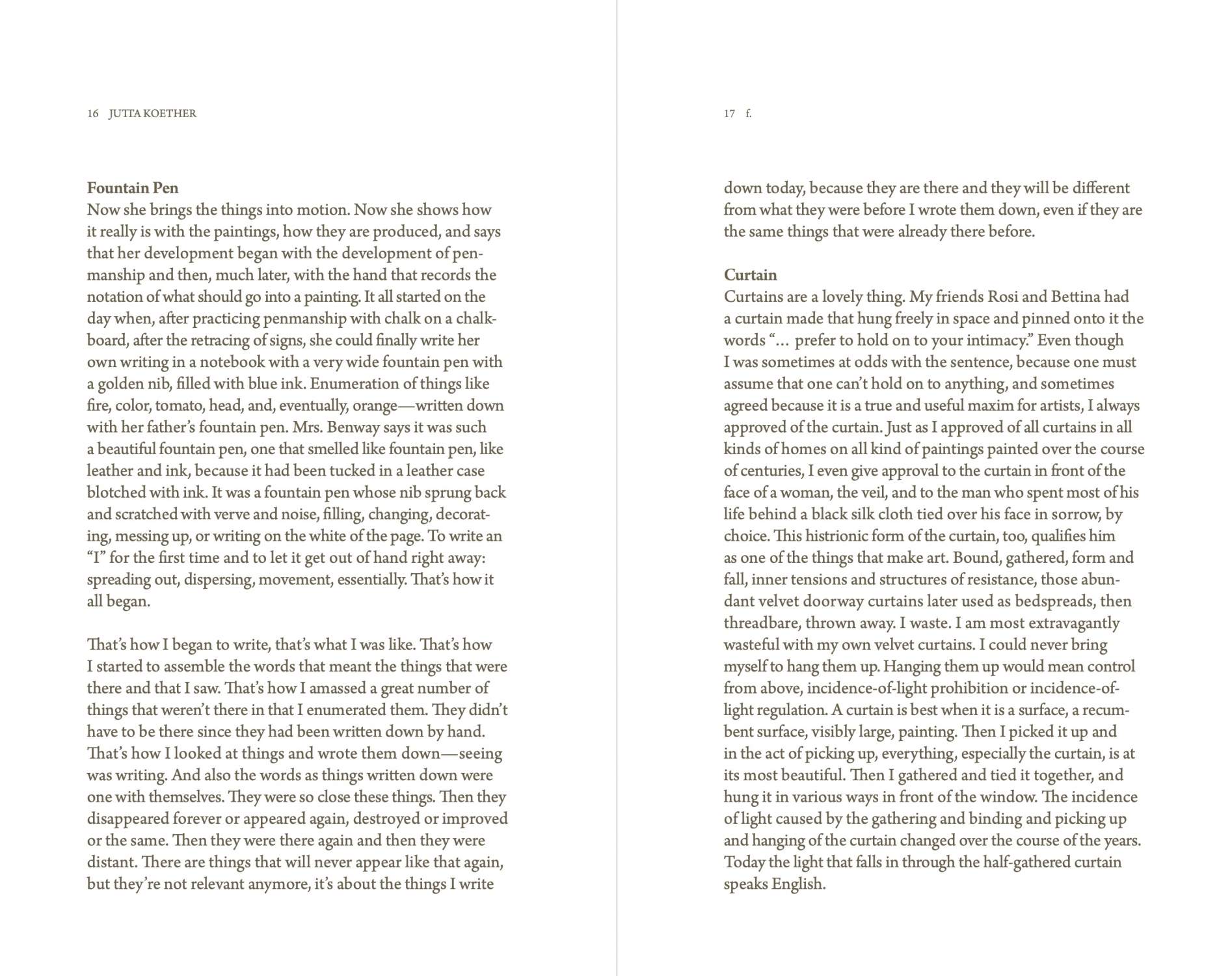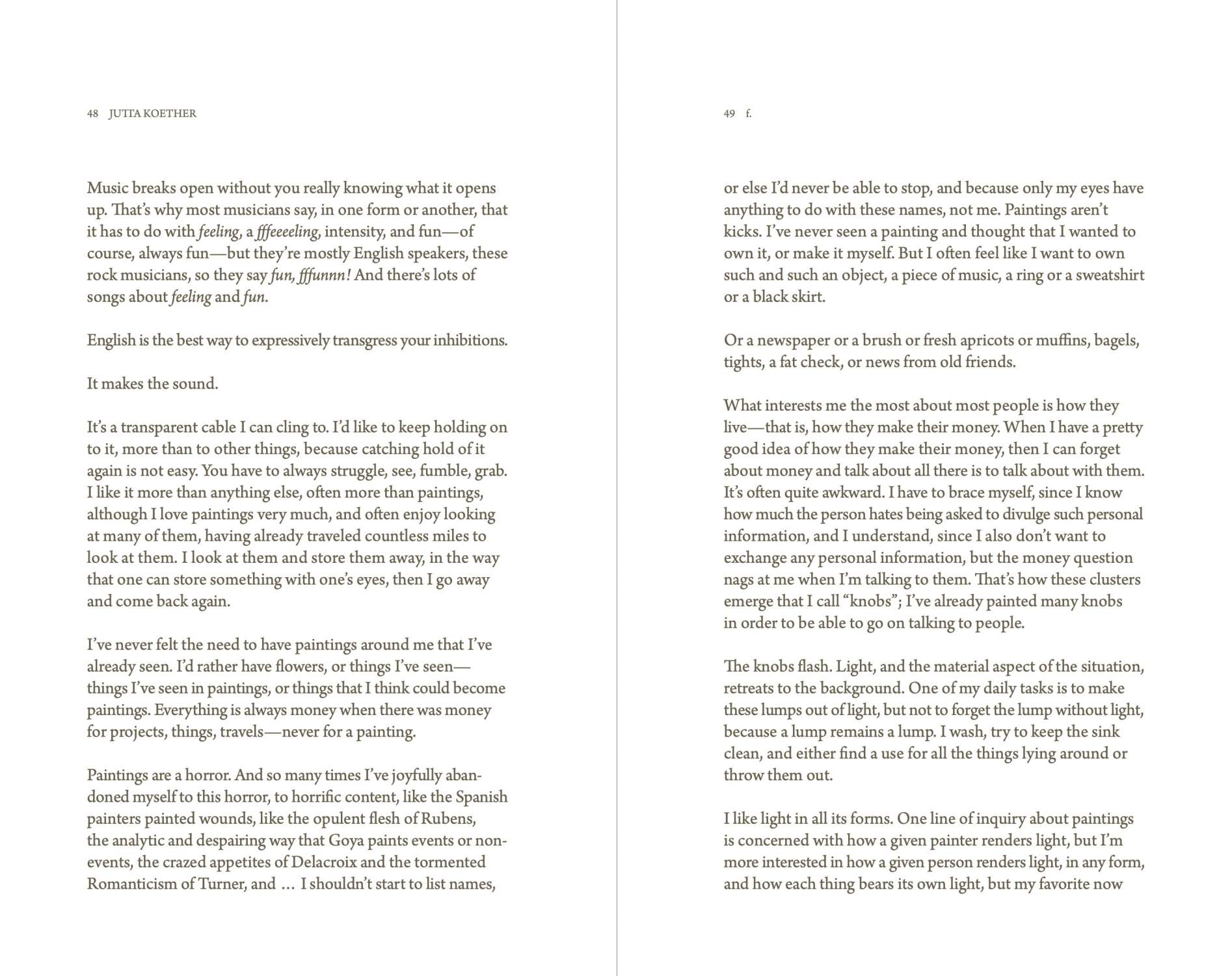 First published in German in 1987, this is artist and writer Jutta Koether’s meditation on painting. In novella form, f. follows several disembodied female characters as they consider velvet, coral, the curtain, money, color, red. These objects, these things, help the narrator and other characters come into being, but it is paintings that embody who the narrator really is: “Even if I’m their hostage when I look at them, I’m not inferior to them. I lie down, stand, or sit in front of them and, in this moment, I’m everything they affect in me.” Unlike people, paintings are fixed, explicit with their intentions and challenges—in the end they will still be here, outlasting those who made them or who looked at them. A facsimile of the original German publication is included in this volume.