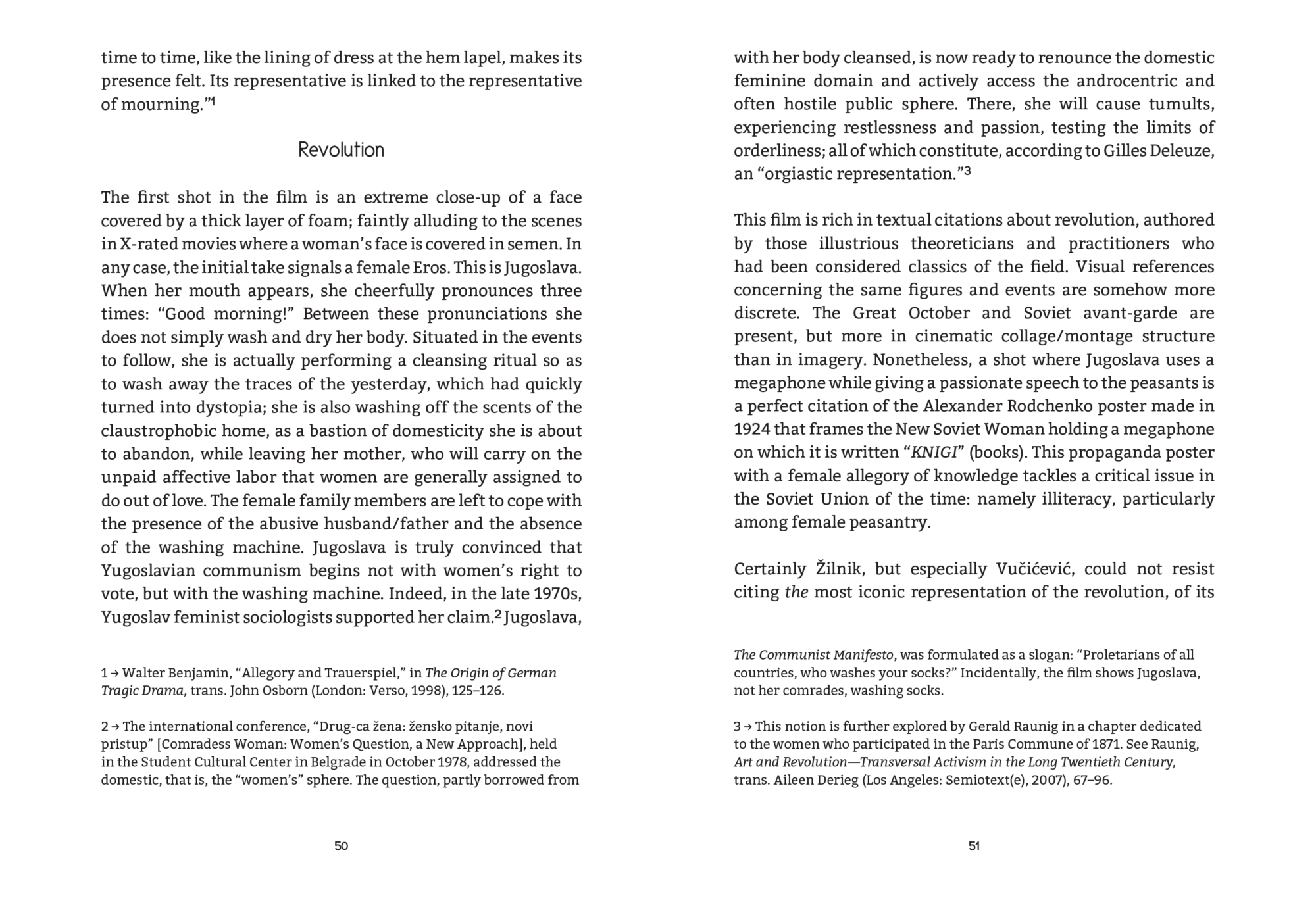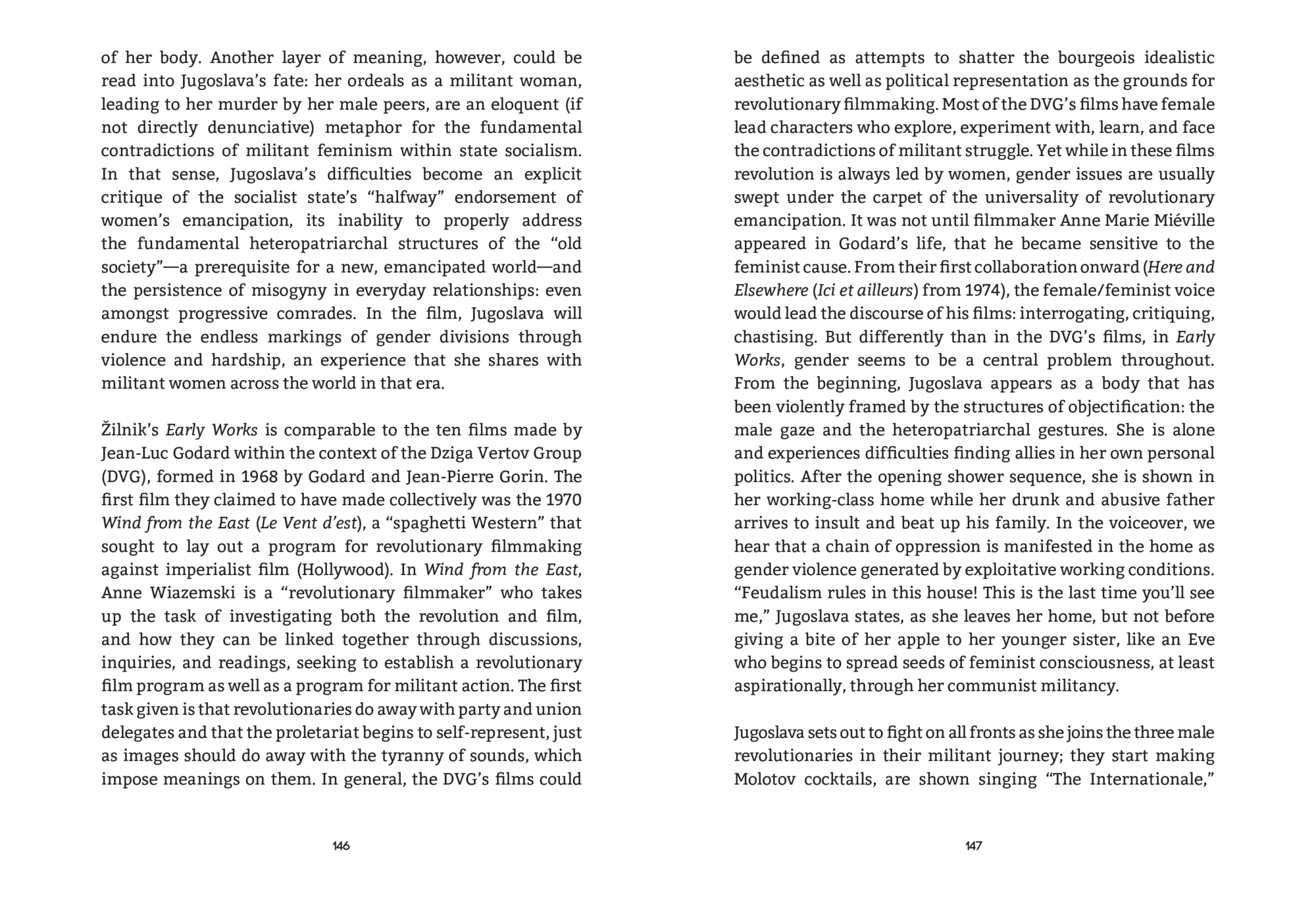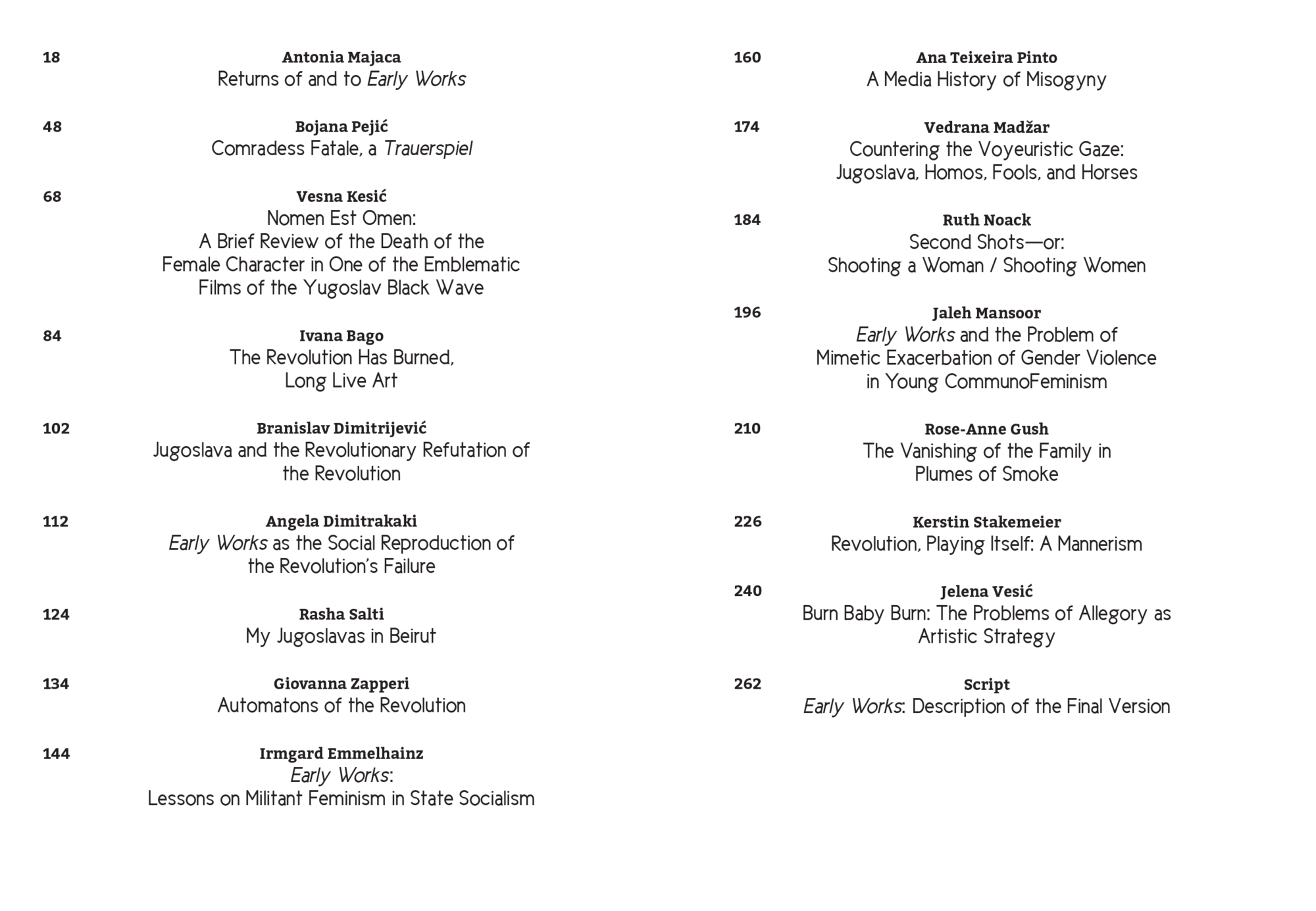 Canonical within the Yugoslav New Film of the late 1960s and the 1970s, Želimir Žilnik’s Early Works (1968) follows the female revolutionary Jugoslava as she leaves her lumpenproletariat family to spread the teachings of young Marx and Engels among the peasants and factory workers. The violent responses to this proselytizing mission, which include the rape of Jugoslava and the beating of her three male comrades, invoke the repression of the 1968 student movement in socialist Yugoslavia. The film’s allegorical examination of the contradictions of Yugoslav state socialism culminates when Jugoslava becomes the object of her comrades’ violence, who shoot her and set her body on fire. This edited volume, a part of Antonia Majaca’s ongoing collaborative investigation Feminist Takes, initiates a discussion of the filmic—and historical—fate of Jugoslava and the prospects of revolutionary feminism.