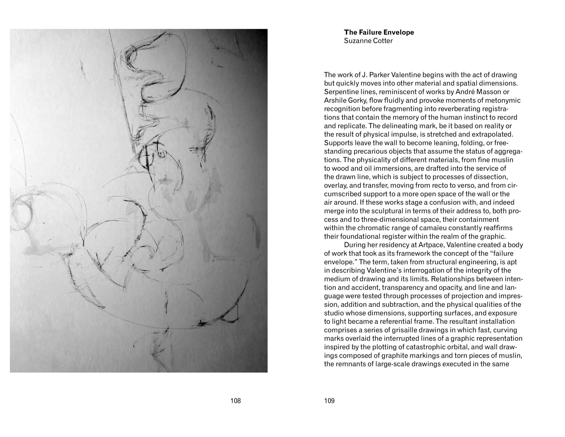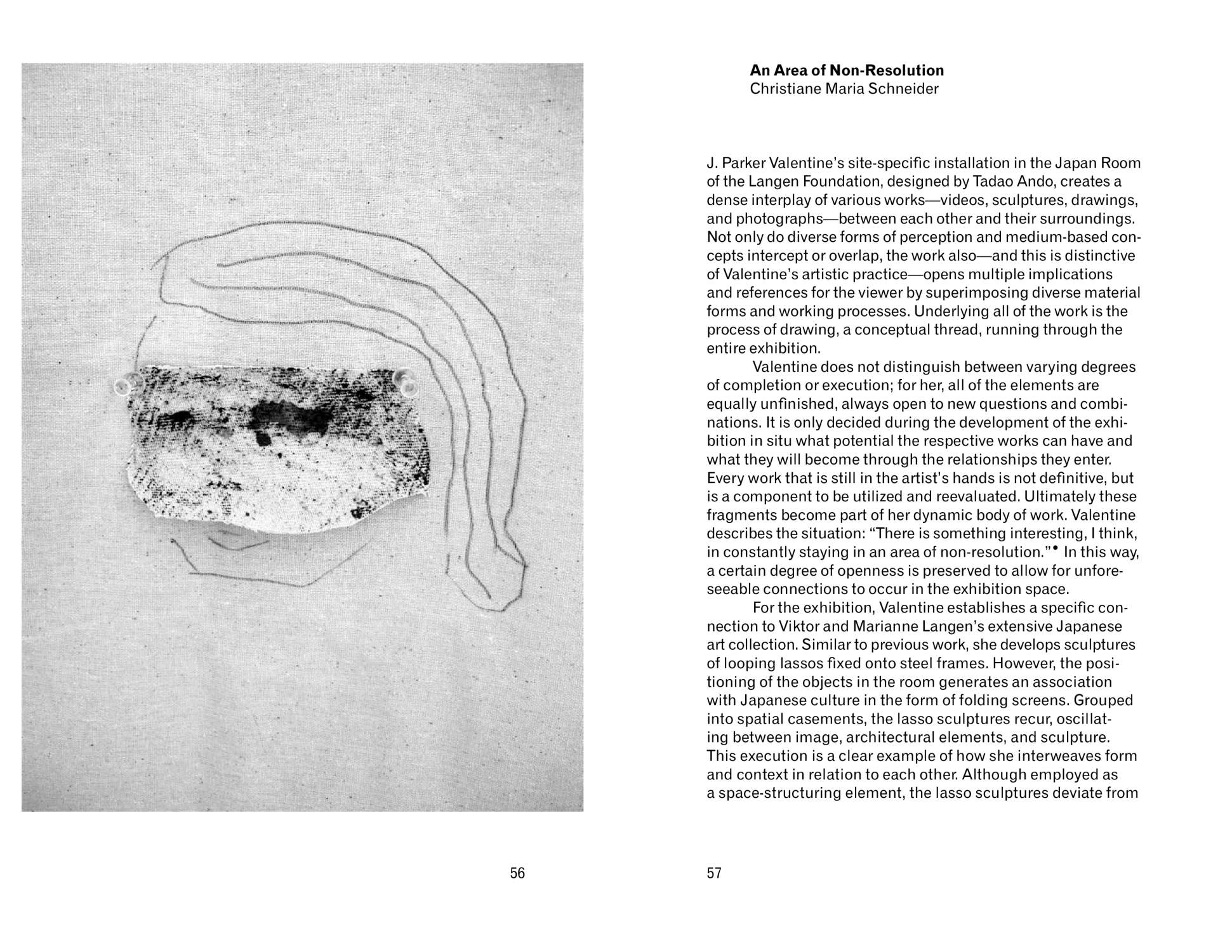 This artist book includes a selection of images—a documentation of exhibited works and those in process—that offer a sense of Valentine’s approach to working, which gestures toward abstraction and improvisation. For this book, many images have been adapted, reoriented, and/or manipulated. Also included are three essays that investigate Valentine’s process, considering work that has emerged from her previous projects, residencies, and exhibitions to date. Mary Ceruti’s essay describes Valentine’s lasso sculptures as oscillating between drawing and sculpture, and discusses the suggestive narratives that play out in sculptural space. Suzanne Cotter touches on Valentine’s interrogation of the integrity of the medium of drawing and its limits, as well as the transformative nature of her work, as eluding any static reading. Describing the development of Valentine’s work in situ, Christiane Maria Schneider considers how each of the works presented are affected by the relationships they enter into, continually moving between the material and immaterial.