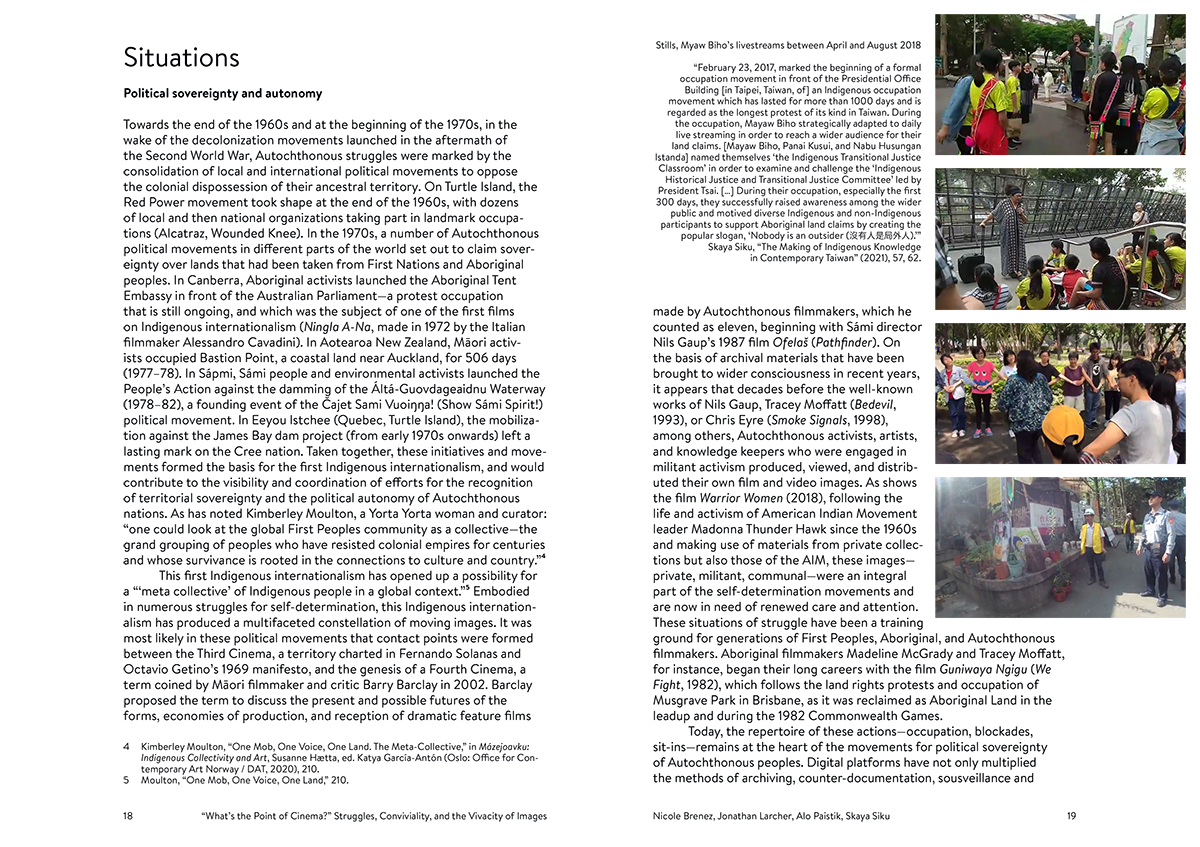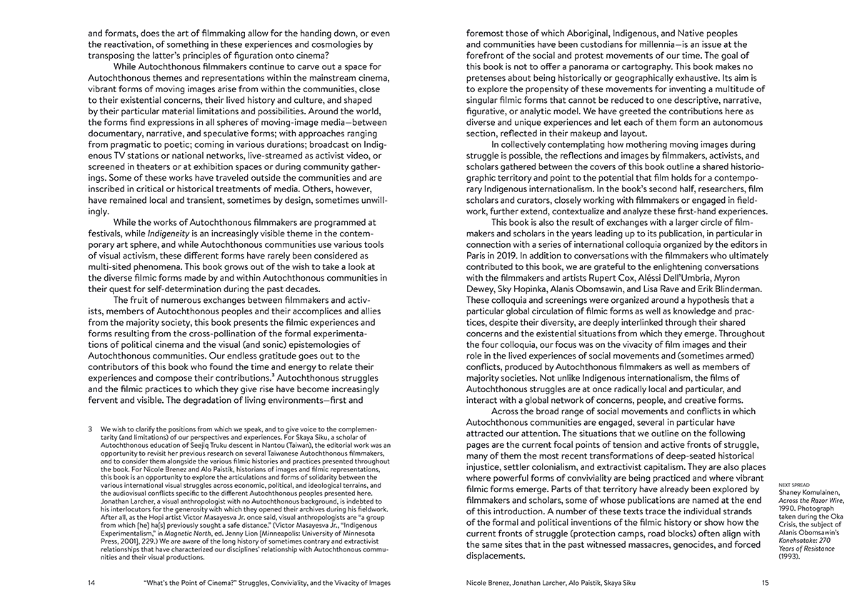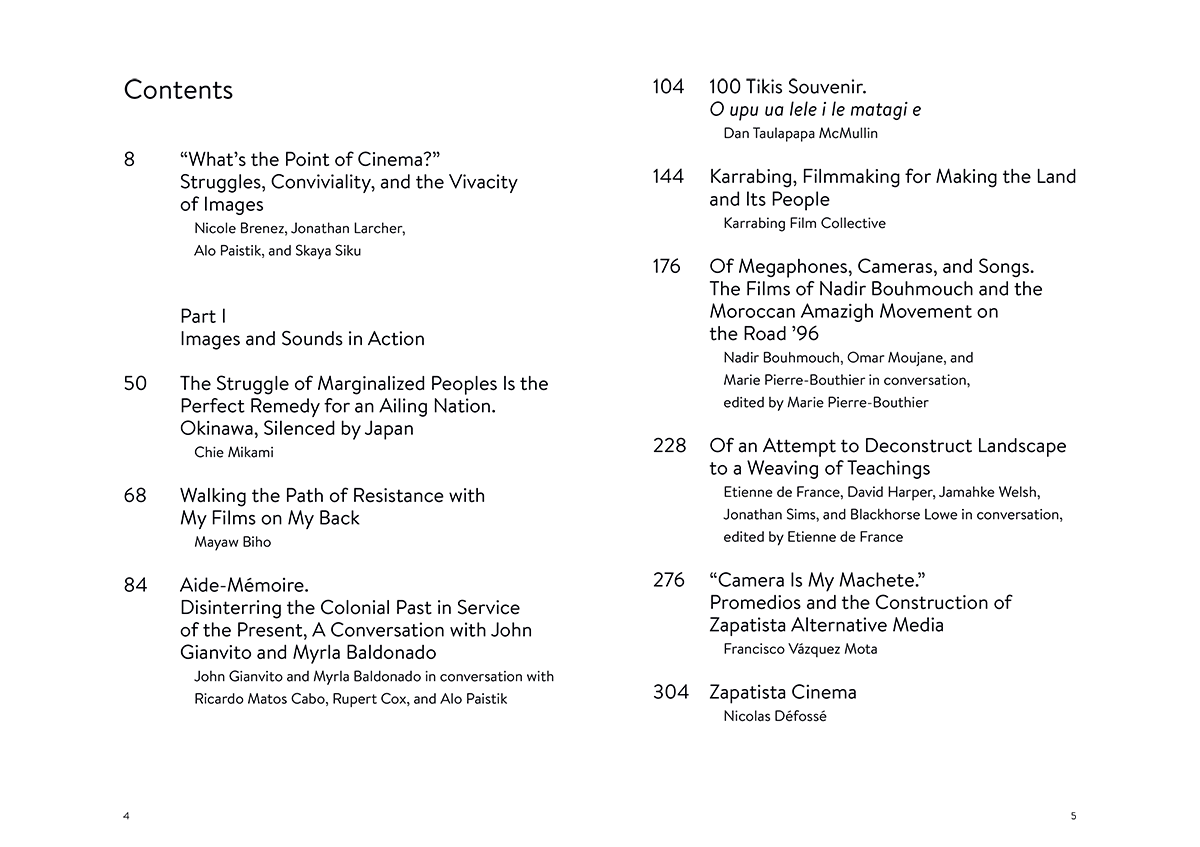 Along with the vibrant forms of moving images arising from within the communities, close to their existential political concerns, filmmaking has also become a potent tool in Autochthonous struggles. This book answers the need to take a global look at the diverse ways of filmmaking that fight for land rights and against environmental injustice (Brazil, Morocco, Taiwan, USA), that resist neocolonial domination, economic and political exploitation (Japan, Philippines), that offer a counterpoint during low intensity or drawn-out armed conflicts (Colombia, Mexico), that invent strategies of counter information and representation (Australia, Canada, Russia, Samoa), and that strive for visibility.