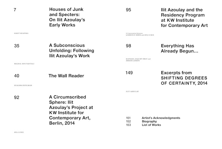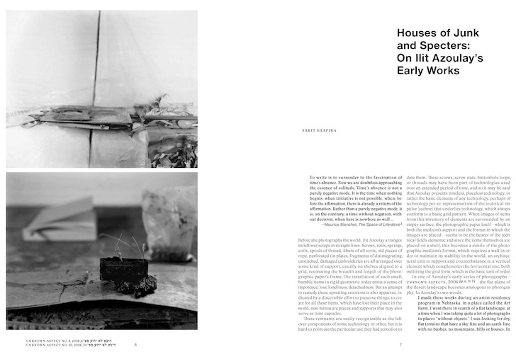 In addition to her photographs, this publication offers a variety of perspectives on Azoulay’s practice. Sarit Shapira describes the artist’s 2008 series “Unknown Aspects” as an elevation of cultural debris to the level of representation, while Michal Ben-Naftali offers a psychoanalytic reading of Azoulay’s uncanny images. Shalom Shpilman explores the viewer’s participation in the artist’s visual realm of significance. Curators Aya Lurie (Herzliya Museum of Contemporary Art, Israel) and Gabriele Horn (KW Berlin) meditate on two concurrent exhibitions of some of the work featured in this book. Azoulay’s photographs, as one essay describes, are events-in-progress—forever unfolding and forestalling conclusion.