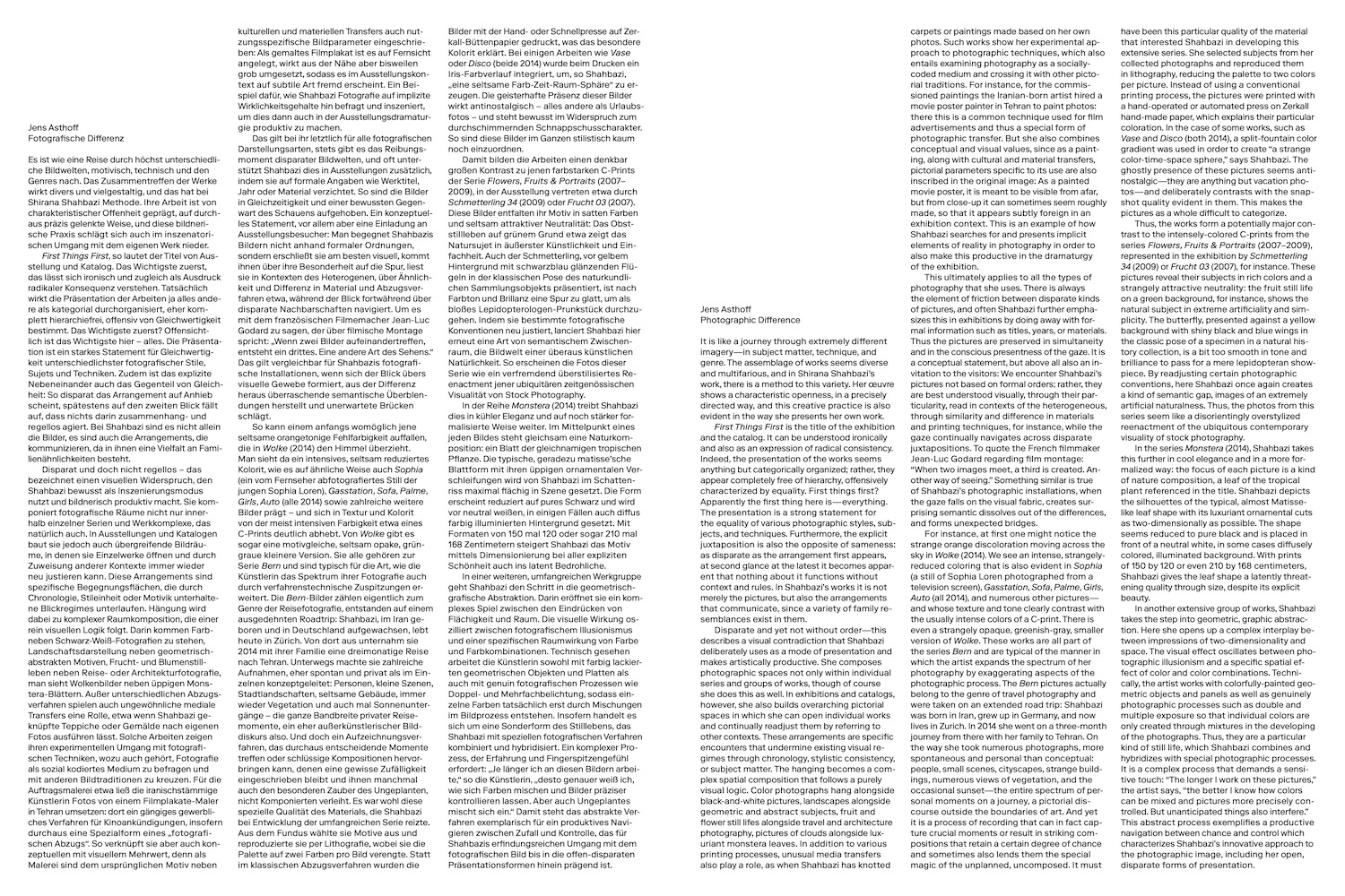 This book is published on the occasion of Shirana Shahbazi’s exhibition “First Things First,” curated by Andreas Fiedler, at KINDL – Zentrum für zeitgenössische Kunst, April 2–August 6, 2017.